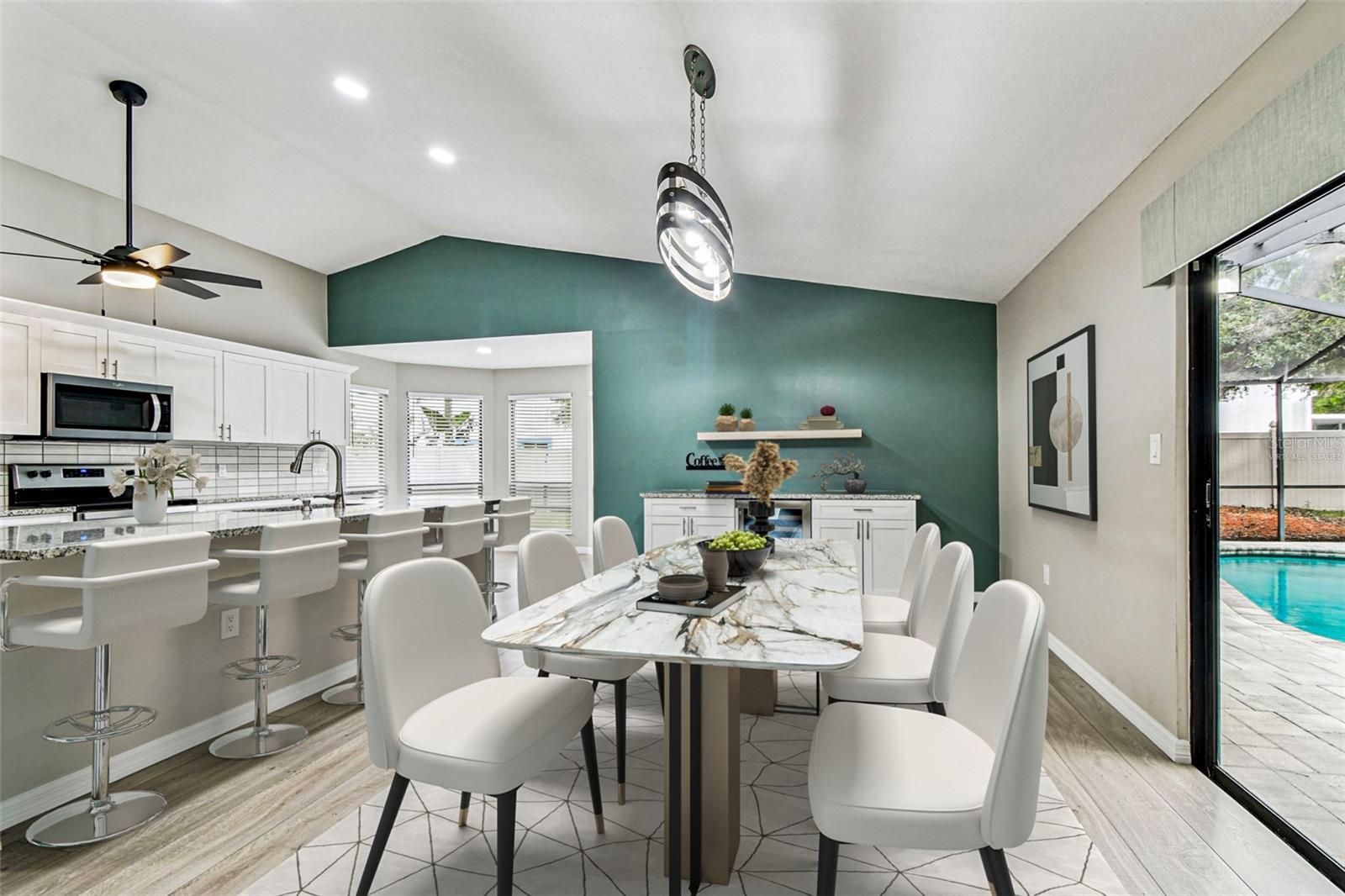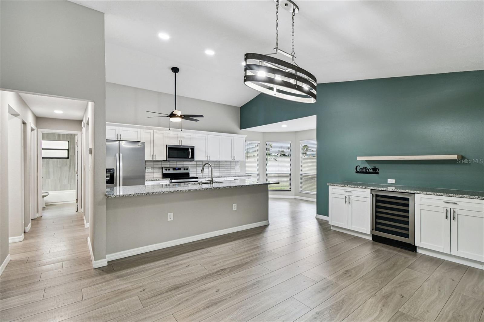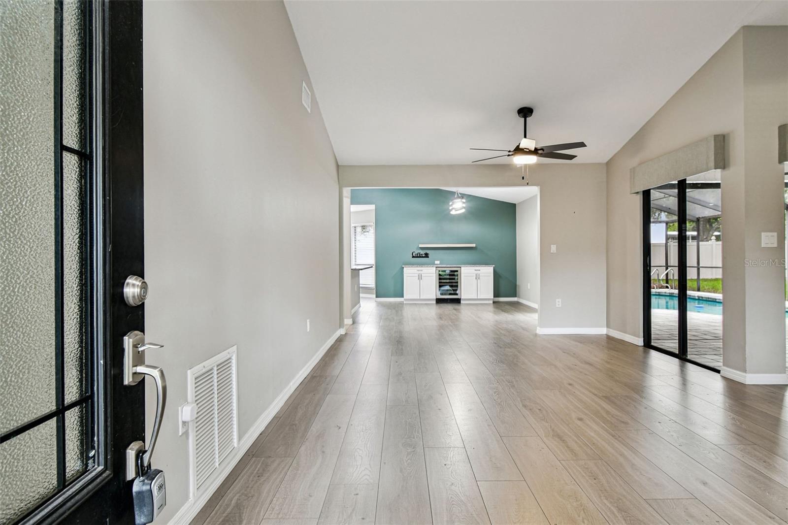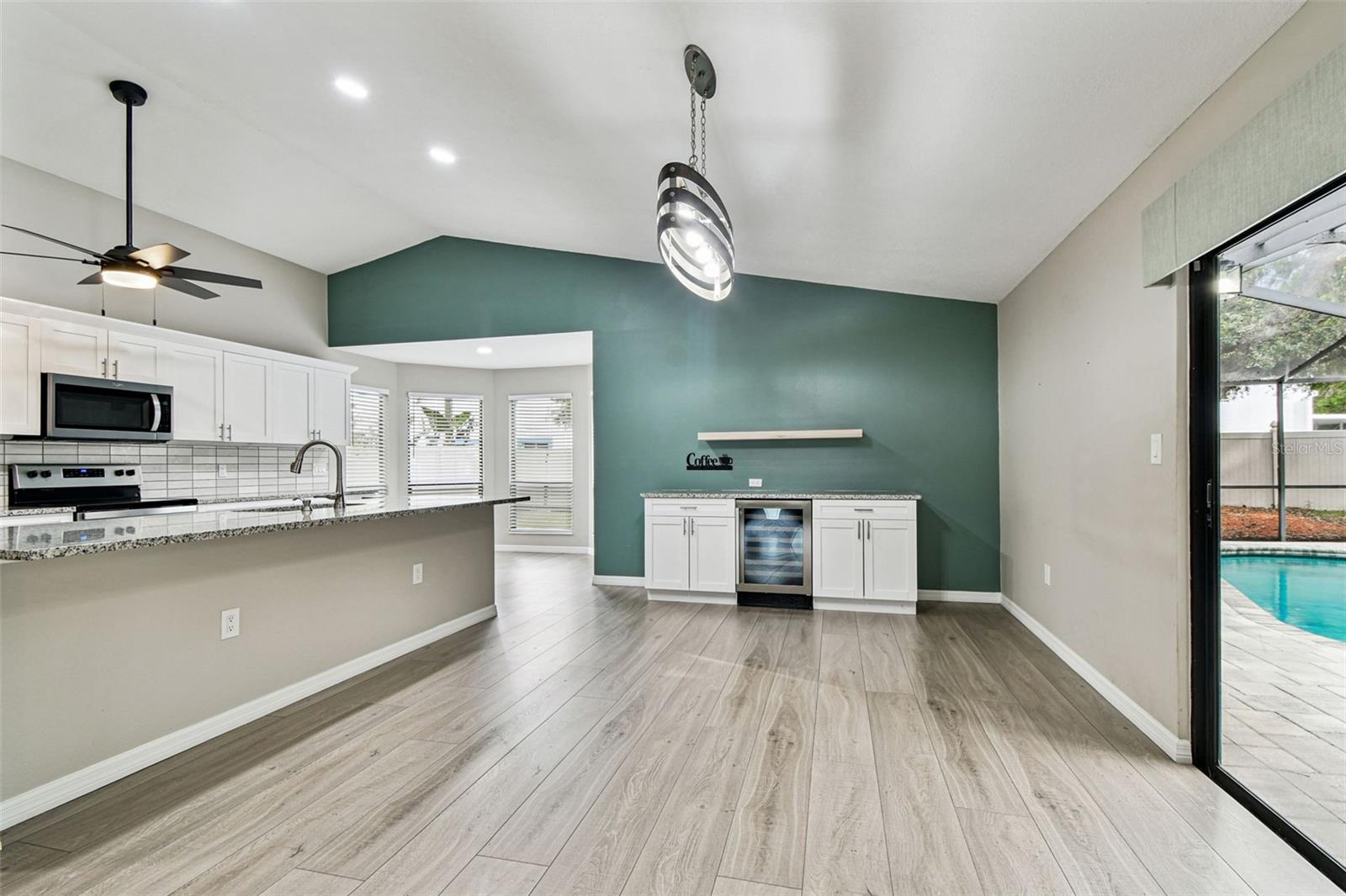 One or more photo(s) has been virtually staged. Stunning home in Crystal Beach Estates, fully remodeled just 2 years ago! Features include a new roof with transferable warranty and no flood insurance required. Enjoy the screen-enclosed in-ground pool with newly refinished surface, fresh pavers, and upgraded patio drainage. Inside, the open split floor plan boasts vaulted ceilings, luxury vinyl flooring, and all-new fixtures and ceiling fans. The modern kitchen showcases stainless steel appliances, custom soft-close wood cabinets, granite countertops, and a convenient wine/coffee bar perfect for entertaining. Both bathrooms have been beautifully updated, while the master suite offers a walk-in closet. Unique upgrades include a laundry room with custom dog wash station and pull-out steps, a quality vinyl fence, whole home R.O water filtration system and fresh landscaping. Located on a quiet street with no deed restrictions and zoned for top-rated schools.