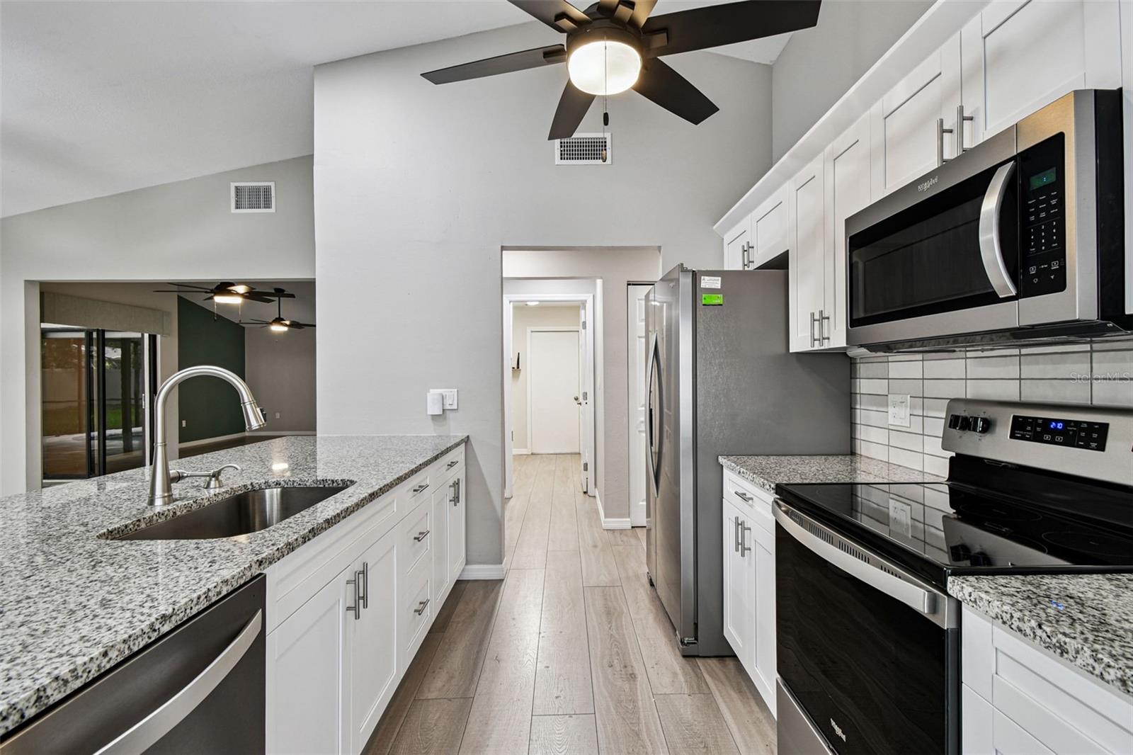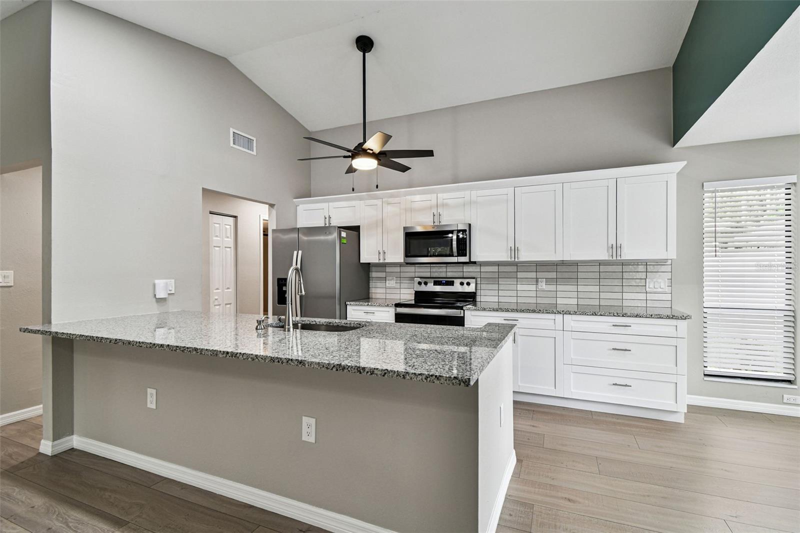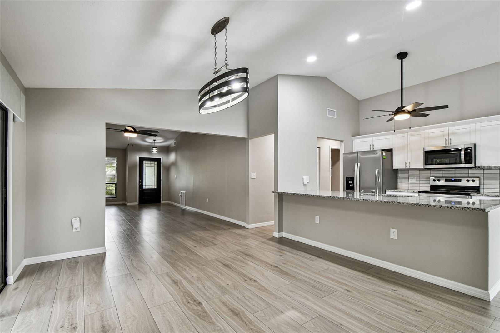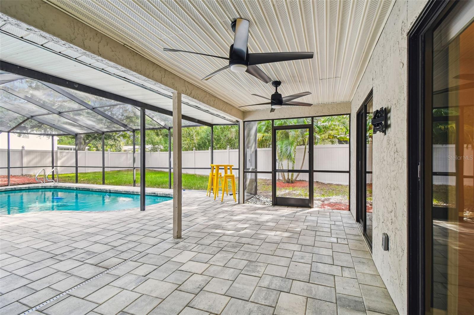 One or more photo(s) has been virtually staged. Stunning home in Crystal Beach Estates, fully remodeled just 2 years ago! Features include a new roof with transferable warranty and no flood insurance required. Enjoy the screen-enclosed in-ground pool with newly refinished surface, fresh pavers, and upgraded patio drainage. Inside, the open split floor plan boasts vaulted ceilings, luxury vinyl flooring, and all-new fixtures and ceiling fans. The modern kitchen showcases stainless steel appliances, custom soft-close wood cabinets, granite countertops, and a convenient wine/coffee bar perfect for entertaining. Both bathrooms have been beautifully updated, while the master suite offers a walk-in closet. Unique upgrades include a laundry room with custom dog wash station and pull-out steps, a quality vinyl fence, whole home R.O water filtration system and fresh landscaping. Located on a quiet street with no deed restrictions and zoned for top-rated schools.