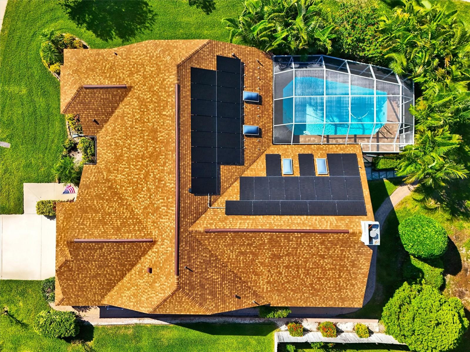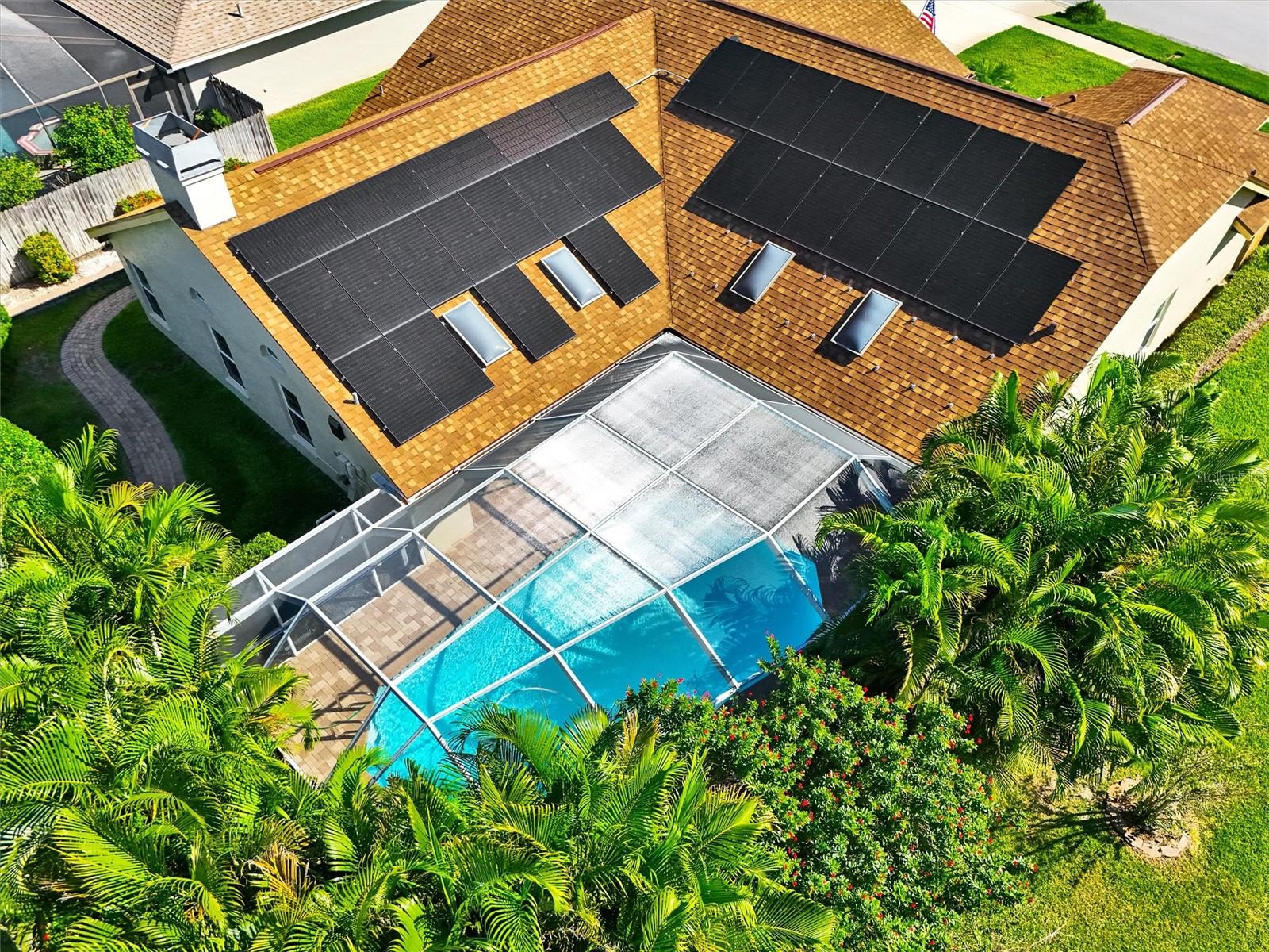 Experience refined yet relaxed Florida living in this warm, classic 3-bedroom, 2.5-bath pool home in Palm Harbor’s coveted Waterford Crossing, where timeless style meets thoughtful, big-ticket, eco-conscious upgrades. Set on a beautifully landscaped 0.28-acre corner lot, this 2,495 sq ft residence feels inviting from the moment you arrive, with a double-door entry, soaring cathedral ceilings, rich hardwood floors, and sunlit spaces that favor character and comfort over the usual stark white-and-grey trends. The updated kitchen is the natural gathering spot, with granite countertops, solid wood cabinetry, stainless-steel appliances, and a center island that flows into a welcoming great room anchored by a classic brick fireplace—perfect for cozy evenings in or easy entertaining. French doors or sliders from nearly every common area and the primary bedroom provide access to the resort-style screened pool and patio, complete with paver decking and covered lounge areas. The reclaimed-water irrigation system that was recently overhauled to keep the lush landscaping looking its best with less effort and lower cost. Behind the scenes is where this home really stands out: in 2025, UV light was added to the HVAC system to enhance indoor air quality, followed by a fully owned whole-house solar system in 2024, a new roof, EV charging station, new HVAC ductwork, new attic insulation, fresh interior and exterior paint, new window treatments, and new door hardware in 2023, a 2019 HVAC system, a 2018 water heater, and 2014 impact-resistant windows and doors—all working together to improve comfort, efficiency, and long-term peace of mind. The spacious primary suite offers two walk-in closets and a recently remodeled bath with new (January 2025) granite counters and wood vanities, while the guest bath received the same elevated finishes. Fresh finishes throughout preserve the home’s warm, classic aesthetic while making it feel truly move-in ready. All of this is just minutes from the Pinellas Trail, Dunedin Causeway, and Honeymoon Island, so beach days, bike rides, and sunset walks can become an easy part of everyday life in this special Palm Harbor home.