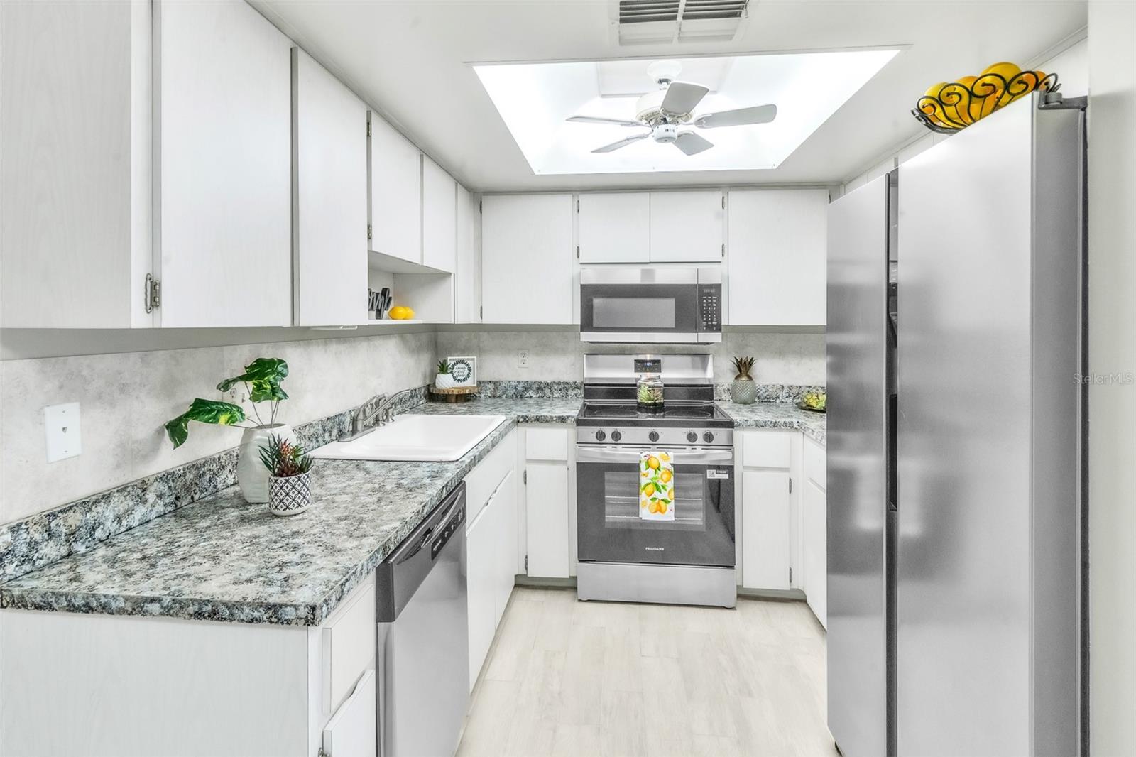 One or more photo(s) has been virtually staged. New Price: $213,900!!!!! This charming corner-unit villa in the sought-after Highland Lakes 55+ Community offers 2 bedrooms, 2 bathrooms, and 918 sq ft of single-level living. Features include a brand-new roof (2025), new tile floors throughout (no carpet), stainless steel appliances, and updated bathrooms with new toilets and vanities. Freshly painted and move-in ready, it boasts an open floor plan connecting the living, dining, and kitchen areas, perfect for relaxing or entertaining. Additional highlights include a 1-car garage with extra storage, screened lanai, modern hallway light, HVAC (2022), water heater (2023), and a high-elevation location in a non-evacuation, non-flood zone with no storm damage. Enjoy your morning coffee or evening drink on the enclosed front lanai overlooking landscaped grounds, or cruise the neighborhood in your golf cart. Resort-style amenities include Lake Tarpon access with pontoon rides, 3 nine-hole executive golf courses, clubhouse activities, a heated Olympic-sized pool with whirlpool spa, tennis, bocce, shuffleboard, and more. With year-round social events and proximity to Honeymoon Island, top medical facilities, and shopping, this low-maintenance condo is perfect for downsizing, a seasonal getaway, or your next adventure.