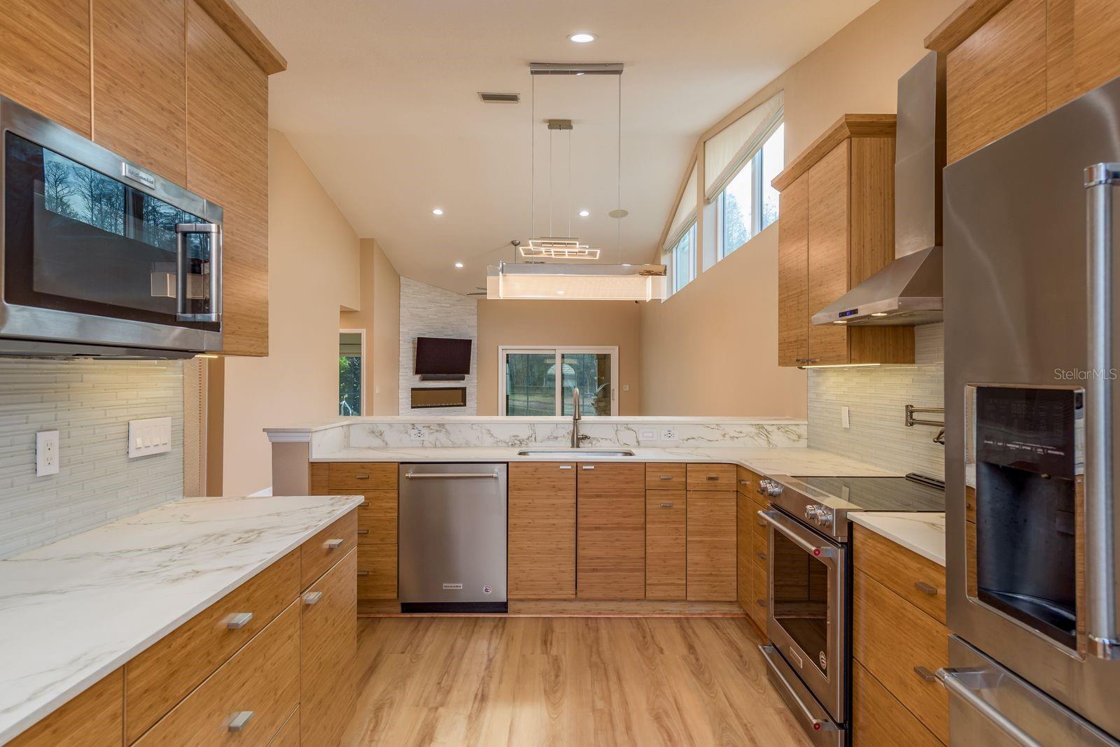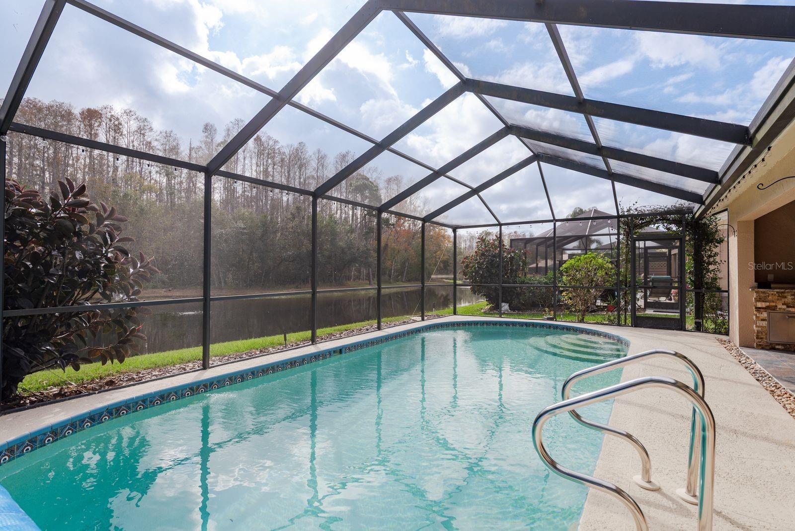 One or more photo(s) has been virtually staged. Welcome to this beautifully upgraded home located in the gated & maintenance-free community of Chattam Landing in Ridgemoor, offering tranquil views of a pond and surrounding conservation. This totally renovated residence offers peace of mind and modern comfort with a tile roof (2020), hurricane-force impact windows and sliding doors (2020), and HVAC system (2021) and hot water heater replaced in 2023. Step inside to find luxury vinyl flooring throughout (2020), electric window shades in the living and dining areas, and thoughtfully selected high-end lighting fixtures and ceiling fans. The updated kitchen (2019) is a standout featuring Dekton countertops, custom bamboo cabinetry, KitchenAid appliances, and a convenient pot filler. The living room is enhanced with Bose surround sound speakers, perfect for entertaining or relaxing at home by the beautiful and functional electric fireplace. The primary bathroom (pool bath) has been tastefully updated with gorgeous cabinetry and a large walk-in shower. The guest bathroom has also been tastefully renovated to include a jetted tub for spa-like comfort. Enjoy true Florida outdoor living in the screened solar-heated pool area complete with a custom outdoor kitchen (2020) and phenomenal views of the pond & conservation backdrop. Additional features include a new washer and dryer (2025), replumbed piping throughout (2020), whole-house water filtration system, plantation shutters, updated pool pump and custom closets. Residents of Ridgemoor enjoy low HOA fees and access to community amenities including tennis courts, playgrounds, and basketball courts and is conveniently located near shopping, dining, lake-front parks, top-rated schools, and just a short drive to award-winning Gulf beaches and the Pinellas Trail. This move-in-ready home offers the perfect blend of luxury, comfort, and location.