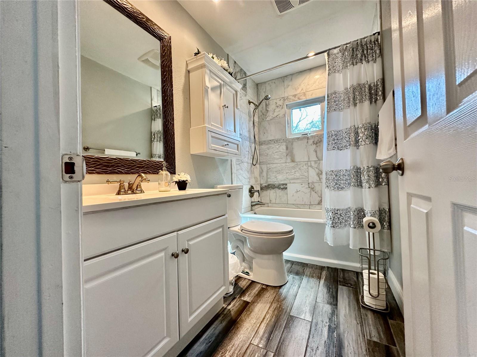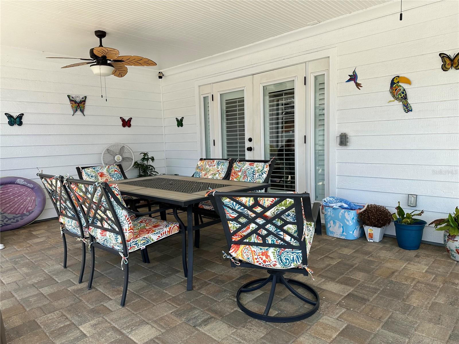 This remodeled home features an open floor plan, spacious rooms, and neutral colors to suit any style. Its quaint front porch enhances this home’s curb appeal. The living area offers a cozy feel, highlighted by vaulted ceilings, a wood-burning fireplace, French doors opening to a 2000 sq ft paver deck, a recently updated pool, resurfaced and retiled (2018), and a charming pergola. In 2017, laminate flooring and tile were popular choices. Massive backyard, .27-acre property enclosed by vinyl fencing (installed in 2020). Many of the features are listed here....renovated kitchen and granite counters, stainless steel appliances (2017) with an added large granite island, includes slide in range and storage space, plantation shutters 2020, windows (2017 hurricane rated ) and doors 2017, New front storm door (2023), New water heater (2023) newer light fixtures and fans both interior and exterior, oversized primary bedroom, primary ensuite has large dual vanity, renovated walk-in shower with upgraded shower fixtures, walk-in closet has John Louis closet system installed, on the opposite side of the home, there are 2 appointed spare bedrooms with walk-in closets and remodeled second bathroom. This home is equipped with an AC unit (2018), a roof and insulation (2017), and an attic radiant barrier to enhance insulation. A large circular paved driveway (installed 2019), LP SmartSide siding (2017), and gutters protected by Leaf Filter are the many highlights of this property. Abundant natural light enhances the home’s appeal.