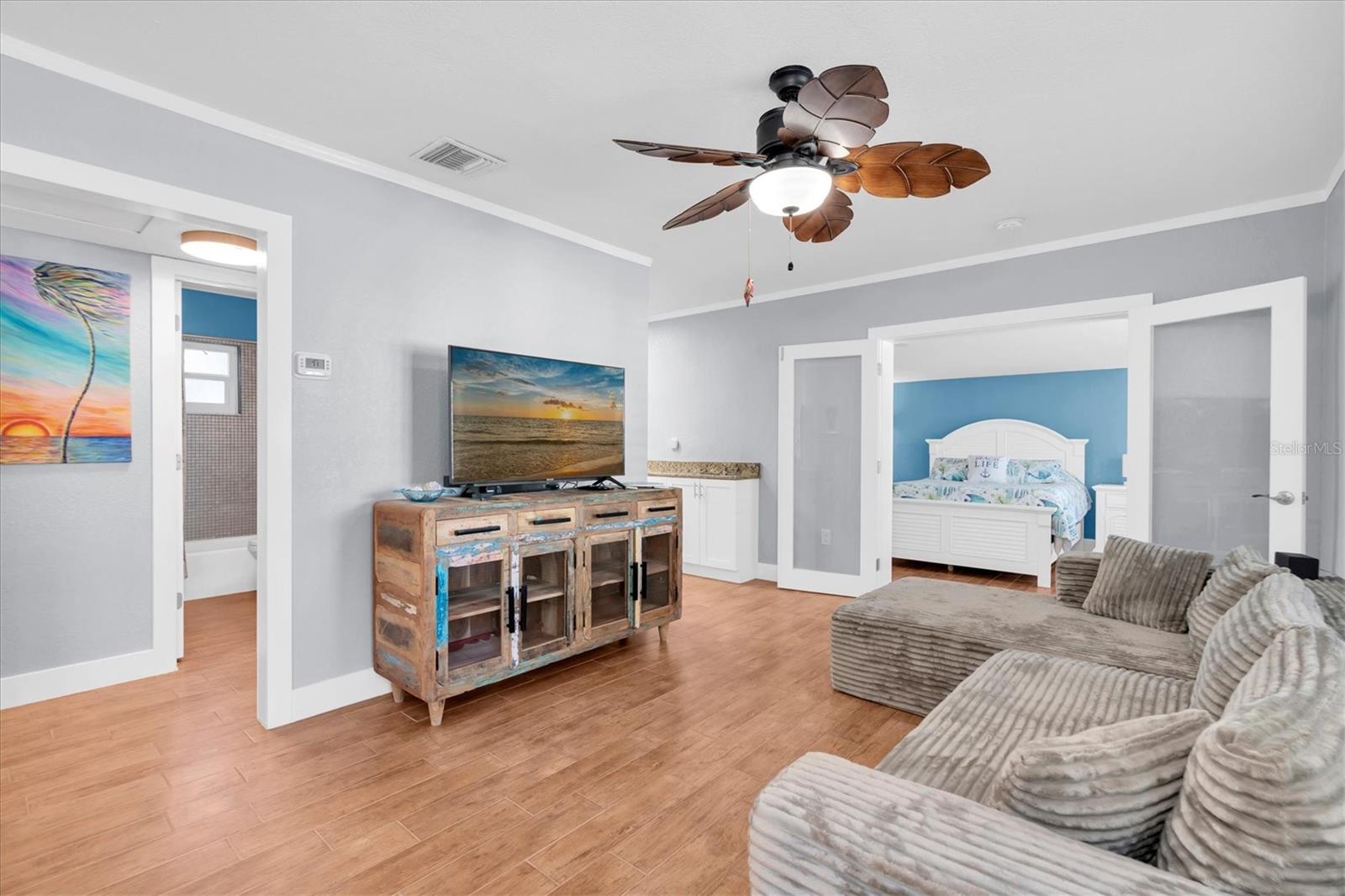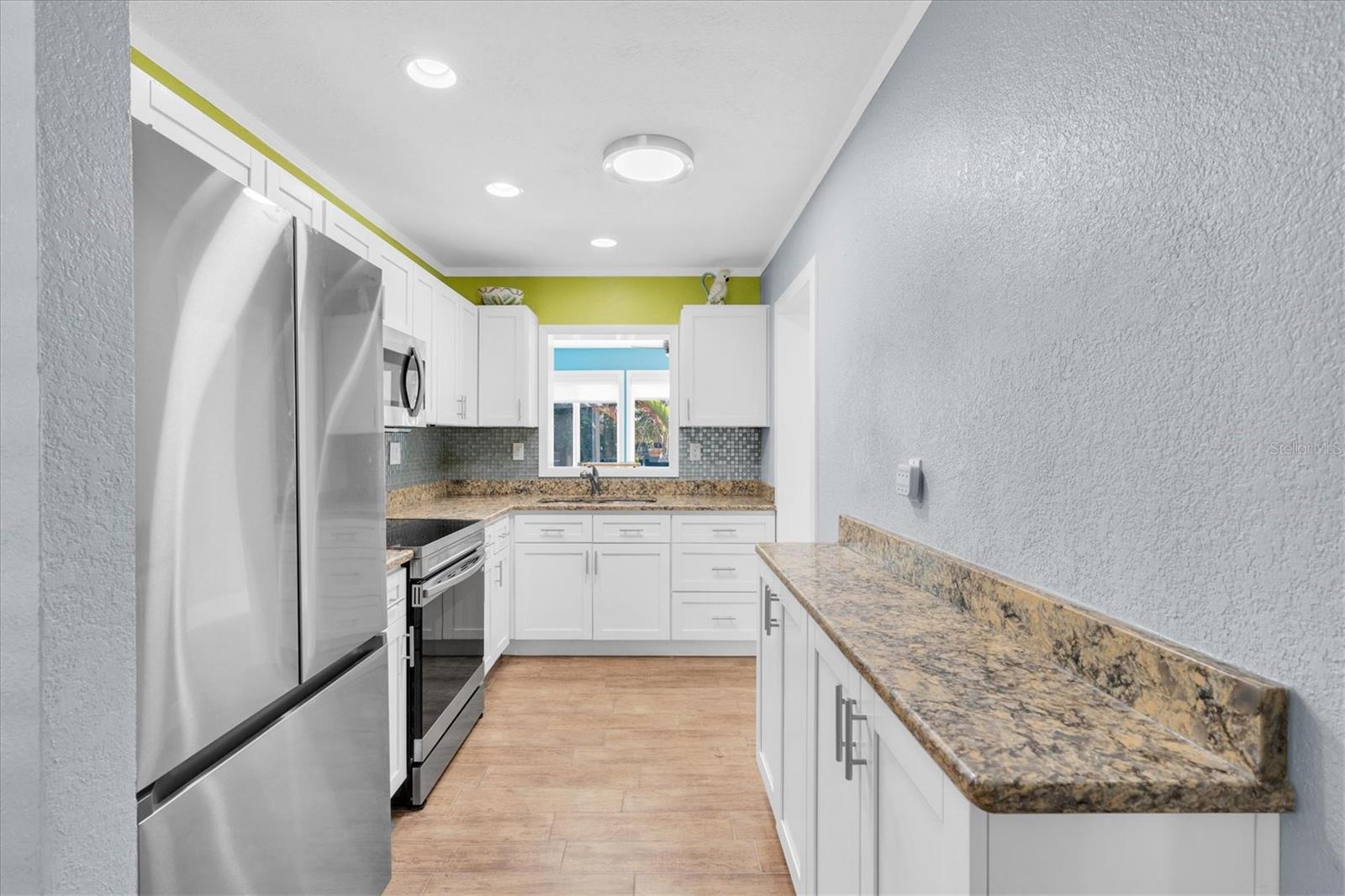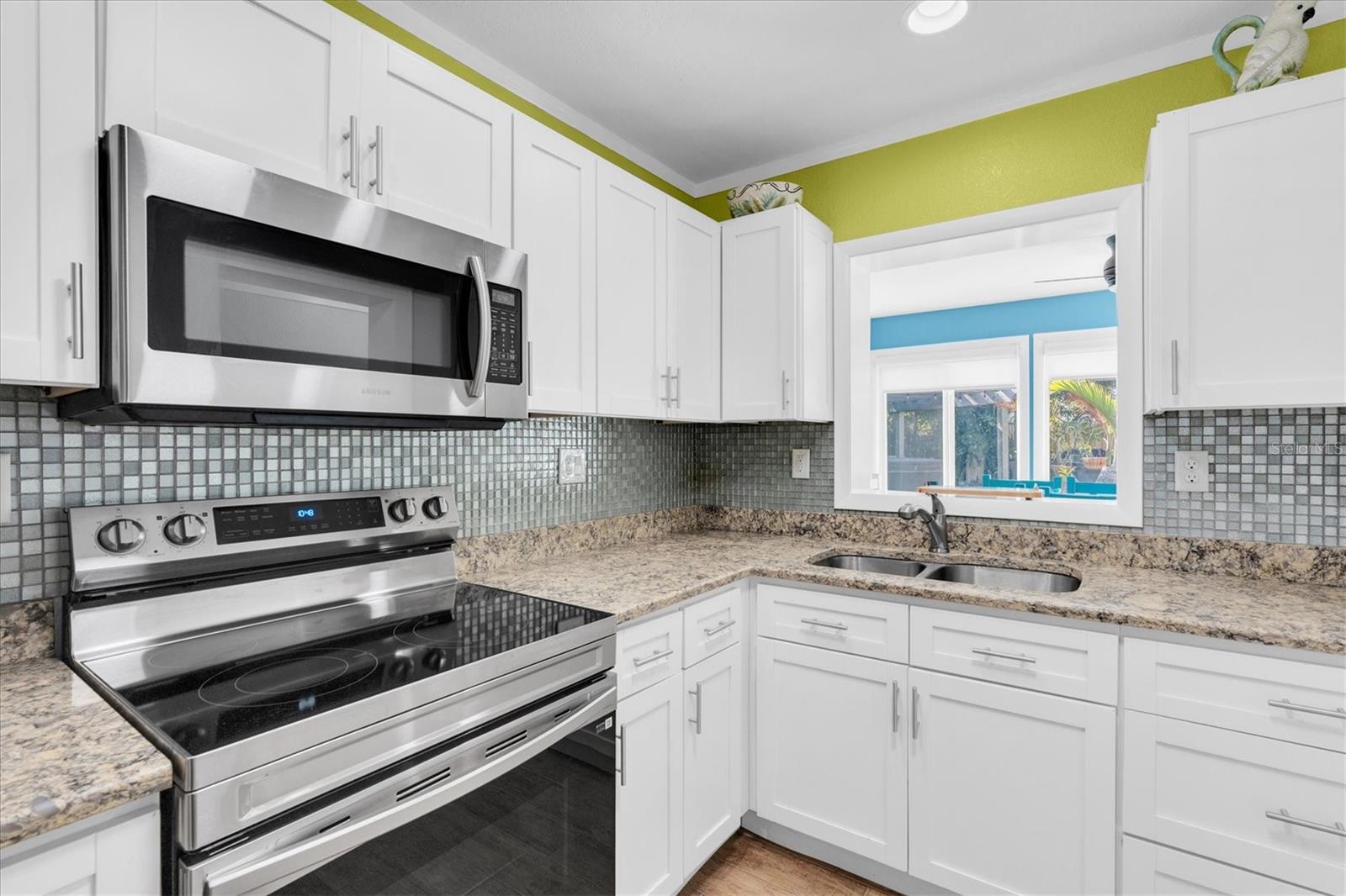 Welcome to your Crystal Beach tropical oasis! This beautiful modern updated bungalow includes three-bedrooms and two updated baths. The home has a thoughtfully designed living space, and is truly move-in ready and ideal for those who love indoor and outdoor living. Step inside to a bright and airy layout featuring a modern kitchen with granite countertops, stainless steel appliances, and white soft close shaker cabinets. The open living area has plantations shutters and flows seamlessly into the bedrooms, while the updated bathrooms include a stunning tiled shower that adds a touch of spa-like luxury. Wood-look tile flooring throughout enhances both style and durability. Your primary bedroom is large and has an En-suite bath with a laundry room conveniently located in the en-suite bath. The true highlight of this home is the tropical backyard retreat. Enjoy lush landscaping, a pergola-covered hot tub, a spacious patio perfect for outdoor dining, and a fenced yard offering privacy and relaxation. The detached structure includes electricity and a mini-split A/C system with sound absorbing wall, creating a versatile bonus space ideal for a musicians area, media room, she shed, man cave, home office or to convert to a mother in law. The a/c unit was literally just replaced and elevated. Crystal beach is a family friendly community with top rated schools , plenty of parks and playgrounds. Crystal beach has the laid back "old Florida" feel, very dog friendly, and the 47 mile Pinellas Trail runs through the city which is popular with Cyclists and walkers. Yes it is also Golf cart friendly, so come and enjoy a sunset and community gatherings. You will love Honeymoon and Caladesi Island. You will love your new home, book your showing now!