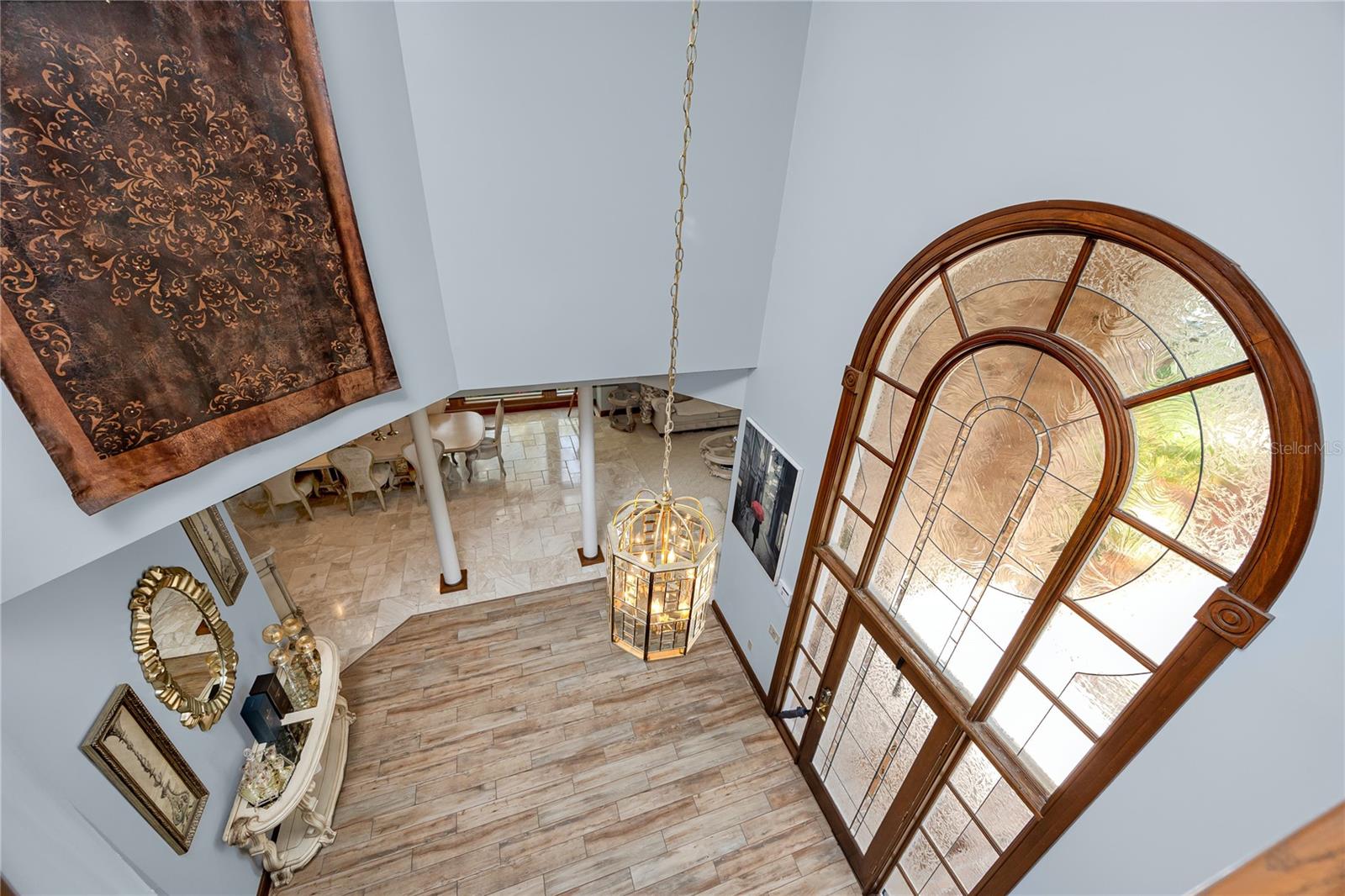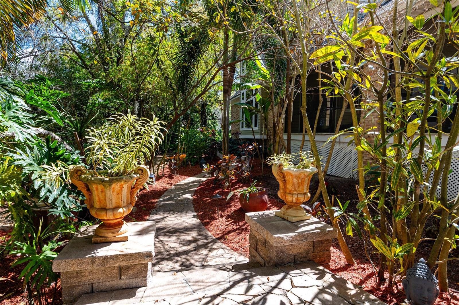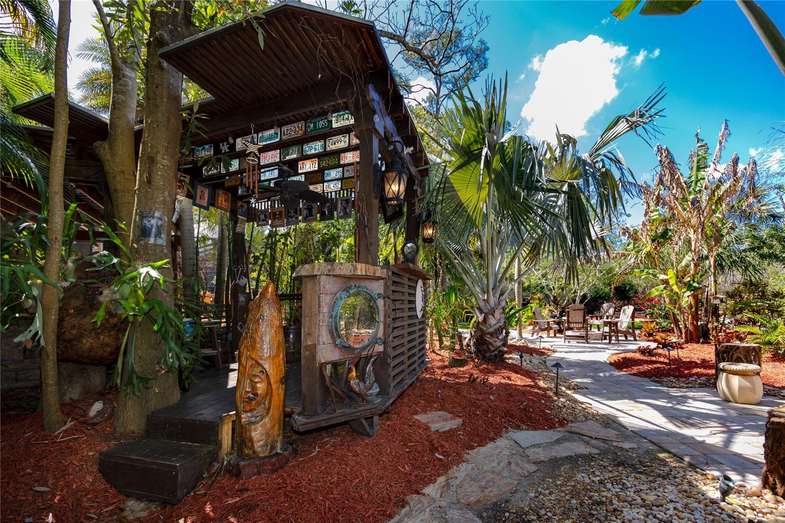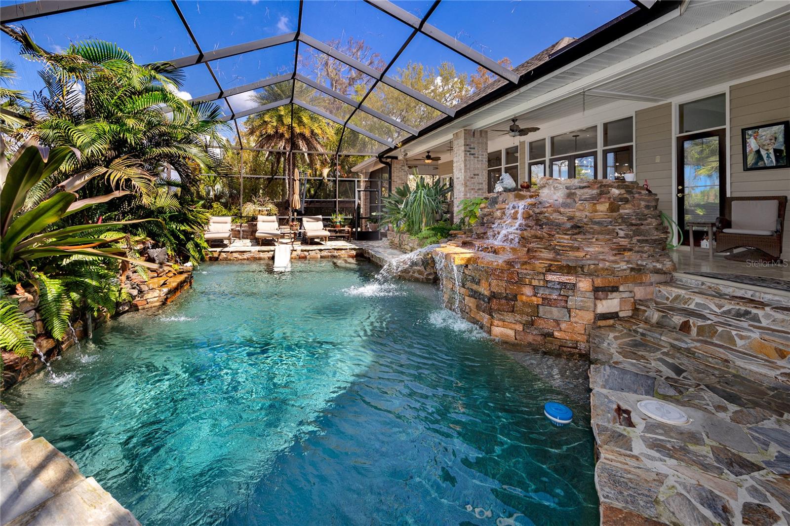Golf View Estates is a quiet, cul-de-sac pocket of Palm Harbor where oversized lots back to conservation land. This property sits on three-quarters of an acre and grounds that function less like a backyard than a private botanical resort. The outdoor entertaining complex is designed at a scale rarely found in residential Pinellas County. Terraced stone patios connected by illuminated paver walkways create multiple distinct zones: a covered wraparound lanai with travertine floors and ceiling fans across its full span, a custom outdoor kitchen with built-in stainless grill, warming drawers, prep sink, stone cabinetry, and granite counters, a fire pit terrace framed by curved stone retaining walls with recessed uplighting, and a substantial wood-beam pergola — large enough to host a live band — strung with Edison lights above its own dedicated gathering floor. The full complex comfortably accommodates 150 or more guests across its layered levels. Landscape lighting runs throughout: uplighting through the canopy of mature palms and tropicals, low path lights along every walkway, and ambient light embedded in the stonework that makes the grounds as compelling at night as they are at noon. The heated pool anchors the screened enclosure, centered on a hand-stacked stone waterfall grotto surrounded by tree ferns and bromeliads. A newer concrete seawall edges the conservation pond beyond. Flood insurance comes out to under $100 a month. Inside, the home is 4,342 heated square feet across two floors, built of brick and ICF construction. The formal living and dining areas open the first floor with cathedral ceilings, crown molding, and rich wood doors with crystal and brass hardware throughout. Nearly every room orients toward the conservation and pool grounds outside. The kitchen is a considered split layout: solid wood cabinetry, granite countertops, a cooking island, dual breakfast bars, and a breakfast nook with a built-in granite-topped desk. A secondary dishwasher serves the wet bar, and a serving window connects directly to the screened lanai. The family room anchors the center of the home with a gas fireplace and custom built-in shelving, and five sets of French doors open to the wraparound rear deck, creating an indoor-outdoor flow that reads as intentional rather than incidental. The first-floor primary suite is positioned well away from the main living areas, with pool and garden views, a solid wood built-out walk-in closet with an integrated organizational system, and a garden tub ensuite featuring split vanities, and a separate oversized walk in shower. A dedicated office with built-in closet sits adjacent on the first floor. Upstairs, two bedrooms each carry oversized walk-in closets — one with a window seat and dedicated makeup vanity — plus a full bath and an open loft currently used as a home gym, equally suited as a library or second living space. A three-car side-entry garage sits behind an oversized circular drive for privacy and accommodating guests. Roof and HVAC replaced in 2023. Pool heater new in 2026. No HOA. Minutes from the Pinellas Trail, Dunedin's waterfront, and Honeymoon Island State Park, with both Tampa International and St. Pete-Clearwater Airport within approximately 30 minutes.