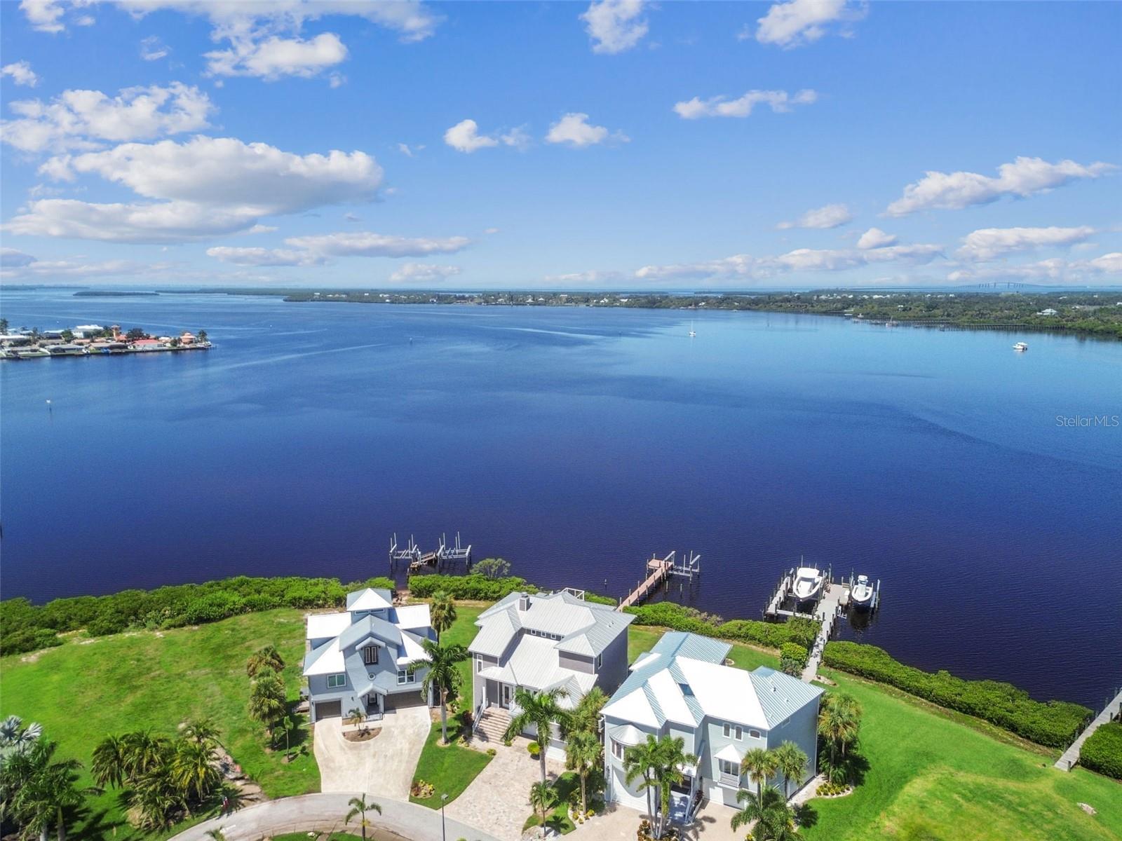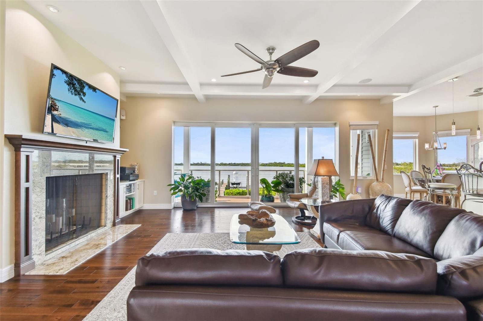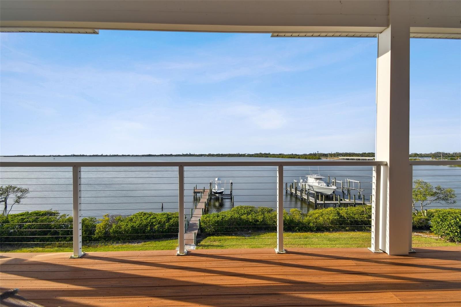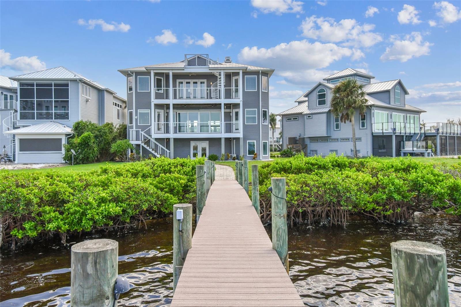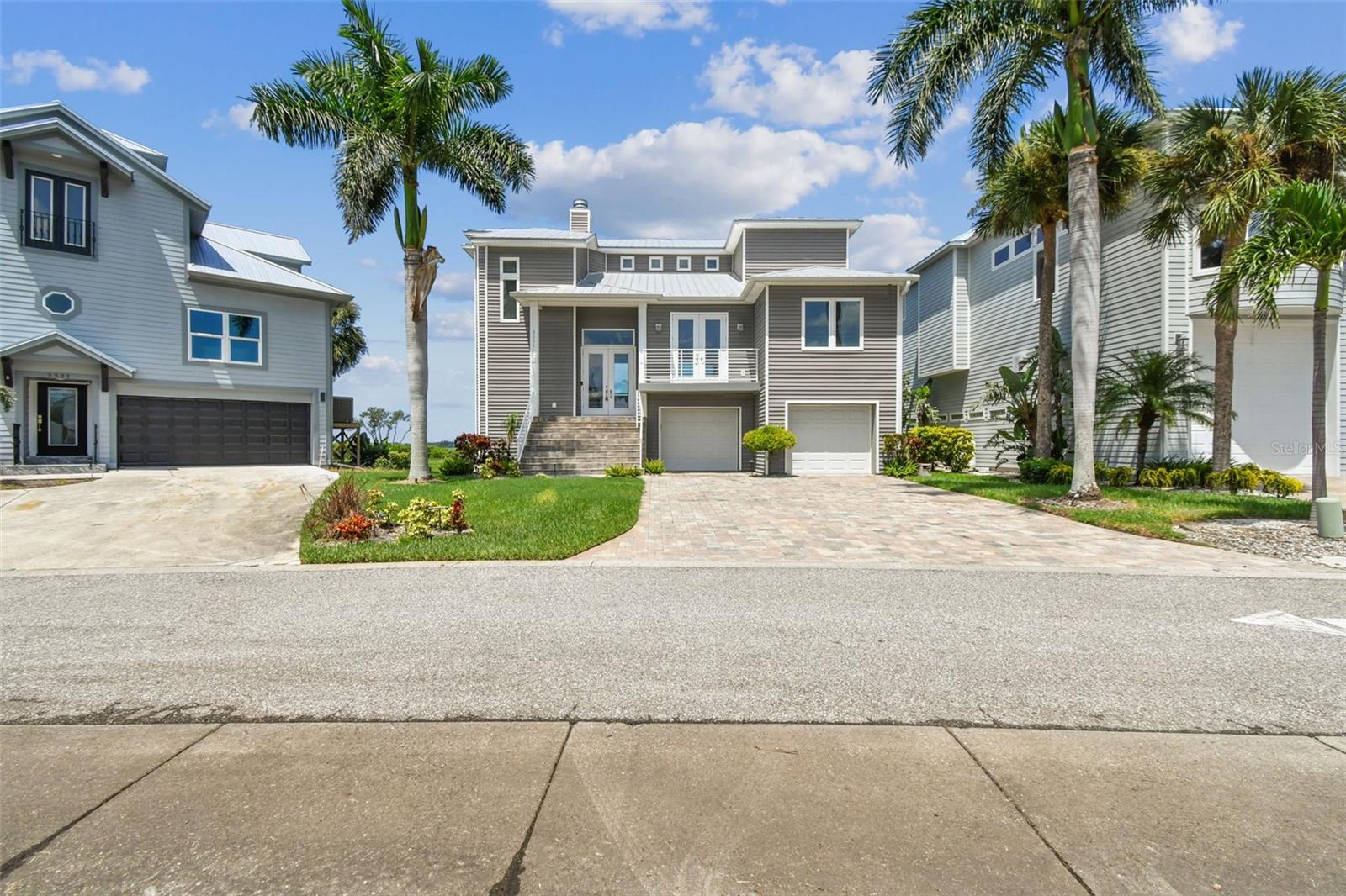 Experience breathtaking sunsets every evening from your custom-built, modern Key West-style waterfront home in the exclusive, gated community of Terra Ceia Bay Estates, featuring only ten residences. Arrive by boat via Tampa Bay's open waters to your private 90-foot dock with a 10,000 pound boat lift, or park in your expansive five-car garage equipped with ample storage. An elevator conveniently takes you to any of the home’s three levels. The mid-level main entrance welcomes you to an open-concept living area with stunning 180° water views, showcased through disappearing four-panel pocket sliding glass doors. The living room boasts a spacious wood-burning fireplace with a custom wood mantle, granite hearth, and built-ins, all beneath soaring 10-foot coffered ceilings with in-ceiling Bose surround sound speakers. These high ceilings continue throughout the home, complemented by ¾-inch solid Acacia hand-scraped hardwood floors, along with marble and travertine tile accents in the kitchen and bathrooms. The gourmet kitchen is a chef’s dream, offering a large walk-in pantry, granite countertops, under-cabinet and valance lighting, a touchless Kohler faucet, a generously sized island with bar seating, and a breakfast nook perfect for entertaining. It’s outfitted with high-end appliances, including a double oven, a five-burner low-profile electric cooktop, and a microwave drawer—ideal for hosting gatherings or preparing meals for family and friends. Adjacent is a formal dining room with crown molding and its own private balcony. On the third floor, the primary suite serves as a luxurious retreat, featuring a tray ceiling, a mirrored dressing area, and glass French doors leading to a private deck. A spiral staircase ascends to a crow’s nest, 40 feet above ground, where you can enjoy sunsets with panoramic views of the bay and Skyway Bridge. The ensuite bathroom offers heated travertine floors, a double vanity with granite countertops, a 12-jet Jacuzzi tub with an inline whirlpool heater, and an oversized walk-in shower with dual rainheads, four body sprays, and a shower wand. A nearby laundry room adds convenience, while an additional bedroom on this level includes a private bath with mosaic tile accents and a spacious wardrobe closet. Additional features of the home include solid core 8-foot interior doors, whole-house dimmable LED lighting, ceiling fans throughout, metal roofing, vinyl siding, Icynene attic spray foam insulation, a security system, PGT hurricane-rated impact windows and doors, see-through cable railing, and Trex composite decking. Outdoor amenities include dock lighting, a remote GEM boat lift controller, a 50A/30A shore power tower, and an in-ground sprinkler system. The home is located just 25 minutes from downtown St. Petersburg, 35 minutes from Tampa International Airport, and 20 minutes from University Mall. The HOA fee of $500/month covers community pool access, lawn and shrub maintenance, fertilization, and irrigation water.