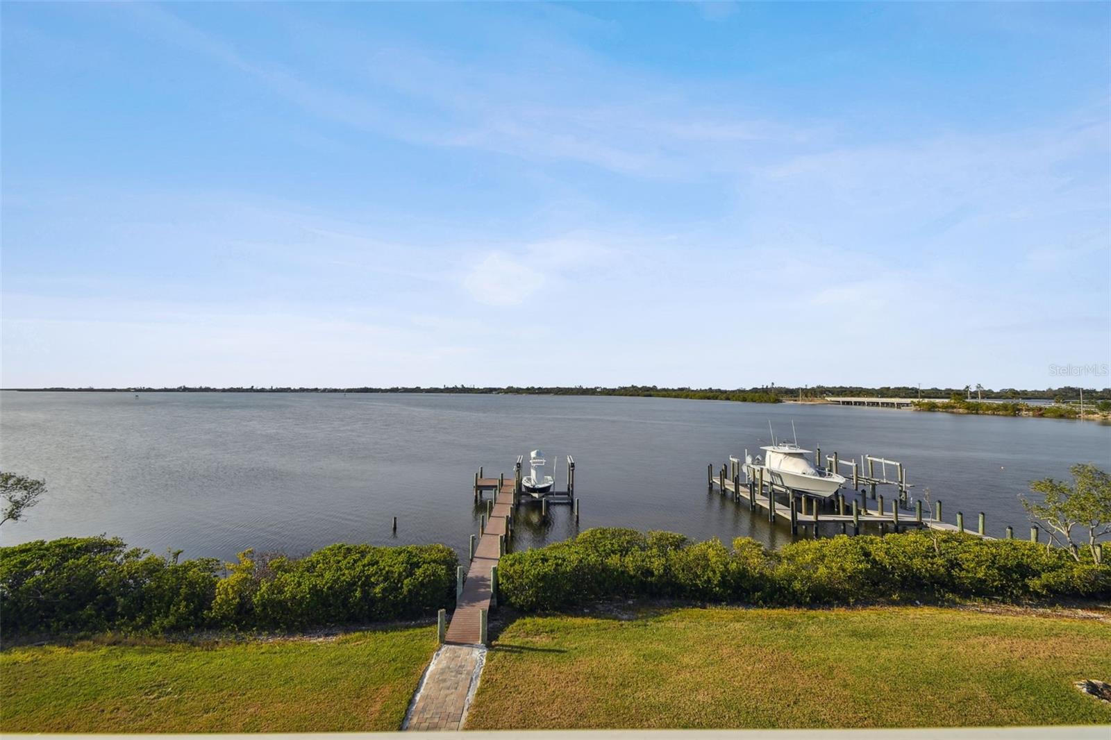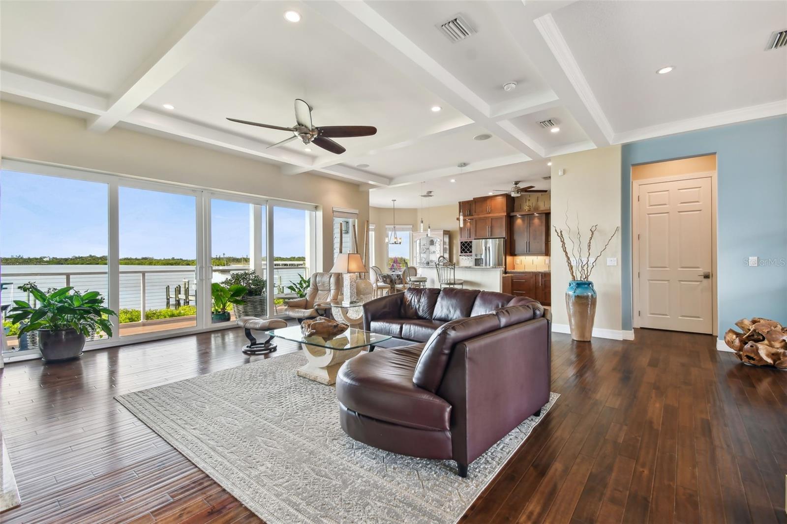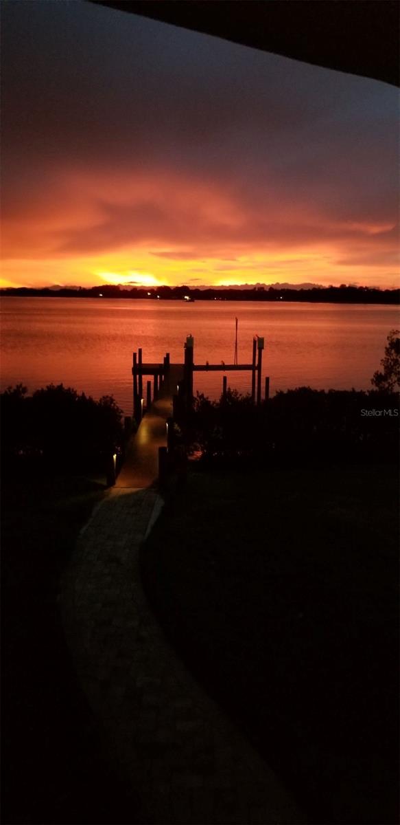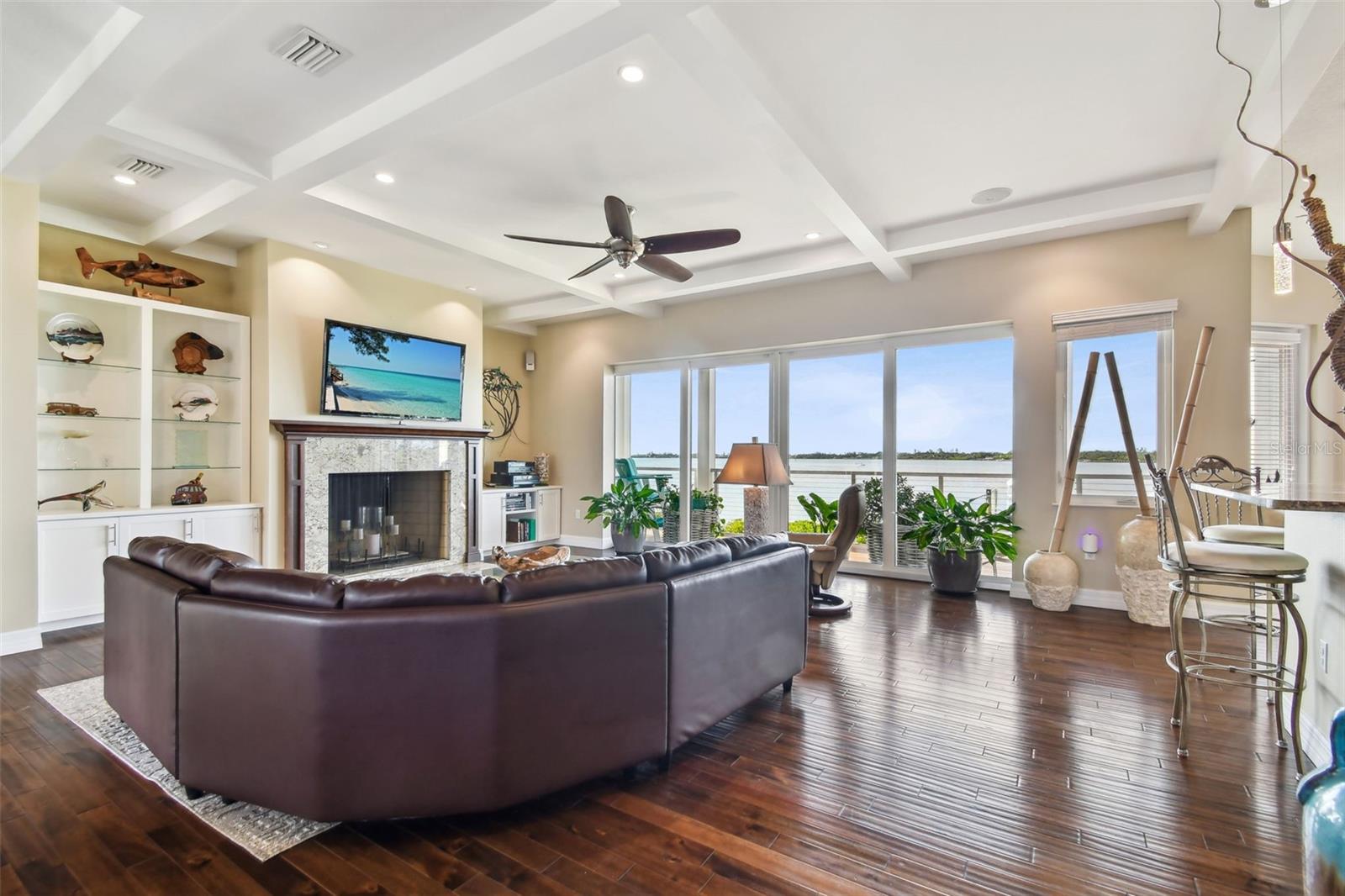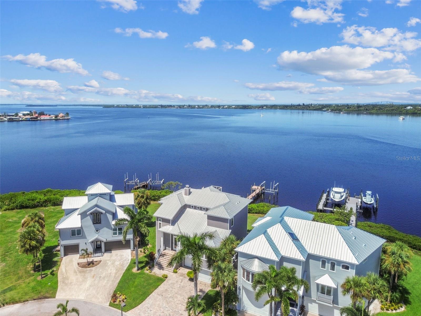 Experience breathtaking sunsets every evening from your custom-built, modern Key West-style waterfront home in the exclusive, gated community of Terra Ceia Bay Estates, featuring only ten residences. Arrive by boat via Tampa Bay's open waters to your private 90-foot dock with a 10,000 pound boat lift, or park in your expansive five-car garage equipped with ample storage. An elevator conveniently takes you to any of the home’s three levels. The mid-level main entrance welcomes you to an open-concept living area with stunning 180° water views, showcased through disappearing four-panel pocket sliding glass doors. The living room boasts a spacious wood-burning fireplace with a custom wood mantle, granite hearth, and built-ins, all beneath soaring 10-foot coffered ceilings with in-ceiling Bose surround sound speakers. These high ceilings continue throughout the home, complemented by ¾-inch solid Acacia hand-scraped hardwood floors, along with marble and travertine tile accents in the kitchen and bathrooms. The gourmet kitchen is a chef’s dream, offering a large walk-in pantry, granite countertops, under-cabinet and valance lighting, a touchless Kohler faucet, a generously sized island with bar seating, and a breakfast nook perfect for entertaining. It’s outfitted with high-end appliances, including a double oven, a five-burner low-profile electric cooktop, and a microwave drawer—ideal for hosting gatherings or preparing meals for family and friends. Adjacent is a formal dining room with crown molding and its own private balcony. On the third floor, the primary suite serves as a luxurious retreat, featuring a tray ceiling, a mirrored dressing area, and glass French doors leading to a private deck. A spiral staircase ascends to a crow’s nest, 40 feet above ground, where you can enjoy sunsets with panoramic views of the bay and Skyway Bridge. The ensuite bathroom offers heated travertine floors, a double vanity with granite countertops, a 12-jet Jacuzzi tub with an inline whirlpool heater, and an oversized walk-in shower with dual rainheads, four body sprays, and a shower wand. A nearby laundry room adds convenience, while an additional bedroom on this level includes a private bath with mosaic tile accents and a spacious wardrobe closet. Additional features of the home include solid core 8-foot interior doors, whole-house dimmable LED lighting, ceiling fans throughout, metal roofing, vinyl siding, Icynene attic spray foam insulation, a security system, PGT hurricane-rated impact windows and doors, see-through cable railing, and Trex composite decking. Outdoor amenities include dock lighting, a remote GEM boat lift controller, a 50A/30A shore power tower, and an in-ground sprinkler system. The home is located just 25 minutes from downtown St. Petersburg, 35 minutes from Tampa International Airport, and 20 minutes from University Mall. The HOA fee of $500/month covers community pool access, lawn and shrub maintenance, fertilization, and irrigation water.
