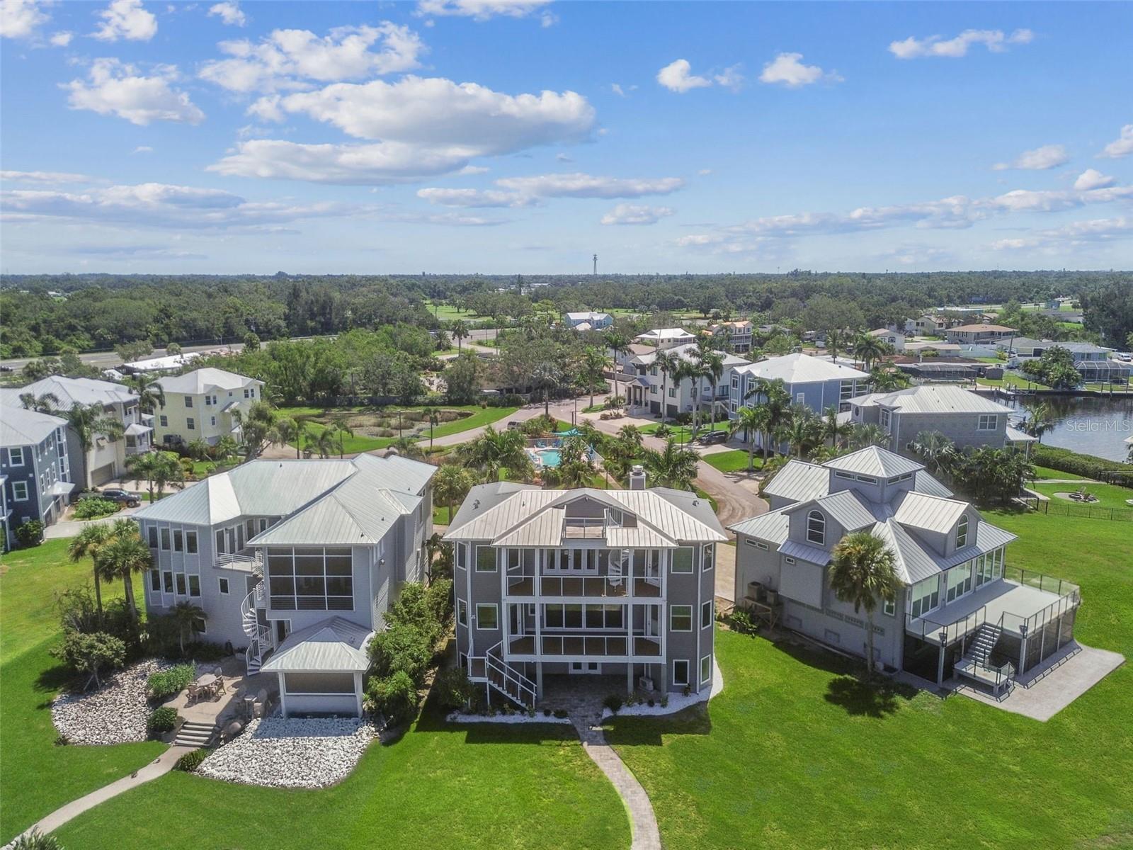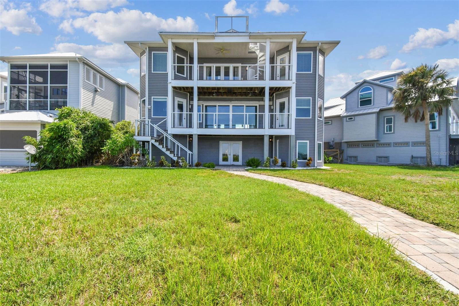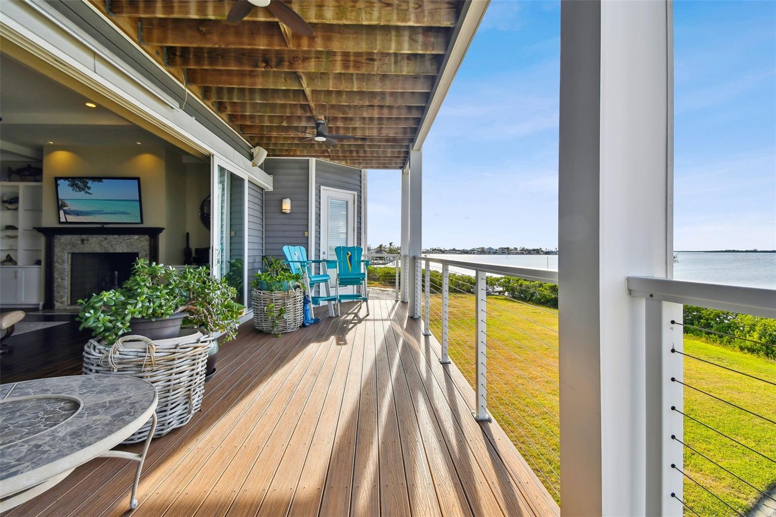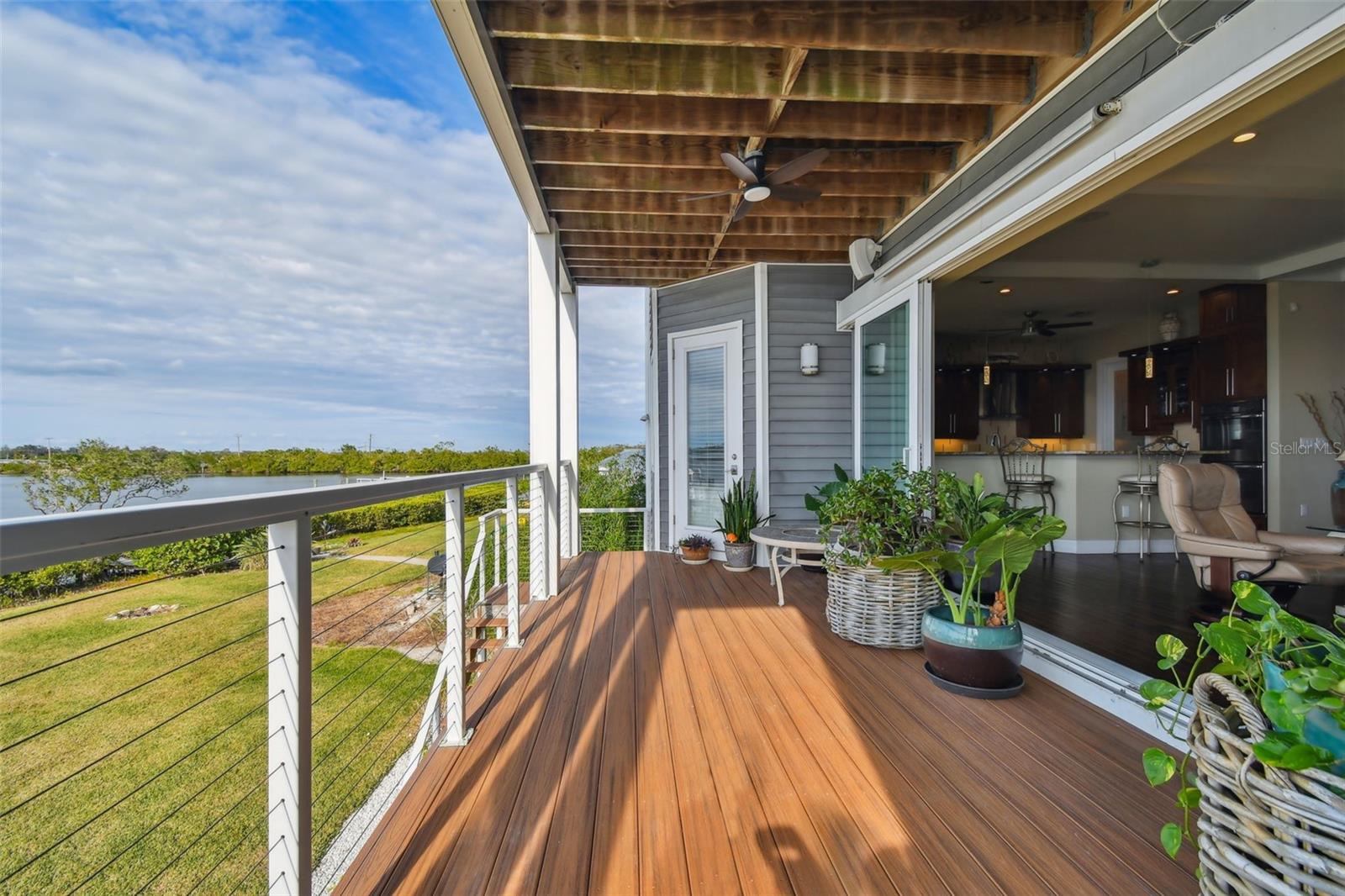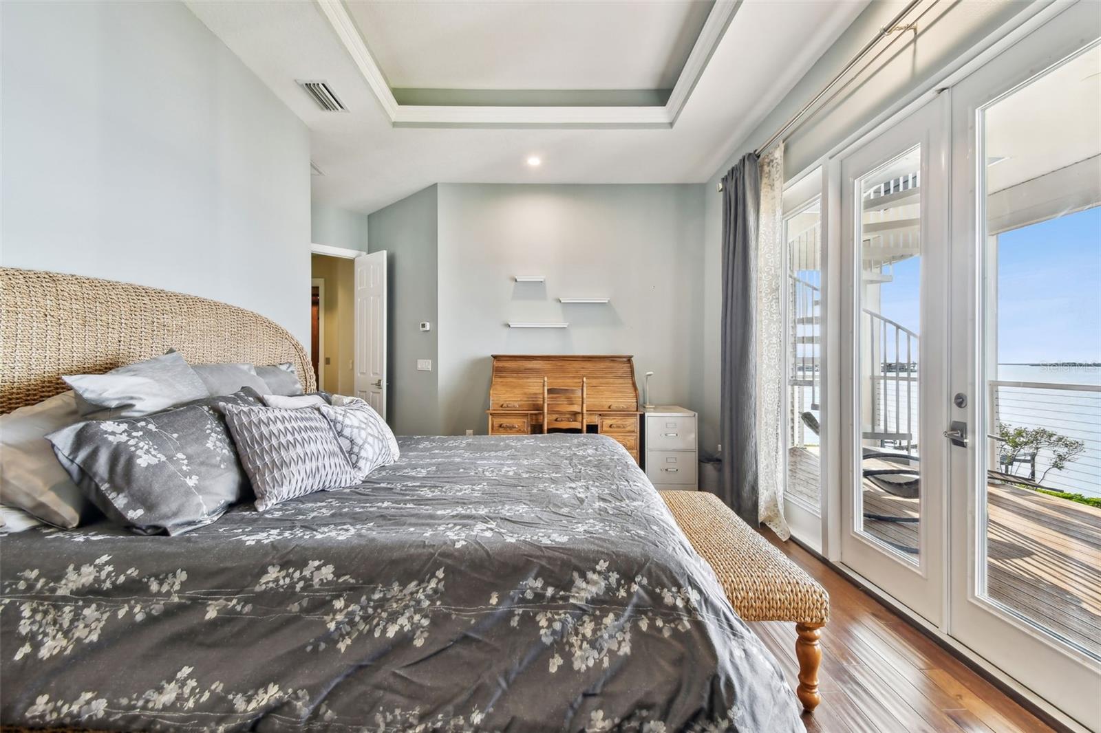 Experience breathtaking sunsets every evening from your custom-built, modern Key West-style waterfront home in the exclusive, gated community of Terra Ceia Bay Estates, featuring only ten residences. Arrive by boat via Tampa Bay's open waters to your private 90-foot dock with a 10,000 pound boat lift, or park in your expansive five-car garage equipped with ample storage. An elevator conveniently takes you to any of the home’s three levels. The mid-level main entrance welcomes you to an open-concept living area with stunning 180° water views, showcased through disappearing four-panel pocket sliding glass doors. The living room boasts a spacious wood-burning fireplace with a custom wood mantle, granite hearth, and built-ins, all beneath soaring 10-foot coffered ceilings with in-ceiling Bose surround sound speakers. These high ceilings continue throughout the home, complemented by ¾-inch solid Acacia hand-scraped hardwood floors, along with marble and travertine tile accents in the kitchen and bathrooms. The gourmet kitchen is a chef’s dream, offering a large walk-in pantry, granite countertops, under-cabinet and valance lighting, a touchless Kohler faucet, a generously sized island with bar seating, and a breakfast nook perfect for entertaining. It’s outfitted with high-end appliances, including a double oven, a five-burner low-profile electric cooktop, and a microwave drawer—ideal for hosting gatherings or preparing meals for family and friends. Adjacent is a formal dining room with crown molding and its own private balcony. On the third floor, the primary suite serves as a luxurious retreat, featuring a tray ceiling, a mirrored dressing area, and glass French doors leading to a private deck. A spiral staircase ascends to a crow’s nest, 40 feet above ground, where you can enjoy sunsets with panoramic views of the bay and Skyway Bridge. The ensuite bathroom offers heated travertine floors, a double vanity with granite countertops, a 12-jet Jacuzzi tub with an inline whirlpool heater, and an oversized walk-in shower with dual rainheads, four body sprays, and a shower wand. A nearby laundry room adds convenience, while an additional bedroom on this level includes a private bath with mosaic tile accents and a spacious wardrobe closet. Additional features of the home include solid core 8-foot interior doors, whole-house dimmable LED lighting, ceiling fans throughout, metal roofing, vinyl siding, Icynene attic spray foam insulation, a security system, PGT hurricane-rated impact windows and doors, see-through cable railing, and Trex composite decking. Outdoor amenities include dock lighting, a remote GEM boat lift controller, a 50A/30A shore power tower, and an in-ground sprinkler system. The home is located just 25 minutes from downtown St. Petersburg, 35 minutes from Tampa International Airport, and 20 minutes from University Mall. The HOA fee of $500/month covers community pool access, lawn and shrub maintenance, fertilization, and irrigation water.