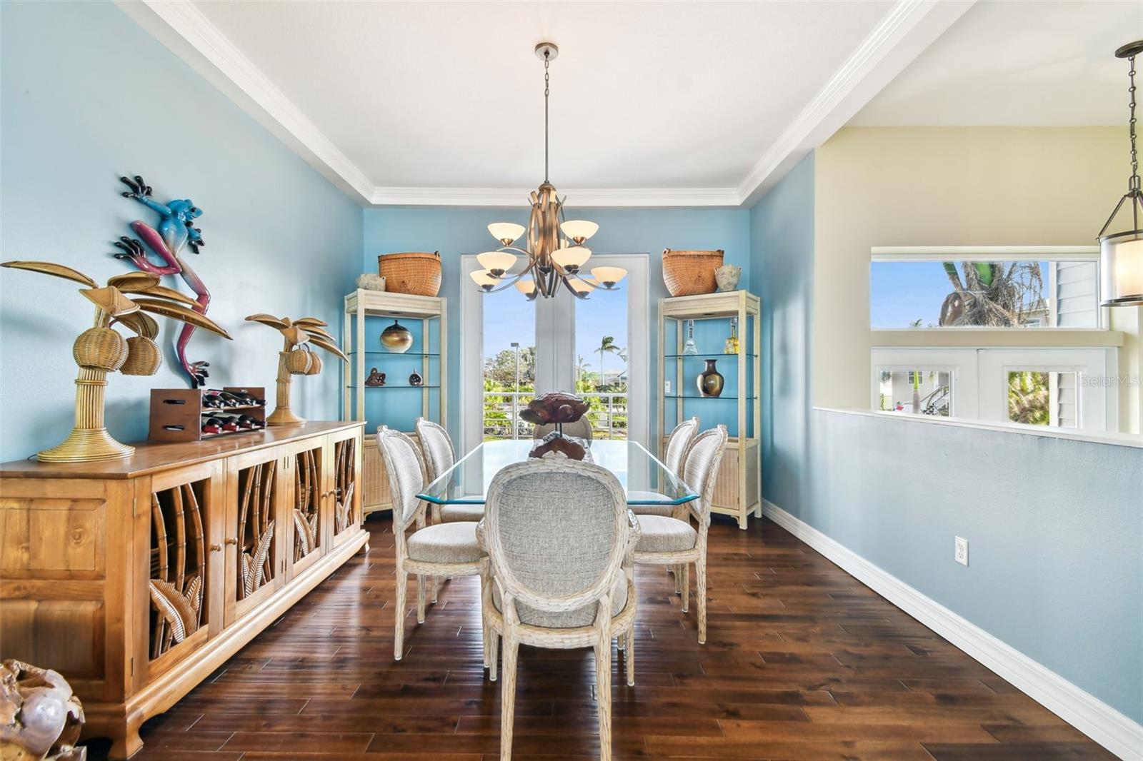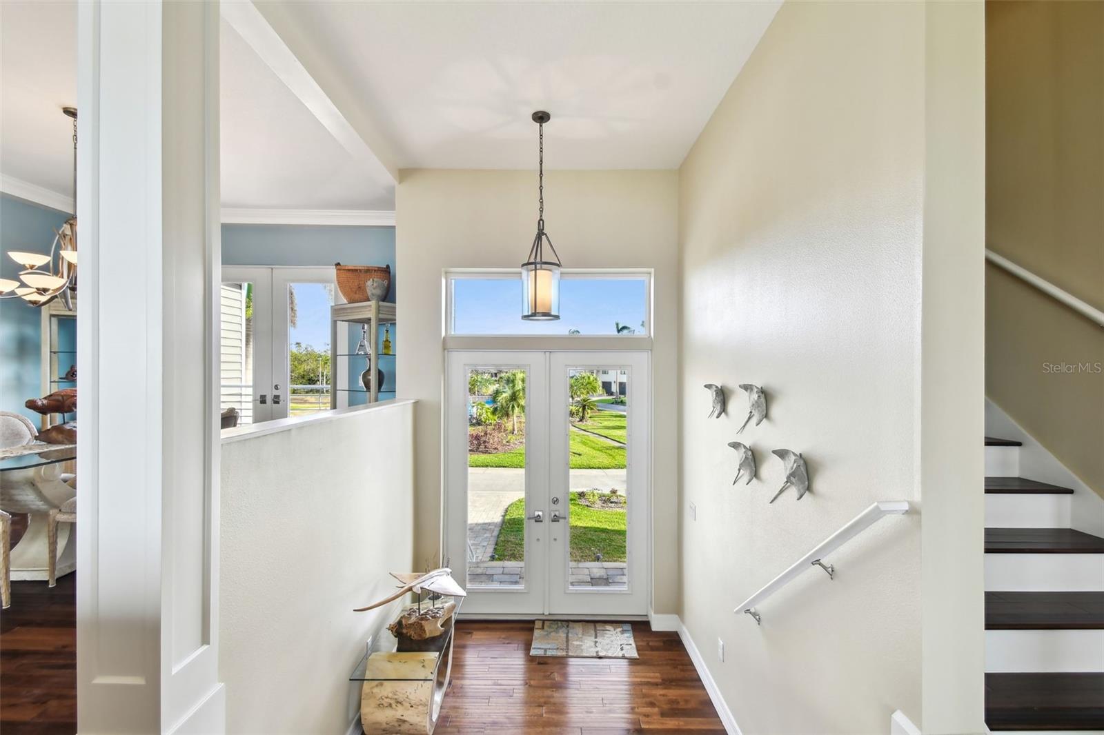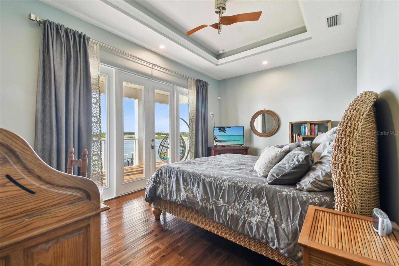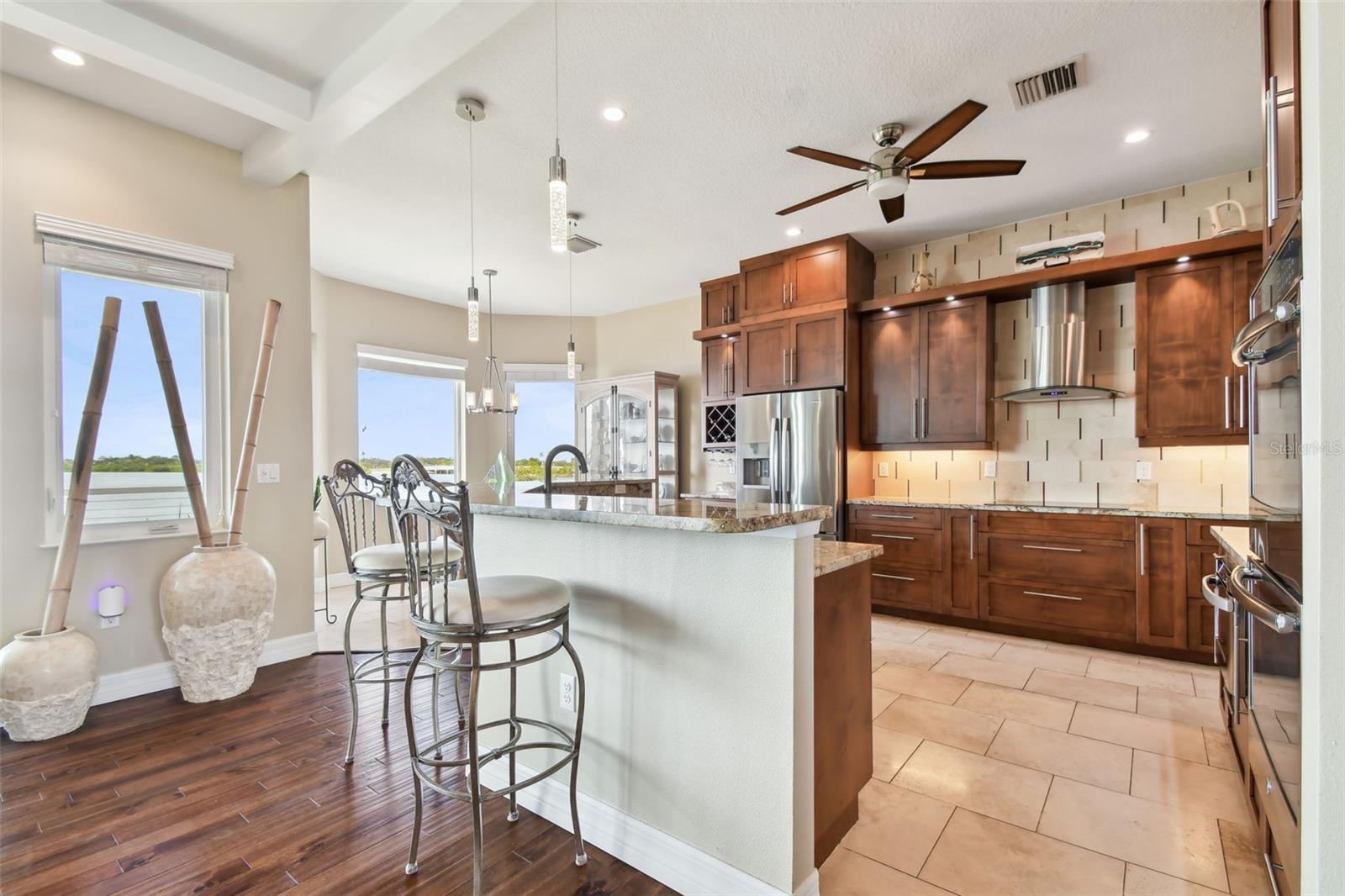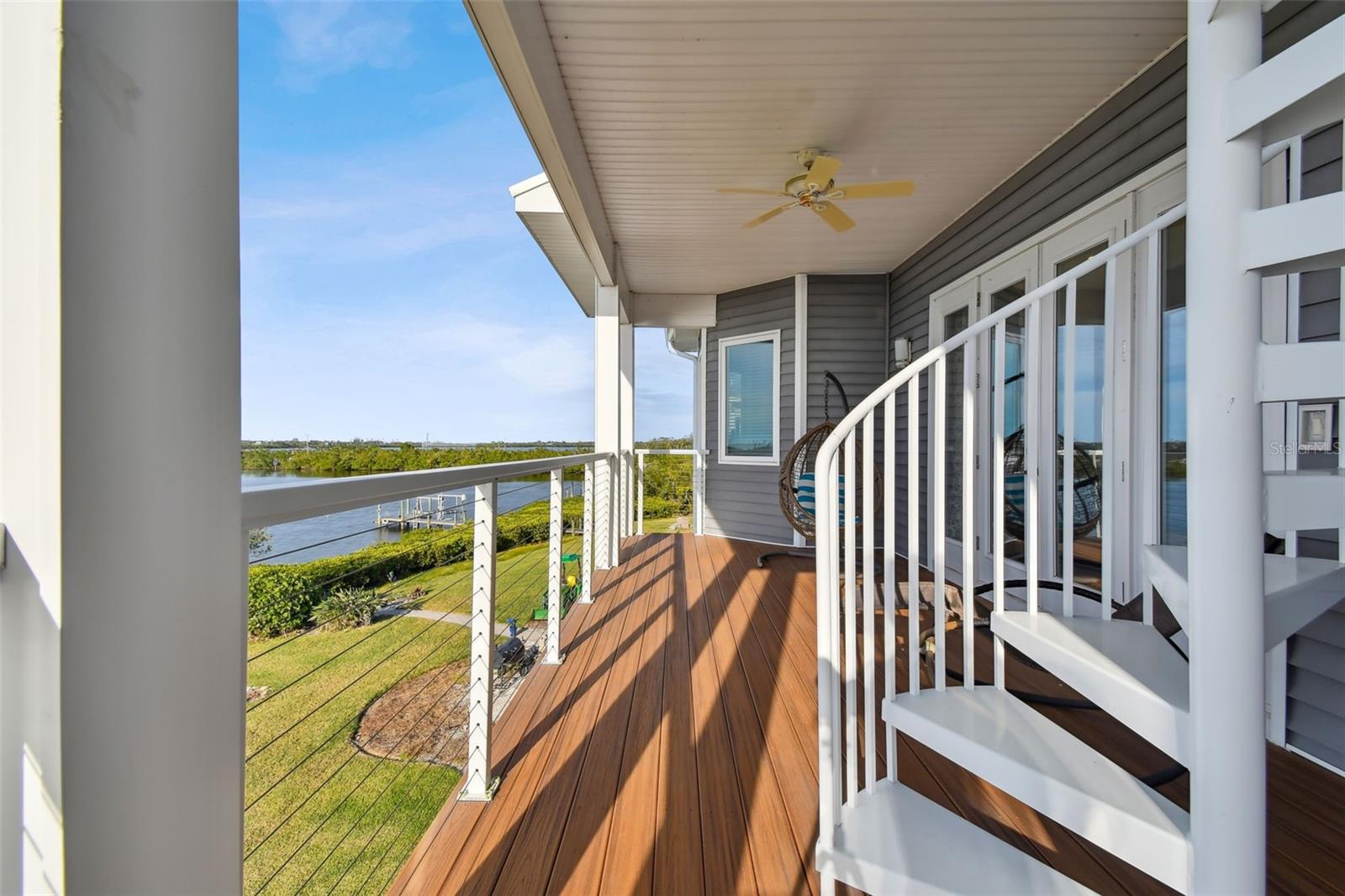 Experience breathtaking sunsets every evening from your custom-built, modern Key West-style waterfront home in the exclusive, gated community of Terra Ceia Bay Estates, featuring only ten residences. Arrive by boat via Tampa Bay's open waters to your private 90-foot dock with a 10,000 pound boat lift, or park in your expansive five-car garage equipped with ample storage. An elevator conveniently takes you to any of the home’s three levels. The mid-level main entrance welcomes you to an open-concept living area with stunning 180° water views, showcased through disappearing four-panel pocket sliding glass doors. The living room boasts a spacious wood-burning fireplace with a custom wood mantle, granite hearth, and built-ins, all beneath soaring 10-foot coffered ceilings with in-ceiling Bose surround sound speakers. These high ceilings continue throughout the home, complemented by ¾-inch solid Acacia hand-scraped hardwood floors, along with marble and travertine tile accents in the kitchen and bathrooms. The gourmet kitchen is a chef’s dream, offering a large walk-in pantry, granite countertops, under-cabinet and valance lighting, a touchless Kohler faucet, a generously sized island with bar seating, and a breakfast nook perfect for entertaining. It’s outfitted with high-end appliances, including a double oven, a five-burner low-profile electric cooktop, and a microwave drawer—ideal for hosting gatherings or preparing meals for family and friends. Adjacent is a formal dining room with crown molding and its own private balcony. On the third floor, the primary suite serves as a luxurious retreat, featuring a tray ceiling, a mirrored dressing area, and glass French doors leading to a private deck. A spiral staircase ascends to a crow’s nest, 40 feet above ground, where you can enjoy sunsets with panoramic views of the bay and Skyway Bridge. The ensuite bathroom offers heated travertine floors, a double vanity with granite countertops, a 12-jet Jacuzzi tub with an inline whirlpool heater, and an oversized walk-in shower with dual rainheads, four body sprays, and a shower wand. A nearby laundry room adds convenience, while an additional bedroom on this level includes a private bath with mosaic tile accents and a spacious wardrobe closet. Additional features of the home include solid core 8-foot interior doors, whole-house dimmable LED lighting, ceiling fans throughout, metal roofing, vinyl siding, Icynene attic spray foam insulation, a security system, PGT hurricane-rated impact windows and doors, see-through cable railing, and Trex composite decking. Outdoor amenities include dock lighting, a remote GEM boat lift controller, a 50A/30A shore power tower, and an in-ground sprinkler system. The home is located just 25 minutes from downtown St. Petersburg, 35 minutes from Tampa International Airport, and 20 minutes from University Mall. The HOA fee of $500/month covers community pool access, lawn and shrub maintenance, fertilization, and irrigation water.