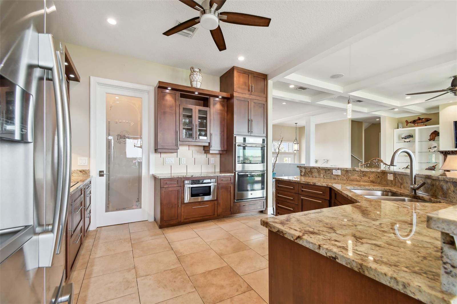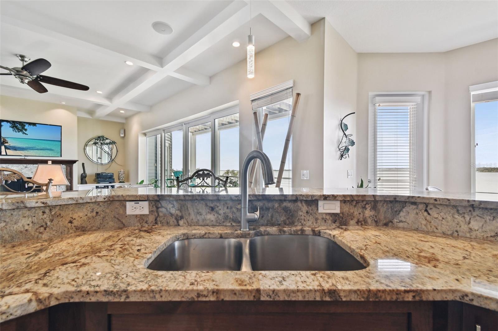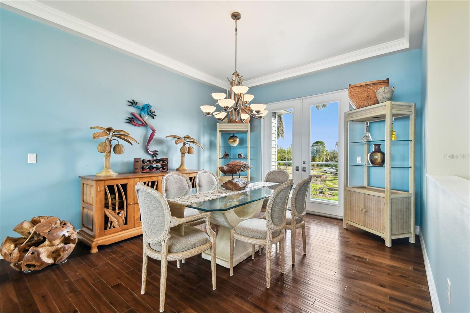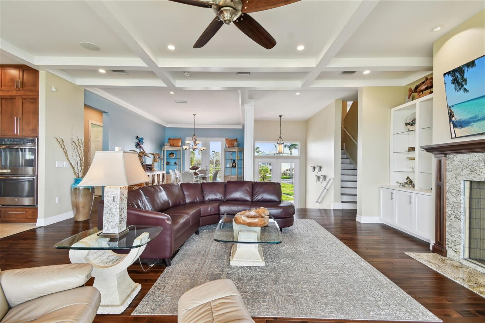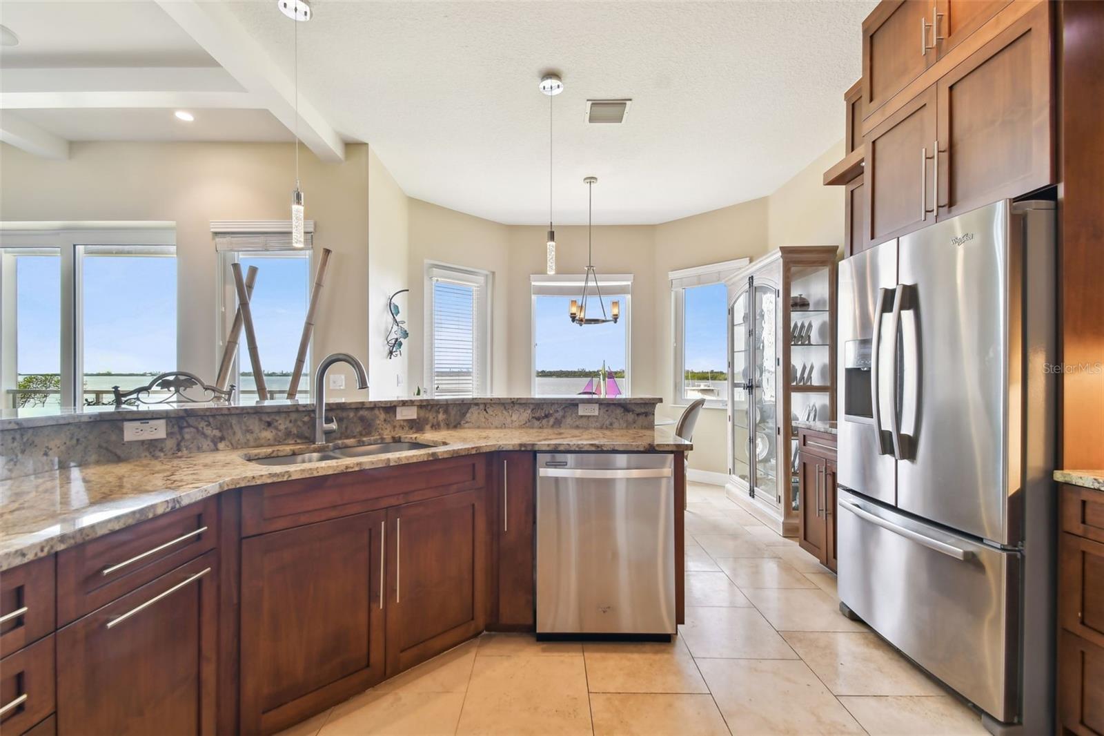 Experience breathtaking sunsets every evening from your custom-built, modern Key West-style waterfront home in the exclusive, gated community of Terra Ceia Bay Estates, featuring only ten residences. Arrive by boat via Tampa Bay's open waters to your private 90-foot dock with a 10,000 pound boat lift, or park in your expansive five-car garage equipped with ample storage. An elevator conveniently takes you to any of the home’s three levels. The mid-level main entrance welcomes you to an open-concept living area with stunning 180° water views, showcased through disappearing four-panel pocket sliding glass doors. The living room boasts a spacious wood-burning fireplace with a custom wood mantle, granite hearth, and built-ins, all beneath soaring 10-foot coffered ceilings with in-ceiling Bose surround sound speakers. These high ceilings continue throughout the home, complemented by ¾-inch solid Acacia hand-scraped hardwood floors, along with marble and travertine tile accents in the kitchen and bathrooms. The gourmet kitchen is a chef’s dream, offering a large walk-in pantry, granite countertops, under-cabinet and valance lighting, a touchless Kohler faucet, a generously sized island with bar seating, and a breakfast nook perfect for entertaining. It’s outfitted with high-end appliances, including a double oven, a five-burner low-profile electric cooktop, and a microwave drawer—ideal for hosting gatherings or preparing meals for family and friends. Adjacent is a formal dining room with crown molding and its own private balcony. On the third floor, the primary suite serves as a luxurious retreat, featuring a tray ceiling, a mirrored dressing area, and glass French doors leading to a private deck. A spiral staircase ascends to a crow’s nest, 40 feet above ground, where you can enjoy sunsets with panoramic views of the bay and Skyway Bridge. The ensuite bathroom offers heated travertine floors, a double vanity with granite countertops, a 12-jet Jacuzzi tub with an inline whirlpool heater, and an oversized walk-in shower with dual rainheads, four body sprays, and a shower wand. A nearby laundry room adds convenience, while an additional bedroom on this level includes a private bath with mosaic tile accents and a spacious wardrobe closet. Additional features of the home include solid core 8-foot interior doors, whole-house dimmable LED lighting, ceiling fans throughout, metal roofing, vinyl siding, Icynene attic spray foam insulation, a security system, PGT hurricane-rated impact windows and doors, see-through cable railing, and Trex composite decking. Outdoor amenities include dock lighting, a remote GEM boat lift controller, a 50A/30A shore power tower, and an in-ground sprinkler system. The home is located just 25 minutes from downtown St. Petersburg, 35 minutes from Tampa International Airport, and 20 minutes from University Mall. The HOA fee of $500/month covers community pool access, lawn and shrub maintenance, fertilization, and irrigation water.