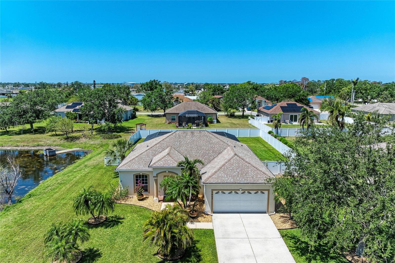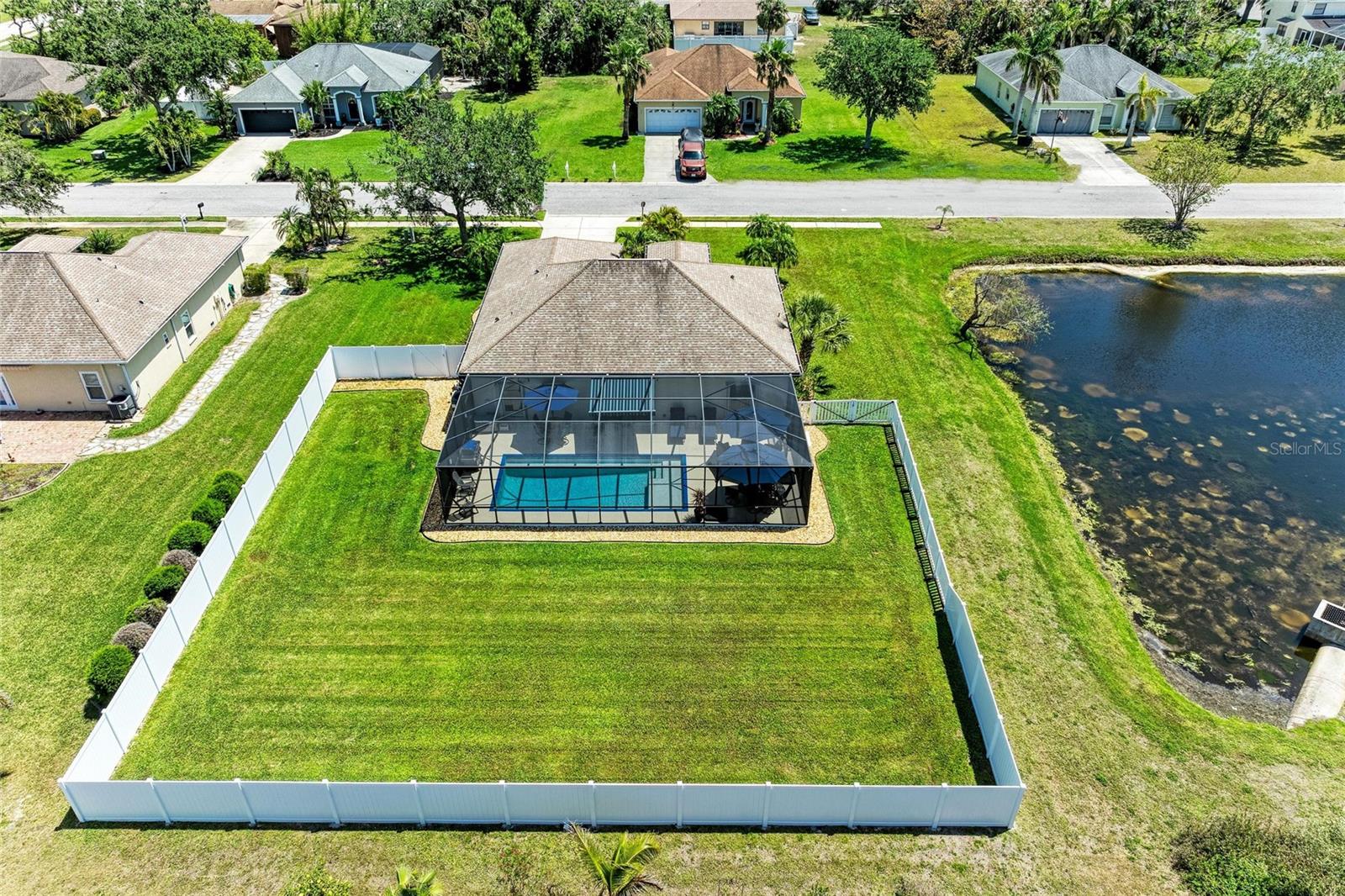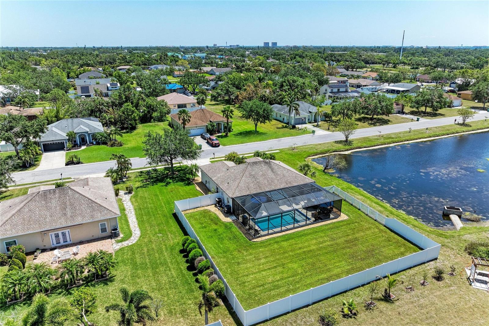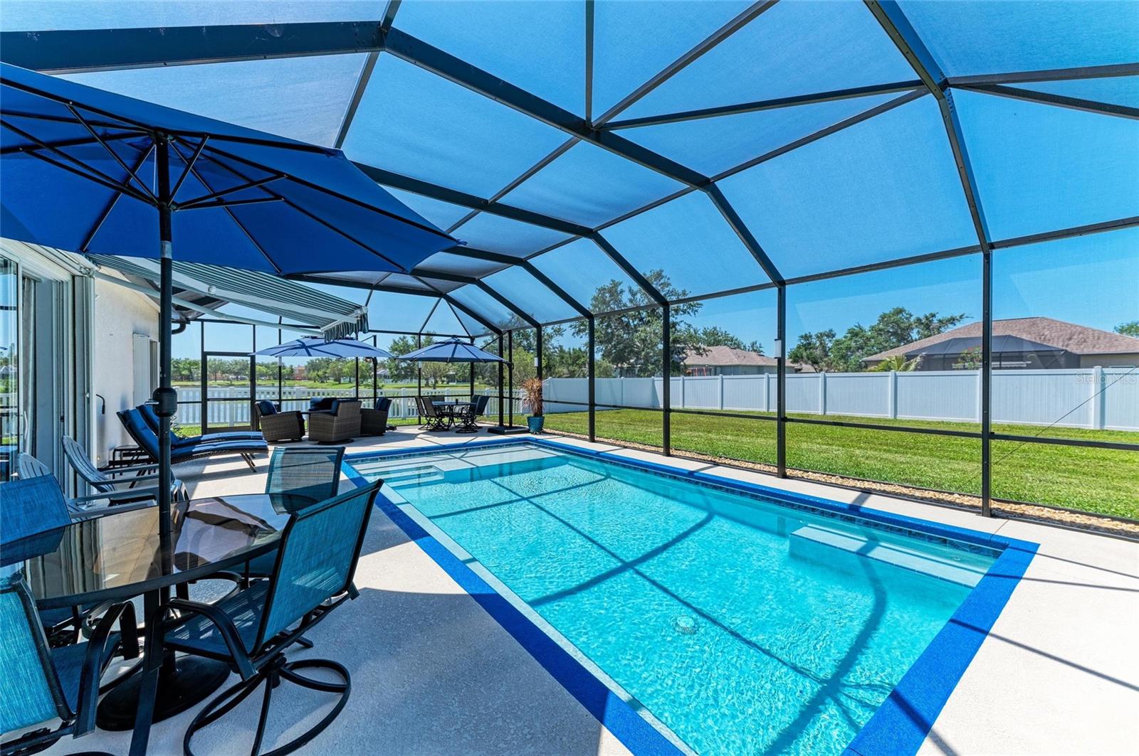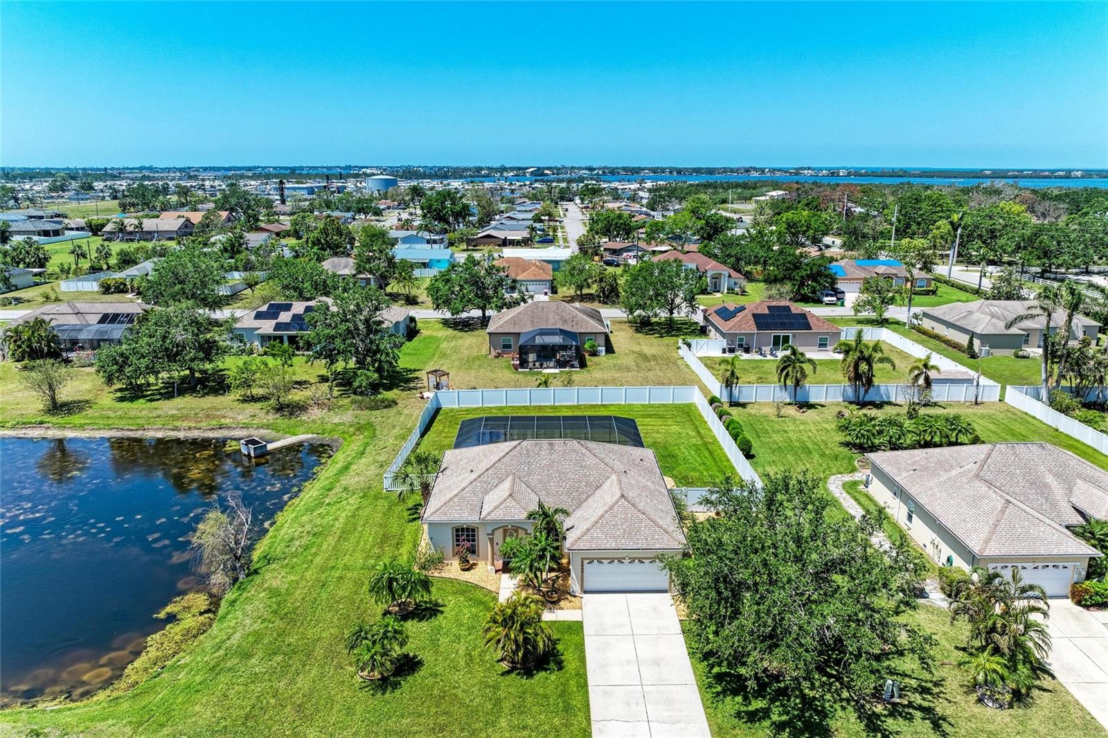 Welcome to Palm Lake Estates - a pleasant, quiet community of 36 homes conveniently located to shopping amenities and schools while opening the door to the natural world opportunities of Emerson Point Preserve at the tip of Snead Island. Situated on an oversized lakefront parcel, this lovely home provides comforts and vistas. Volume ceilings and openness define this three bedroom/two bath home with spacious den. Wood plank flooring flows throughout, enhanced by fresh neutral walls with coastal blue accents, attractive ceiling fixtures and light filled space. The kitchen features plentiful cabinetry and an island for communal gathering. The expansive living room overlooks a new large screened lanai and heated salt water pool. Stylish outdoor furniture beckons all - to a day of relaxation, exercise, entertaining. The backyard is completely fenced with new vinyl fencing while still affording a view of the lake beyond. This lovely home also offers a two car garage, laundry room, storm shutters, and attractive awnings. Offered TURN-KEY FURNISHED less personal exceptions.