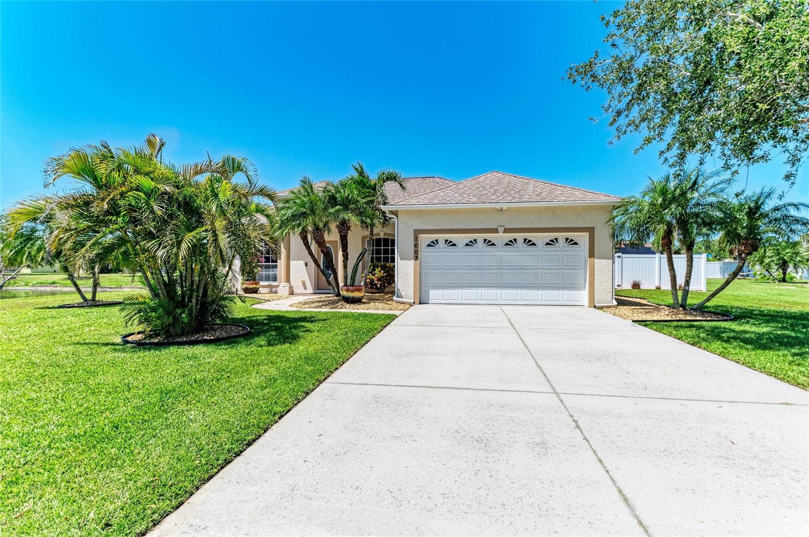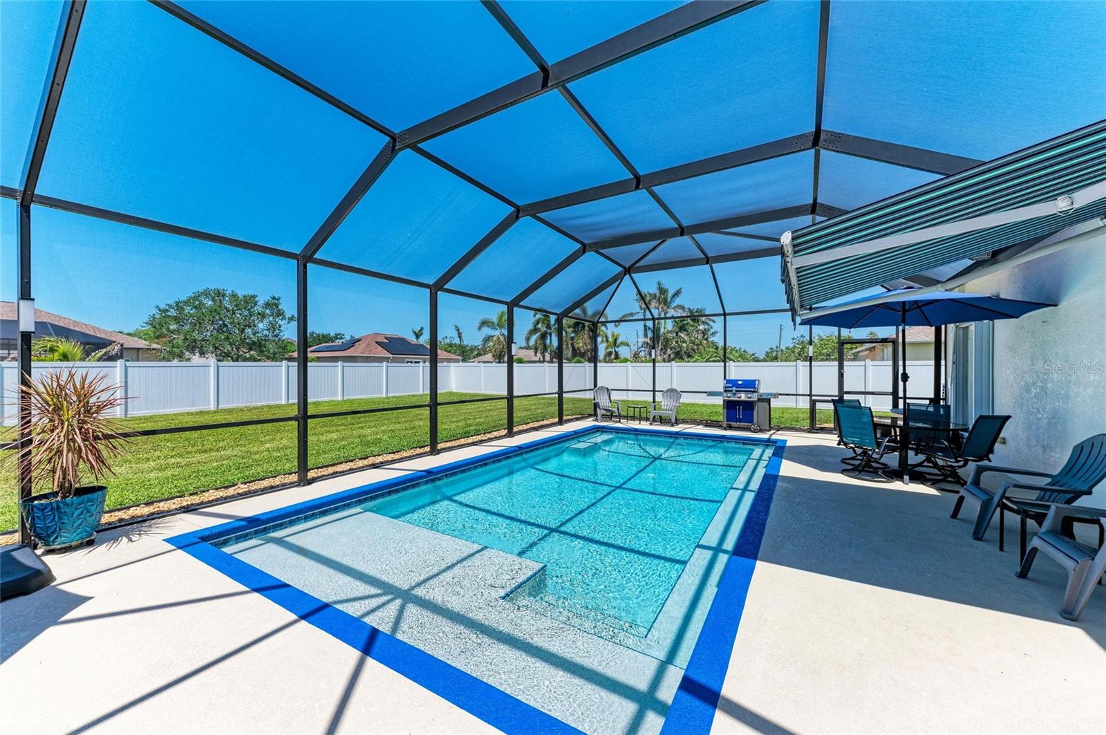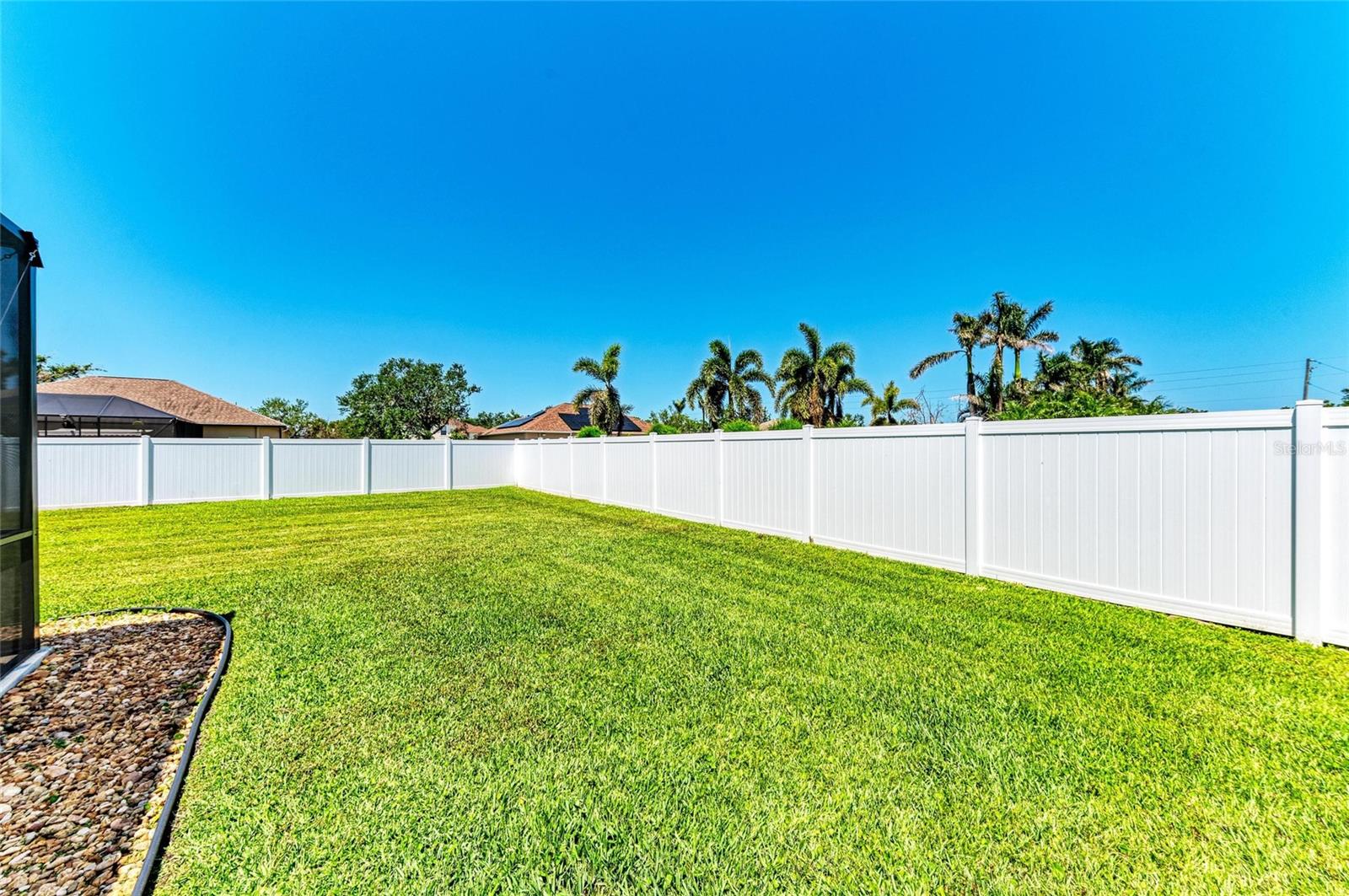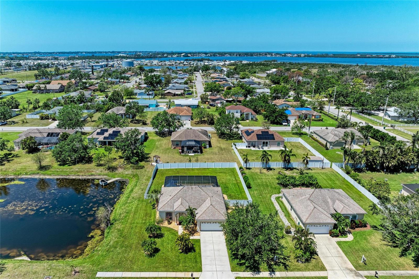 Welcome to Palm Lake Estates - a pleasant, quiet community of 36 homes conveniently located to shopping amenities and schools while opening the door to the natural world opportunities of Emerson Point Preserve at the tip of Snead Island. Situated on an oversized lakefront parcel, this lovely home provides comforts and vistas. Volume ceilings and openness define this three bedroom/two bath home with spacious den. Wood plank flooring flows throughout, enhanced by fresh neutral walls with coastal blue accents, attractive ceiling fixtures and light filled space. The kitchen features plentiful cabinetry and an island for communal gathering. The expansive living room overlooks a new large screened lanai and heated salt water pool. Stylish outdoor furniture beckons all - to a day of relaxation, exercise, entertaining. The backyard is completely fenced with new vinyl fencing while still affording a view of the lake beyond. This lovely home also offers a two car garage, laundry room, storm shutters, and attractive awnings. Offered TURN-KEY FURNISHED less personal exceptions.
