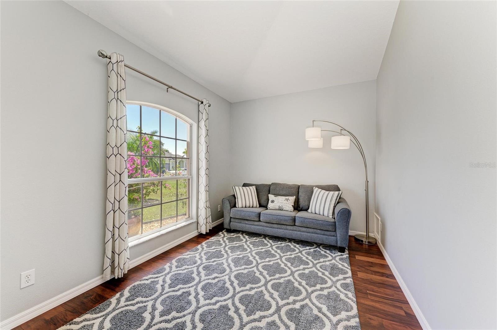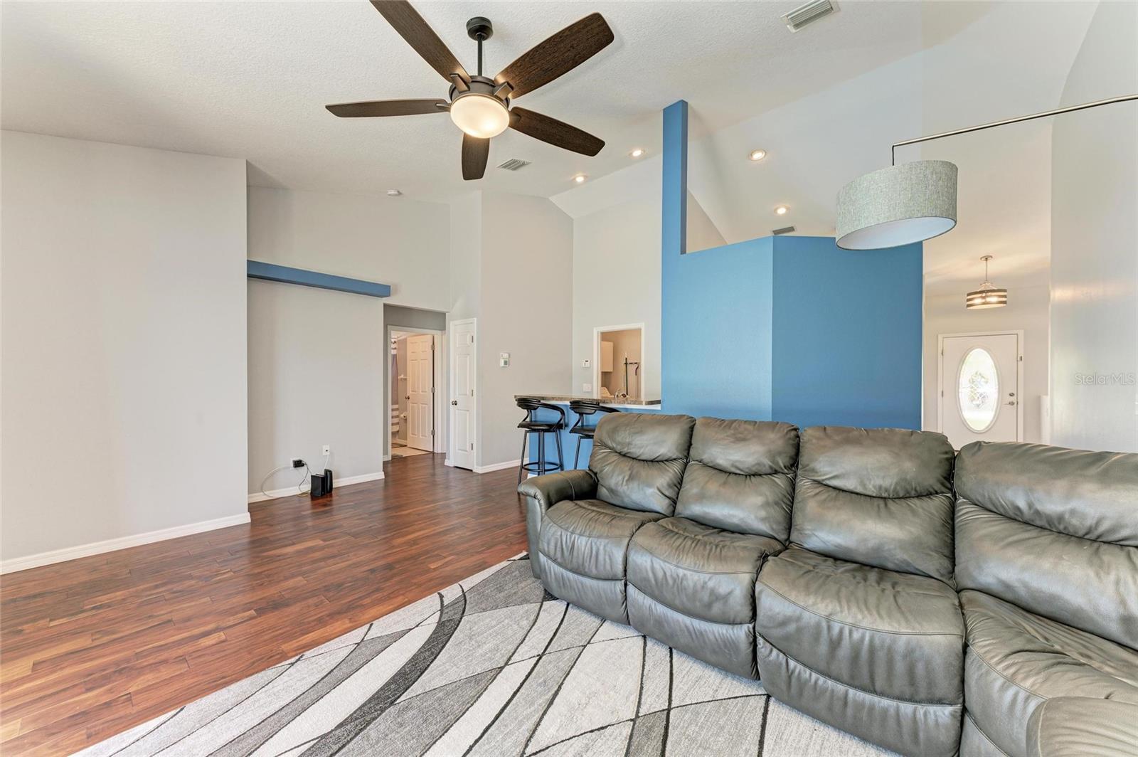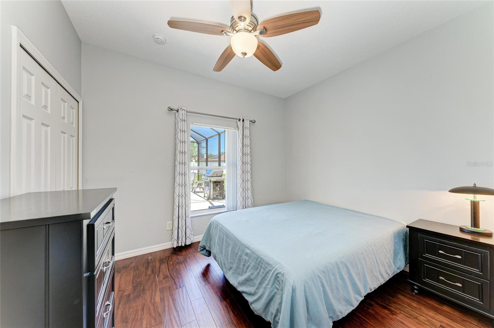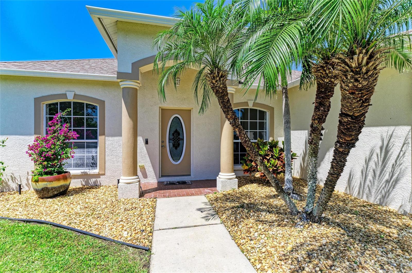 Welcome to Palm Lake Estates - a pleasant, quiet community of 36 homes conveniently located to shopping amenities and schools while opening the door to the natural world opportunities of Emerson Point Preserve at the tip of Snead Island. Situated on an oversized lakefront parcel, this lovely home provides comforts and vistas. Volume ceilings and openness define this three bedroom/two bath home with spacious den. Wood plank flooring flows throughout, enhanced by fresh neutral walls with coastal blue accents, attractive ceiling fixtures and light filled space. The kitchen features plentiful cabinetry and an island for communal gathering. The expansive living room overlooks a new large screened lanai and heated salt water pool. Stylish outdoor furniture beckons all - to a day of relaxation, exercise, entertaining. The backyard is completely fenced with new vinyl fencing while still affording a view of the lake beyond. This lovely home also offers a two car garage, laundry room, storm shutters, and attractive awnings. Offered TURN-KEY FURNISHED less personal exceptions.