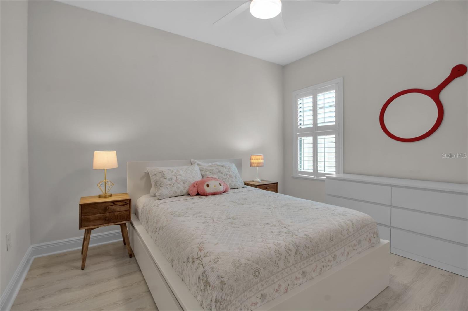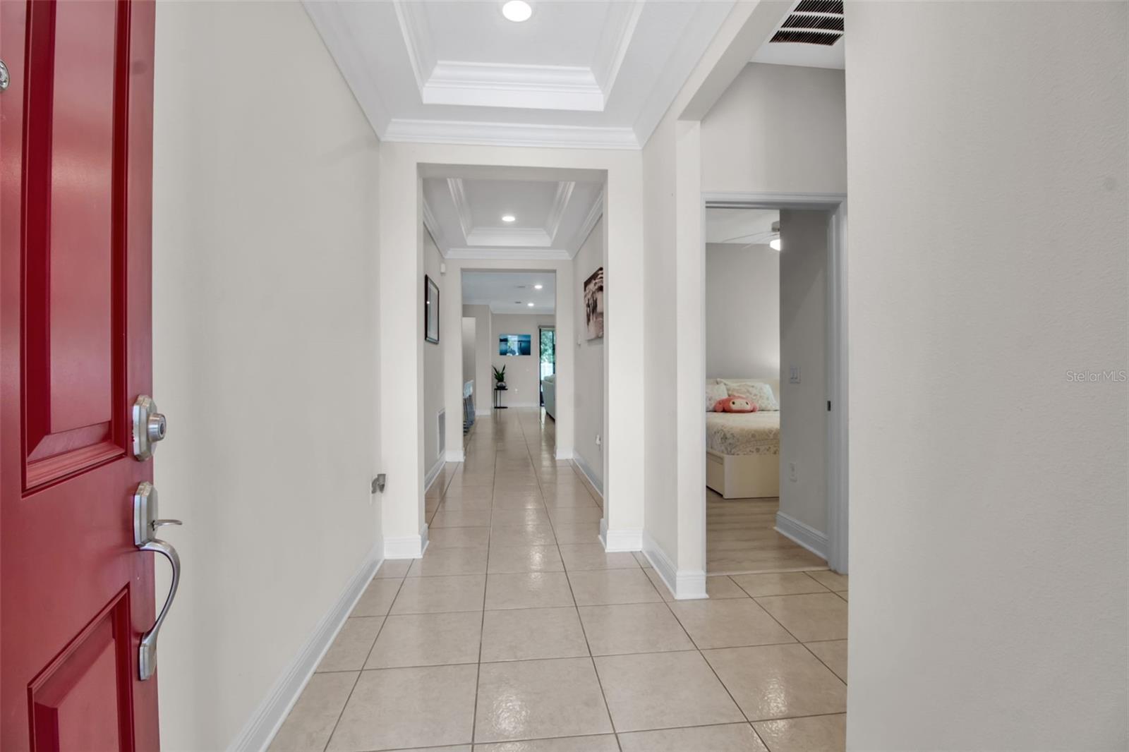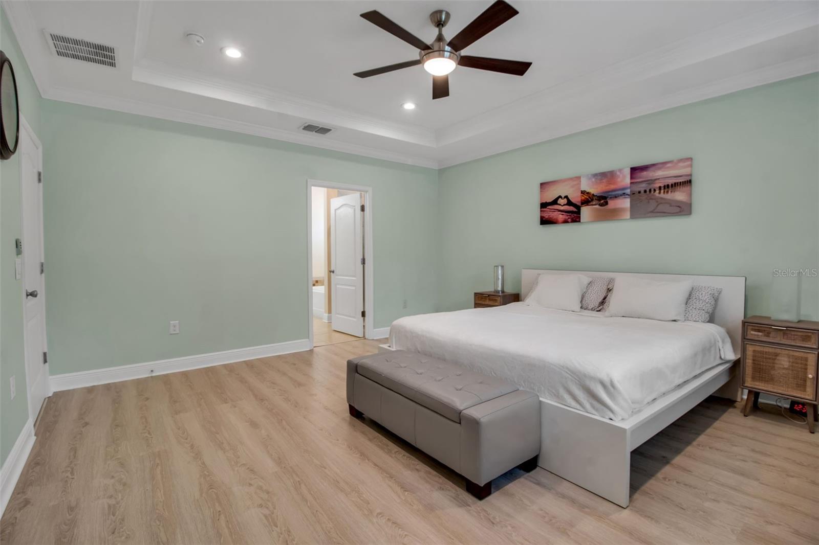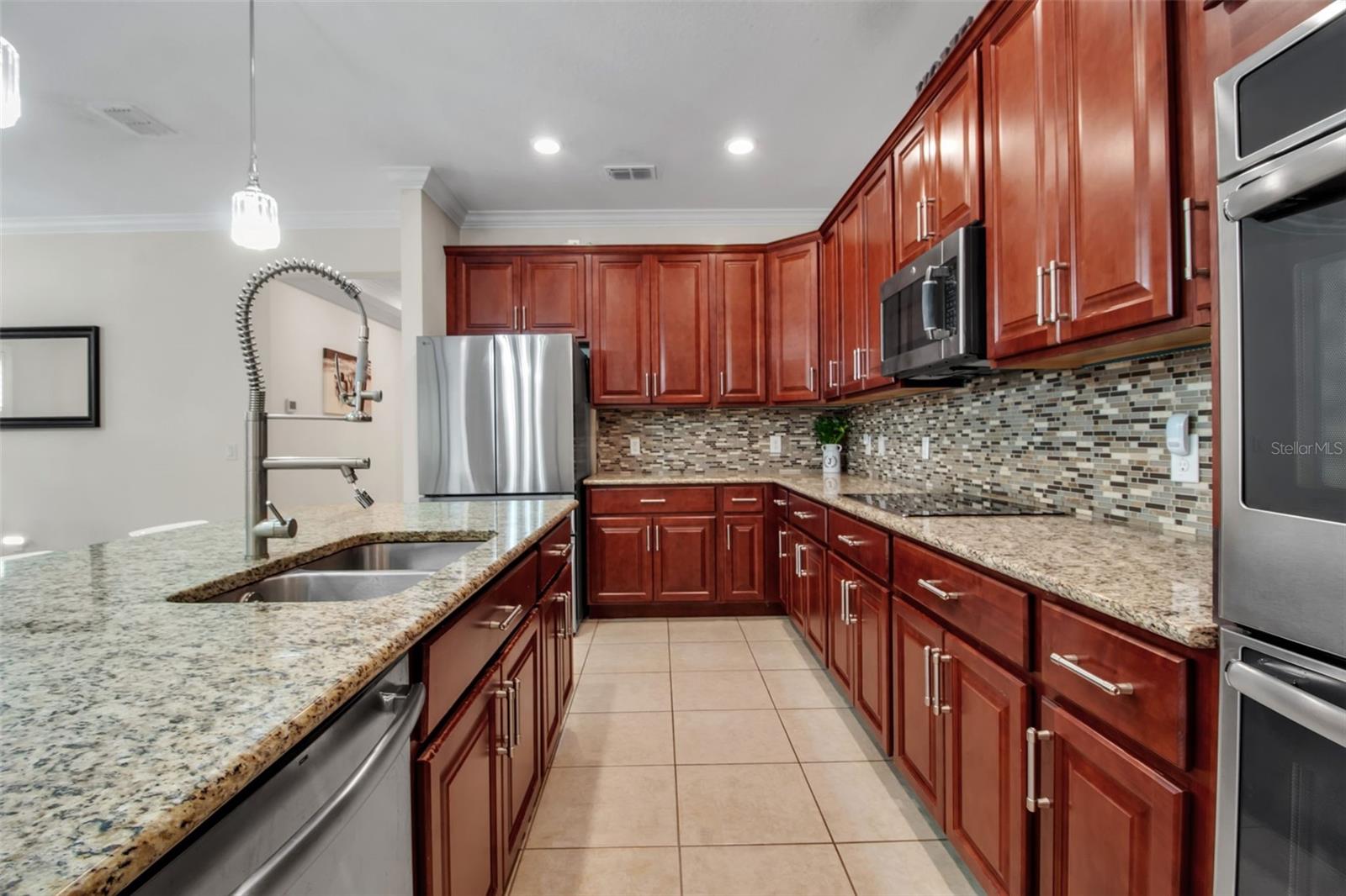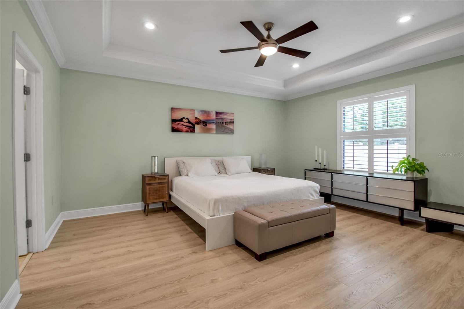Discover the perfect blend of elegance & comfort in this beautiful home located in the charming Heron Creek community. This lovely 4-bedroom, 2-bathroom residence offers a harmonious combination of modern upgrades & timeless charm. Inside, you'll find thoughtfully appointed interiors featuring graceful crown molding, stylish plantation shutters and striking tray ceilings that add an extra touch of architectural elegance. The spacious bedrooms have sleek laminate plank flooring, creating a warm and inviting space. The heart of the home is the chef’s dream kitchen, showcasing a generous 10-foot island perfect for gatherings and meal prep. Equipped with a cooktop stove, built-in double ovens, granite countertops, and a striking mosaic backsplash, this space combines functionality with timeless style. The primary suite is a spacious retreat, featuring a generous walk-in closet that provides ample storage. The en-suite bathroom is a spa-like haven, highlighted by a double sink vanity, a walk-in shower, and a soaking tub—perfect for relaxing and rejuvenating after a busy day. This serene space offers both comfort and privacy, making it an ideal escape within your home. Outside, enjoy the privacy of a fenced yard, perfect for outdoor activities and pets. The screened lanai provides a tranquil space to relax with your morning coffee or evening sunset, while the extended paver patio invites you to host barbecues and gatherings in style. Located in a sought-after community with NO CDD & LOW HOA Fees. This home provides quick & easy access to I75, I275, US Hwy 41, 301, shopping and dining options.