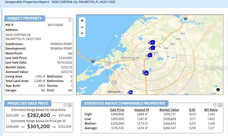 45K Total reduction... Scoop this one up...Welcome to 5630 Cortina Lane in charming Palmetto, FL! This inviting 2 bedroom plus a den, offers a comfortable living space and is perfectly priced to provide a great opportunity for families seeking a quiet residence in a community-oriented neighborhood. The kitchen features Frigidaire Appliances, with breakfast bar, custom cabinets, recessed and upper cabinet lighting and a Skylight! Spacious open floor plan with Built in Entertainment center in the living room. Sliding glass doors with uninterrupted wooded views of the natural preserve from back porch, which is perfect for a morning coffee in the screened Lanai! Large Master Bedroom has a full bath with Jacuzzi tub, walk-in closet, double vanity and linen closet. Potential 3rd Bedroom/Den/Office has double French doors. The inside utility closet has a Washer/Dryer & custom Cabinetry. The one car garage is air-conditioned. Custom clear Hurricane Shutters. Publix grocery store just down the street, and easy access to I-75 and I-275. Exclusive community of only 48 units. Located next to a golf course, "Free of Maintenance" (common areas are maintained by HOA, including roofs, landscaping, exterior exterminating). Community pool, pest control, and lawn/building maintenance/insurance are included in HOA fee. Located in the desirable Manatee County School District, you'll enjoy convenient access to quality education, local shopping centers, dining options, and recreational facilities. The home's thoughtful layout makes it ideal for both first-time buyers and those looking to downsize without sacrificing comfort. Don't miss this opportunity to call Cortina Lane home! Comparable Report Disclaimer: Based on information from the Stellar Multiple Listing Service for the period of 10/04/2025 and beyond this information may or may not include all listed, expired, withdrawn, pending or sold properties of one or more members of the Stellar Multiple Listing Service.