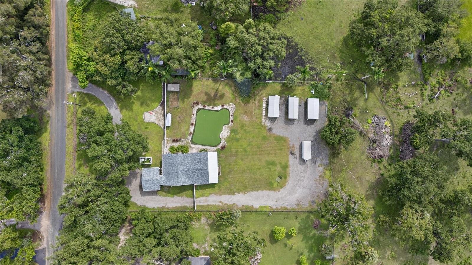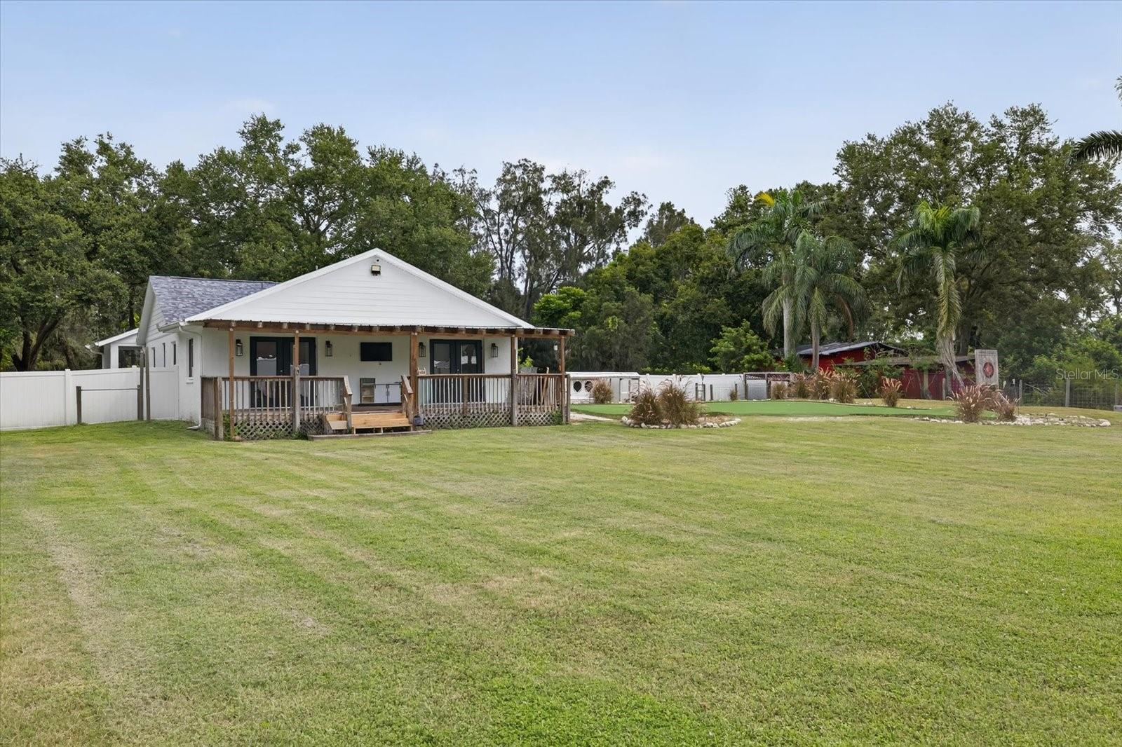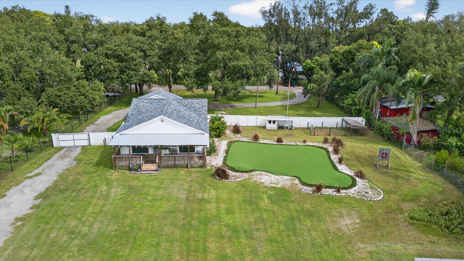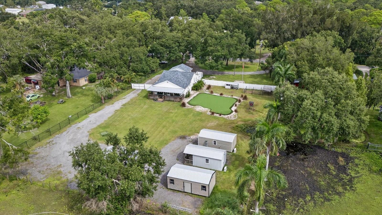 Private, quiet one-acre property in the heart of expanding residential and commercial development—greatly functional layout and endless potential. This 3 bed 2.5 bath home features an updated kitchen with walk-in pantry, renovated baths including a spacious primary shower with dual sinks, two walk-in closets plus custom shelving in every closet, and a centrally located laundry room with custom cabinetry. A large back porch serves as the perfect gathering space overlooking a fully fenced yard. Huge circle driveway and back yard drive-through access. Outdoor living shines with a 1,300 sq. ft. putting and chipping green, axe-throwing board, chicken coop, and dog pen. Three versatile outbuildings expand the use of the property: two are air-conditioned, one for storage/garage, and one is built as a true armory with steel bars throughout the walls, ceilings, doors, and windows plus battery-backup security. Another with a cozy front porch and half bath is ideal for a home gym, office, or hobby space. Energy efficiency upgrades include spray-foam attic insulation and a whisper-quiet, zone-controlled ductless mini-split system (~5 yrs), paired with newer appliances (washer, dryer, refrigerator, dishwasher ~3 yrs) and a roof about 7 yrs. Conveniently located yet tucked away, this property offers a lot today with endless potential for tomorrow.