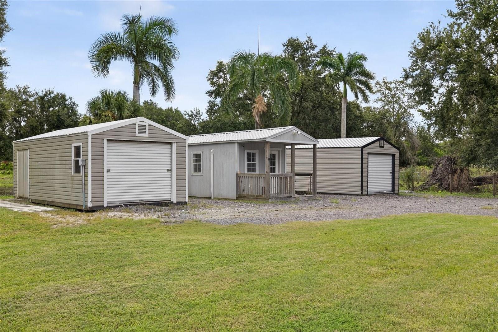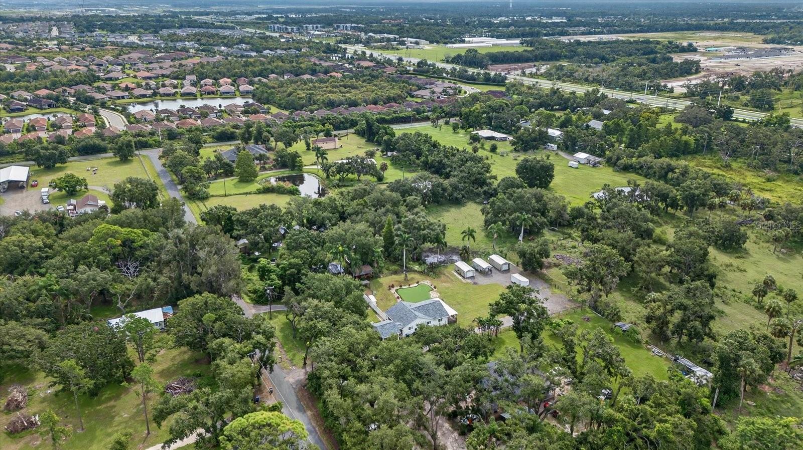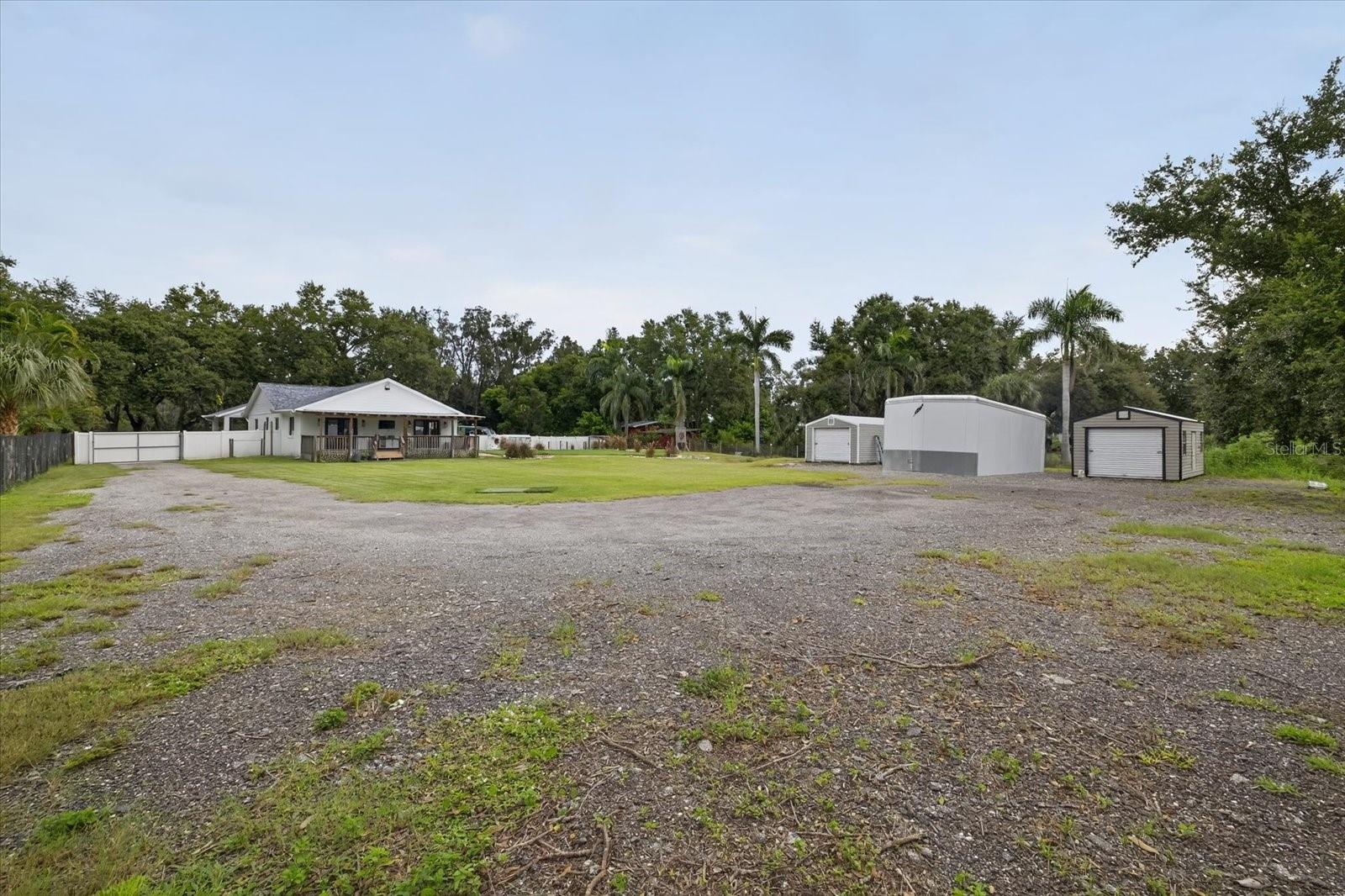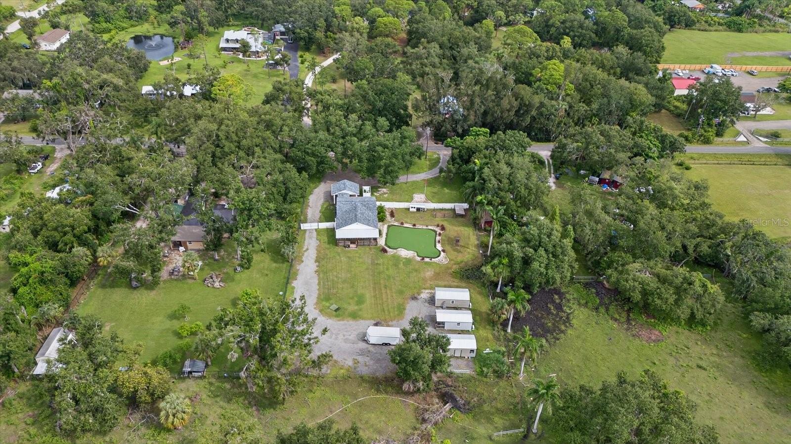 Private, quiet one-acre property in the heart of expanding residential and commercial development—greatly functional layout and endless potential. This 3 bed 2.5 bath home features an updated kitchen with walk-in pantry, renovated baths including a spacious primary shower with dual sinks, two walk-in closets plus custom shelving in every closet, and a centrally located laundry room with custom cabinetry. A large back porch serves as the perfect gathering space overlooking a fully fenced yard. Huge circle driveway and back yard drive-through access. Outdoor living shines with a 1,300 sq. ft. putting and chipping green, axe-throwing board, chicken coop, and dog pen. Three versatile outbuildings expand the use of the property: two are air-conditioned, one for storage/garage, and one is built as a true armory with steel bars throughout the walls, ceilings, doors, and windows plus battery-backup security. Another with a cozy front porch and half bath is ideal for a home gym, office, or hobby space. Energy efficiency upgrades include spray-foam attic insulation and a whisper-quiet, zone-controlled ductless mini-split system (~5 yrs), paired with newer appliances (washer, dryer, refrigerator, dishwasher ~3 yrs) and a roof about 7 yrs. Conveniently located yet tucked away, this property offers a lot today with endless potential for tomorrow.