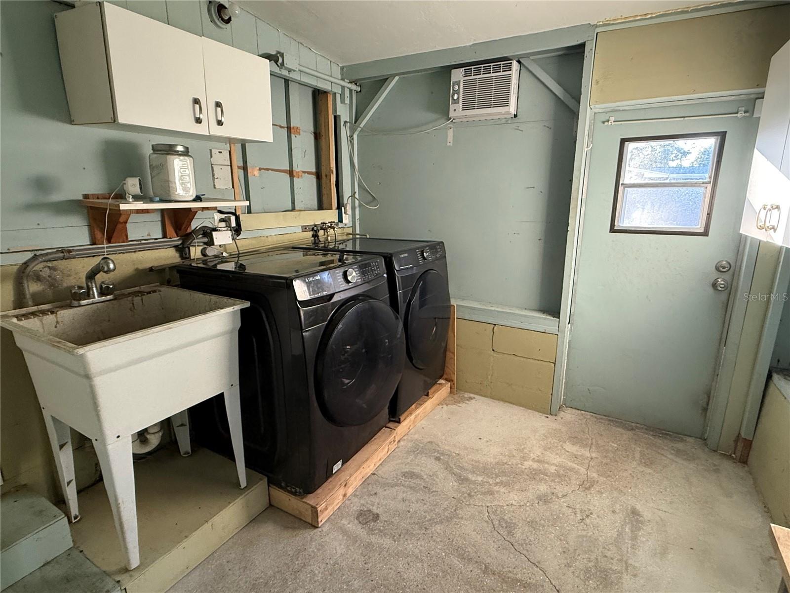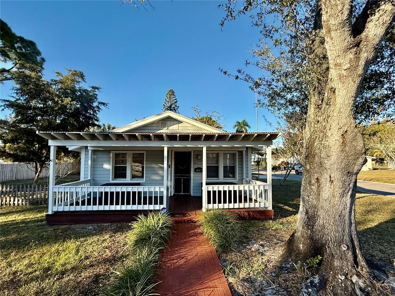 Affordable Florida Living at Its Best! Welcome home to this charming and beautifully updated bungalow that delivers big on comfort, style, and value. The bright, coastal-inspired kitchen is a dream for any home chef, featuring a classic farmhouse sink, Coastal Cupboard cabinetry, Corian countertops, newer appliances, and a breakfast bar perfect for morning coffee or intimate dinners. The spacious living room offers stylish flooring and plenty of room for entertaining guests or settling in for a cozy movie night. The primary bedroom is thoughtfully designed with an oversized walk-in closet that includes built-in closet space—ideal for a home office, nursery nook, or creative retreat. The updated bathroom shines with a new vanity, mirror & fresh paint. A true Florida room adds even more flexibility complete with convenient access to the garage workshop. Step outside to a huge fully fenced double lot, perfect for pets, play, and outdoor entertaining. Enjoy BBQs on the patio, rinse off in the outdoor shower, and store tools or toys in the shed. The attached carport keeps you dry during summer showers, while the inviting front porch is the perfect spot to relax and watch the sunset. Additional highlights include solid block construction, a metal roof (2014), newer A/C, updated windows, fresh flooring throughout. Priced right, move-in ready, and ideally located, this home truly checks all the boxes. Don’t miss your chance to claim your place in the Florida sun—schedule your showing today!