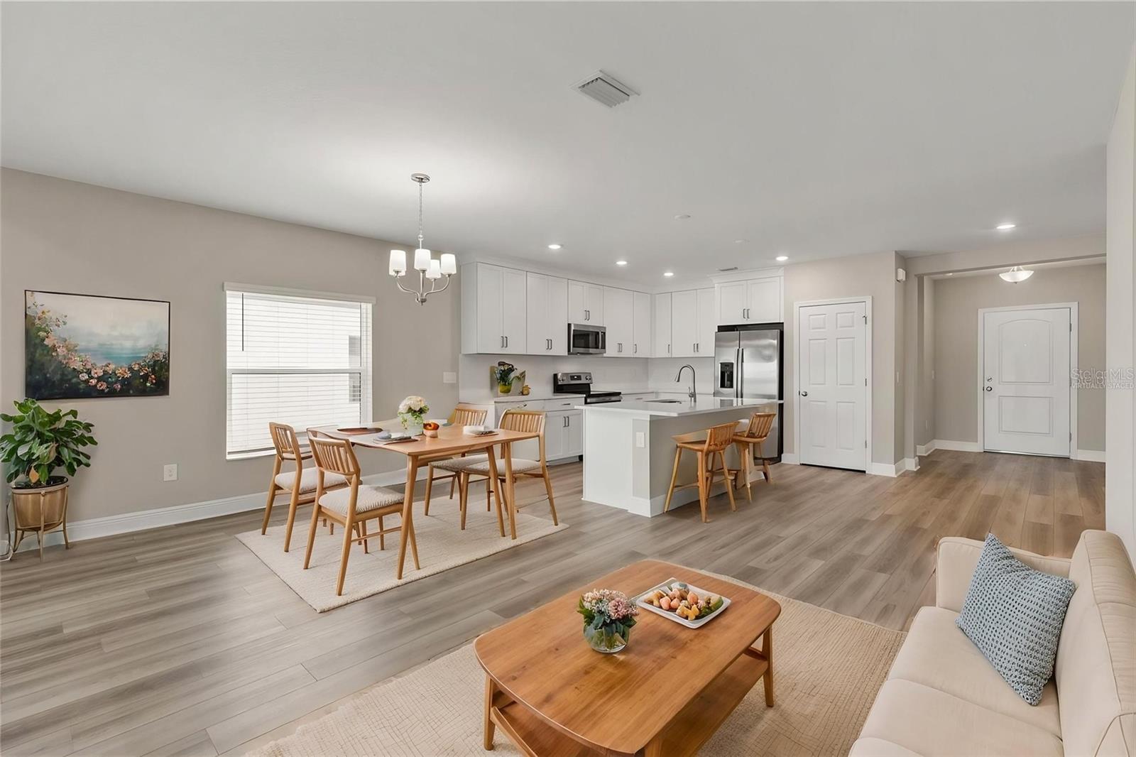 Beautiful like-new 4-bedroom, 2-bath home located in the desirable Trevesta community, featuring peaceful water views behind the home and a preserve setting at the front for added privacy. Offers 1% lender credit at closing. Built in 2022, major systems including the roof, AC, and water heater are all 2022 for added peace of mind. The open-concept layout highlights a spacious kitchen with granite countertops, stainless steel appliances, wood cabinetry, and a large center island that flows seamlessly into the main living and dining areas—ideal for entertaining. Ceramic tile runs throughout the main living spaces, while the bedrooms offer comfortable carpeting. The owner’s suite includes a generous walk-in closet and a private bath with dual vanities. A screened lanai overlooks the lake, creating a relaxing outdoor space, and the laundry room is conveniently located near the two-car garage. Residents of Trevesta enjoy resort-style amenities including a clubhouse, zero-entry pool with cabanas, fitness center, splash pad, playground, and scenic walking and jogging trails around the lakes. The community is centrally positioned with convenient access to I-75, I-275, US-41, and US-301, making it easy to reach Tampa, St. Petersburg, Bradenton, Sarasota, Lakewood Ranch, and nearby Gulf Coast beaches. Ideal for first-time buyers, seasonal residents, or investors looking for a well-maintained home in a vibrant community.