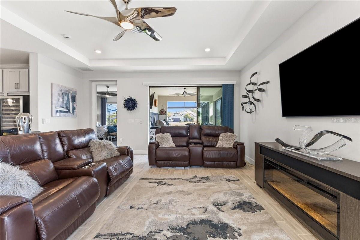 Welcome to an exceptional luxury retreat where elegant design, thoughtful upgrades, and breathtaking water views come together to create a truly remarkable home. This beautifully appointed two-bedroom residence with a versatile flex room/den offers refined comfort and effortless indoor-outdoor living. A stunning upgraded entry door sets the tone as you step into a light-filled interior designed for both everyday living and sophisticated entertaining. At the heart of the home is a dream kitchen featuring solid wood cabinetry, quartz countertops, an expansive island and a custom walk-in pantry with built-ins. The spacious open floor plan flows seamlessly into the main living and dining areas, creating an inviting space for gatherings large and small. The home’s outdoor living experience is nothing short of spectacular. The extended lanai showcases a fully equipped outdoor kitchen designed for entertaining in style. This impressive space features granite countertops, stainless steel cabinetry, a built-in refrigerator, sink with running water, grill, smoker, generous prep space, and a grand island with seating for guests. Your private resort-style oasis awaits. The stunning heated pool with sun shelf, water feature, and private hot tub provides the perfect place to relax and unwind year-round. Sweeping panoramic pond views wrap from the back of the home around the side, creating a peaceful and private waterfront setting rarely found. Inside, thoughtful upgrades continue with custom built-ins in the primary suite closet, along with power night blinds in the primary bedroom for added comfort and privacy. The oversized tandem garage easily accommodates two vehicles plus a golf cart, offering ample storage and convenience. Residents enjoy access to an amenity-rich, resort-style community featuring two pools with hot tubs, pickleball, tennis and bocce courts, a clubhouse and fitness center, billiards room, two dog parks, and a vibrant social calendar filled with community events and so much more. HOA fees include internet, cable, lawn maintenance, and full access to the community amenities, allowing for a truly effortless lifestyle. Perfectly located near premier shopping, dining, and entertainment, with convenient access to Tampa and Sarasota International Airports, this home offers the ideal balance of luxury, lifestyle, and location. This extraordinary property delivers the ultimate Florida lifestyle—luxury, privacy, and resort-style living in one exceptional home.