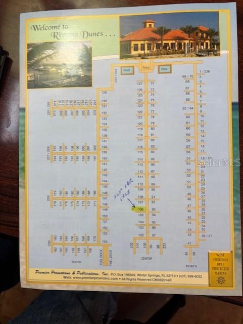 Boat slip 65' by 21' allowing vessels up to 72'.Riviera Dunes Marina is the premier marina on the west side of Florida as well as the best "hurricane hole" on the west side of Florida. Located 10 miles up Tampa Bay and then the Manatee River from the Gulf of America, also greatly lessens the impact of any storm surge. The marina is constructed of floating concrete docks. This allows you to easily secure your vessel without having to worry about tidal changes! Amenities include two onsite fresh water swimming pools, one for family and the second for adults. The Dockside Grille and Social Bar is also located directly at the end of center dock providing an inviting place to meet friends for cocktails, dining as well as entertainment and dancing 4 nights a week to live music on the patio. For personal gatherings and special events, there is a large social dock complete with 3 gas grills and tables, seating, umbrellas for approximately 60 to 70 people. There are also bathrooms/showers located on the side of the restaurant building as well as laundry facilities with brand new washers and dryers that accept credit and debit cards, no need to worry about quarters. The marina itself is in a very safe, secure location and also has controlled, gated access to the docks. The dock staff is of the highest quality and more than willing to assist in any needs you may have. There is also onsite fueling with prices maintained and monitored weekly to ensure they are below all the local public marinas. Should you wish to purchase a slip as an investment for a future need, the marina office will actively manage your slip in their rental pool. They only charge a 7% management fee, meaning, you keep $.93 of every dollar that comes in! Live aboard is also a possibility as the marina has 55 live abord permits available on a first come, first served basis. You will also find a true sense of "community" at Riviera Dunes as you meet and form bonds with your fellow boaters!