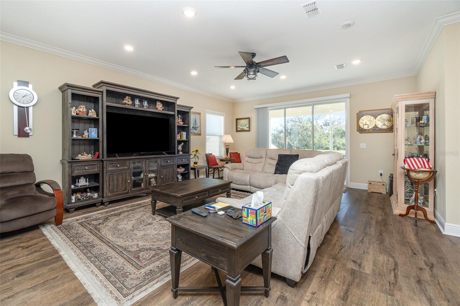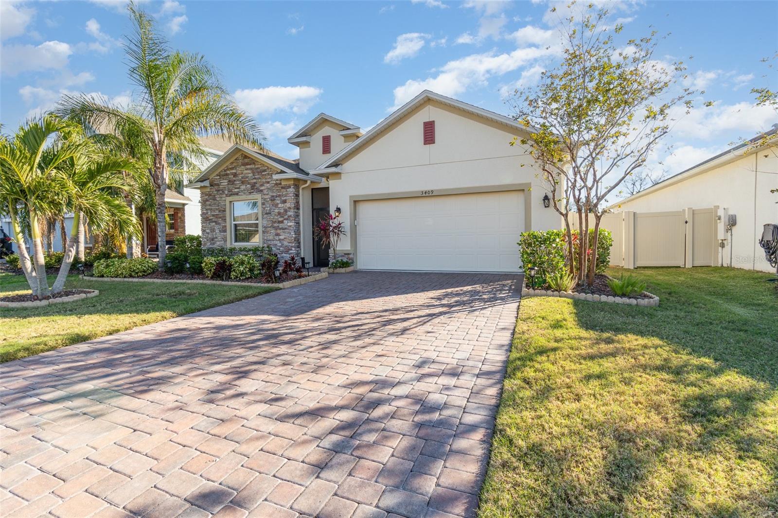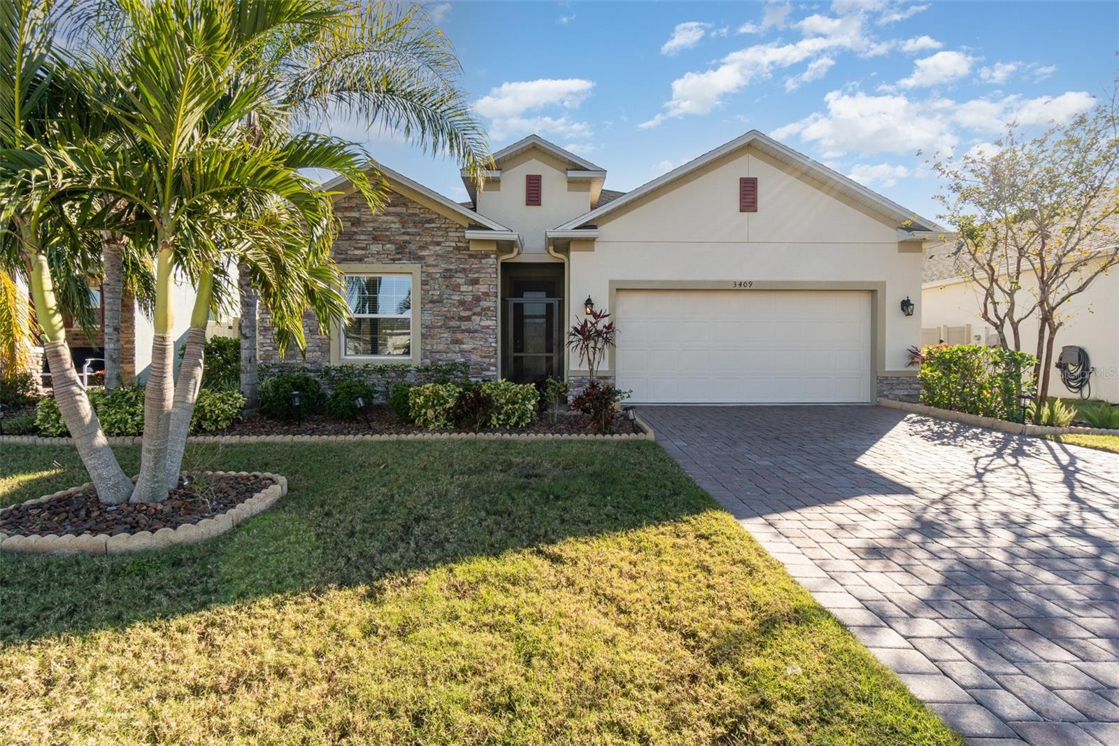This beautiful 4-bedroom, 2-bathroom home, built in 2019, is move-in ready and offers a wealth of upgrades and features! Situated on a completely fenced lot with a serene water view and no rear neighbors, you'll enjoy plenty of privacy. The stone façade front gives the home a stylish, elegant look, while the designer gourmet kitchen is truly a cook's dream, complete with soft-close cabinets, a large pantry, granite countertops, and stainless steel appliances. The main living areas and primary bedroom feature luxury vinyl flooring with tall baseboards, while the other three bedrooms are carpeted for added comfort. The home also boasts 8-foot tray ceilings in the living room, hallway, and primary bedroom, giving it an open and spacious feel. The primary bedroom has a large walk-in closet, a ceiling fan, water views, and a luxurious ensuite with dual sinks, a soaking tub, and a large, beautifully tiled shower with three showerheads, including an overhead rainhead—perfect for relaxation. Enjoy outdoor living on the large screened-in back porch, perfect for taking in the water views while staying cool in the shade. The spacious fenced yard offers plenty of room for a pool and space for your furry friends to run around. With a convenient 3-way split floor plan and an interior laundry room, this home has everything you need for modern living. Located in a quiet cul-de-sac neighborhood with no thru traffic, it's just a short drive to the Skyway Bridge, Ellenton Outlet Mall, and major cultural destinations like St. Petersburg, Lakewood Ranch, and Tampa’s International Airports. This home has it all—privacy, luxury, and convenience!