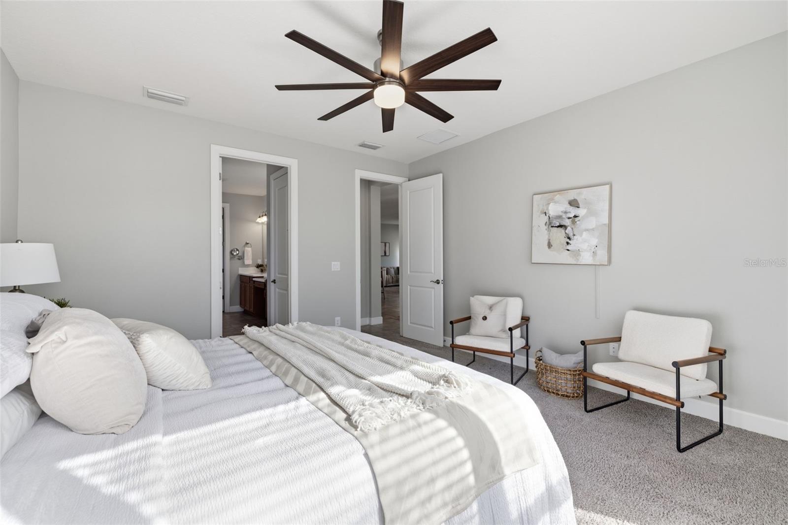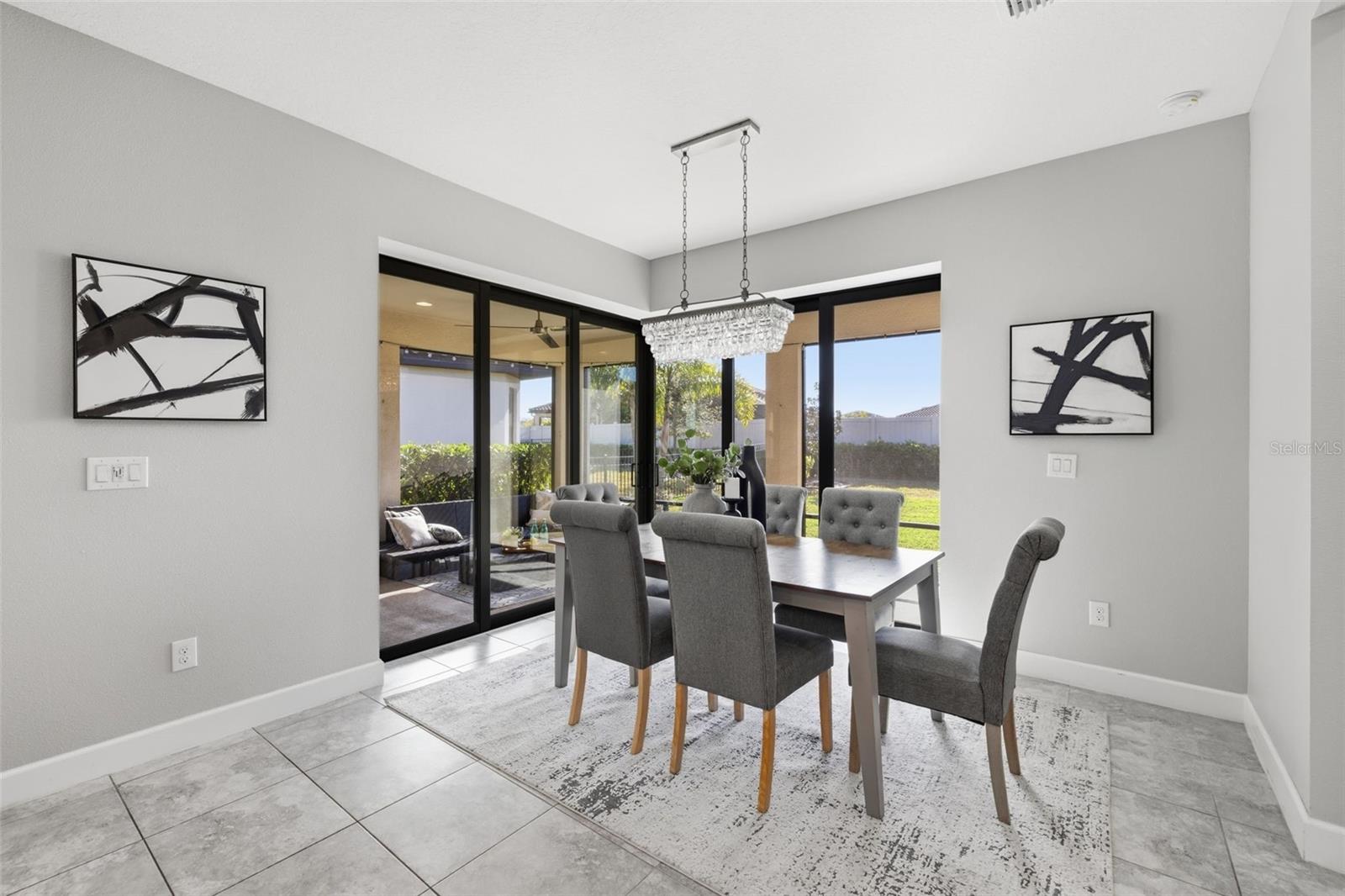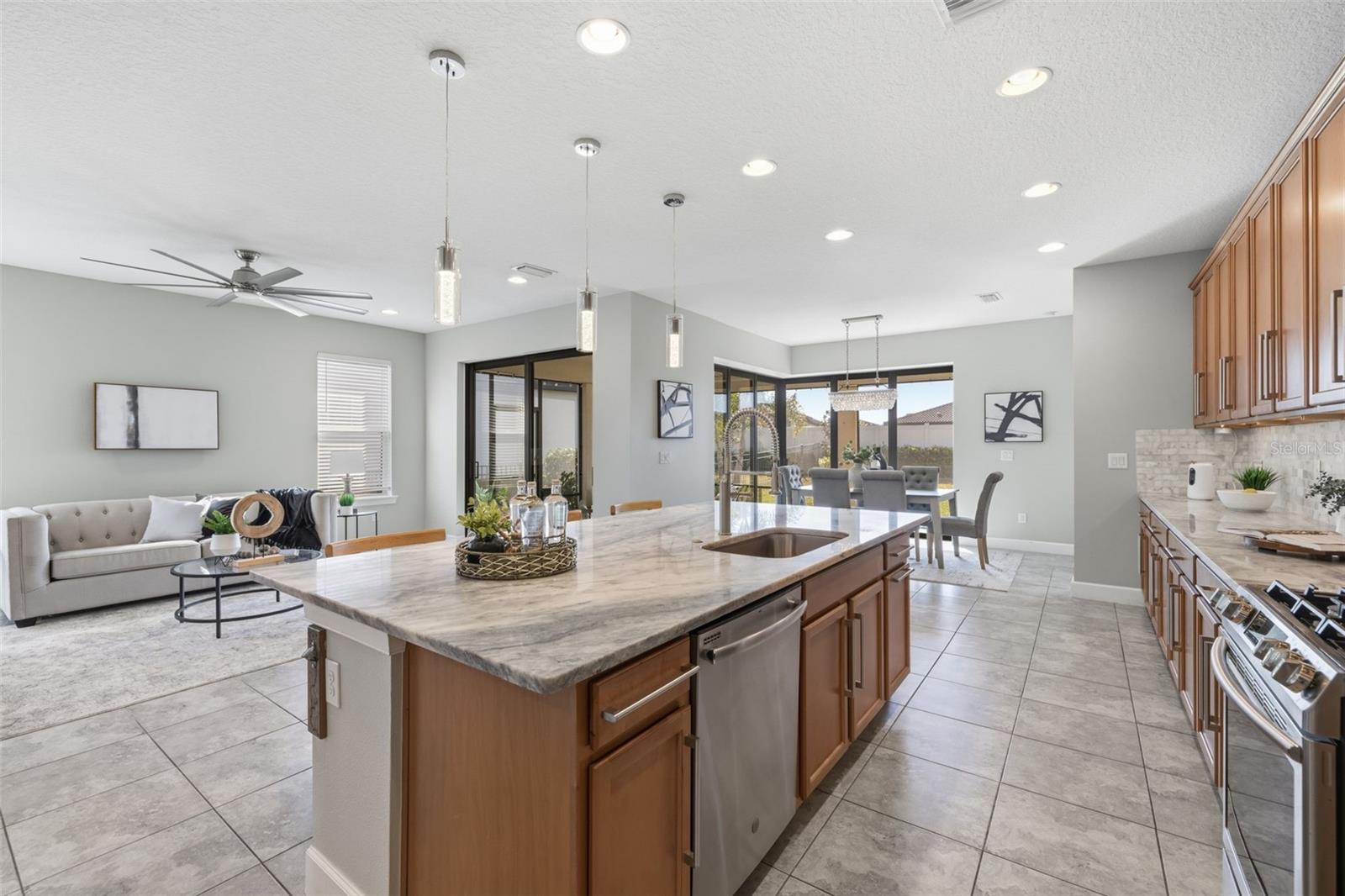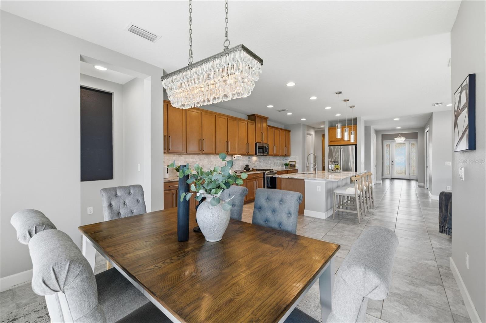 Come and enjoy luxury living at 5263 Morey Farms Loop in Palmetto, Florida, nestled within the highly sought-after community of Esplanade at Artisan Lakes. This is more than a home—it’s a lifestyle. Built in 2020 and enhanced with extensive, high-end upgrades, this rarely available Santini model offers 2,203 square feet of beautifully curated living space with three bedrooms and two and a half bathrooms. With the level of improvements throughout, it feels as pristine and refined as new construction. As you arrive, the expanded extra-wide driveway and oversized two-car garage immediately make an impression, complete with a stunning epoxy-coated floor that blends durability with elegance. Every detail has been thoughtfully considered to elevate both style and function. The gourmet kitchen is truly the heart of the home, featuring a stainless steel gas stove, 42-inch cabinetry, creamy quartz countertops, a generous oversized island, and all new appliances. A custom-designed pantry offers exceptional extended storage. The kitchen flows effortlessly into the open living and dining areas, creating a seamless environment ideal for entertaining or simply enjoying everyday life. Custom interior lighting fixtures illuminate the home beautifully, while ceiling fans in every bedroom ensure year-round comfort. Speaking of the Santini model, this floor plan offers a feature that truly sets it apart within Esplanade at Artisan Lakes. The two triple sliders in the dining area, along with the double slider in the main living space, fully retract to open the home completely to the lanai. When opened together, they dissolve the boundary between indoors and outdoors, transforming the entire living space into one expansive, flowing environment. Natural light pours in, fresh air circulates freely, and the home becomes an entertainer’s dream—where the kitchen, dining room, living area, and screened lanai merge into one stunning indoor-outdoor retreat. This seamless integration is a signature design element unique to the Santini model and truly captures the essence of Florida living.