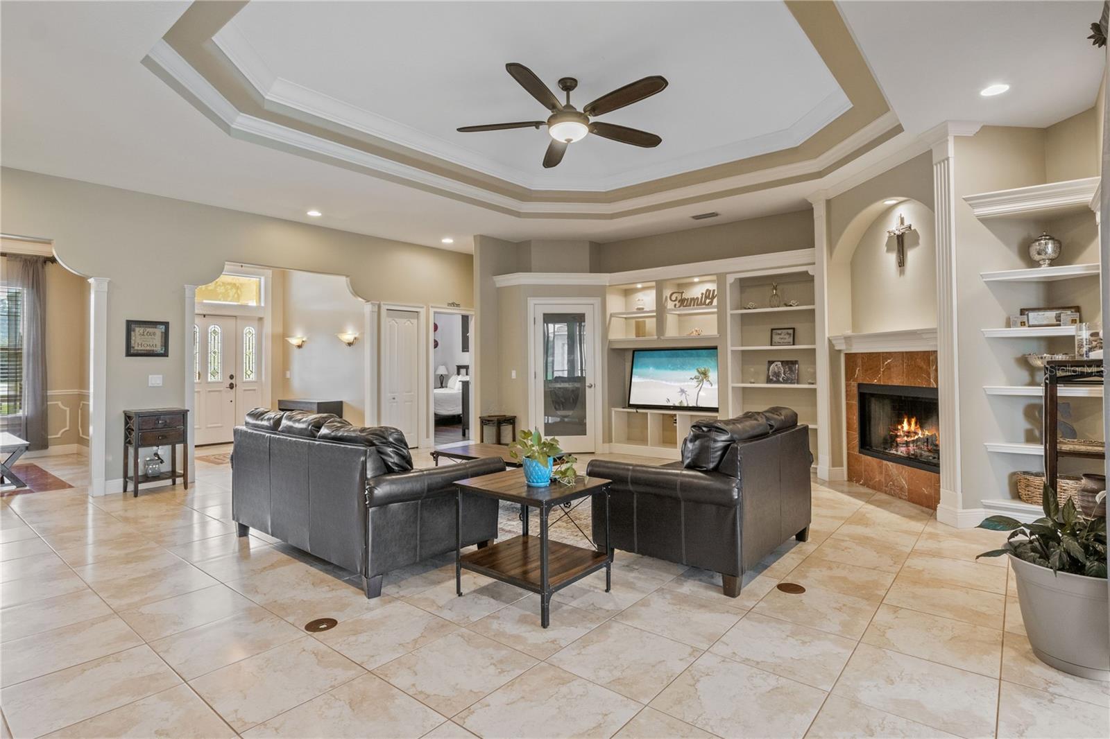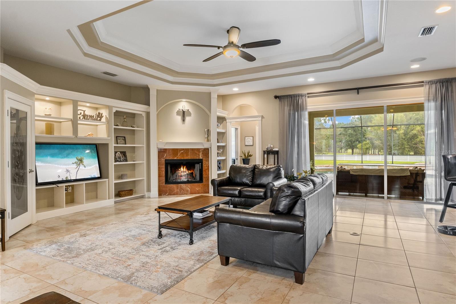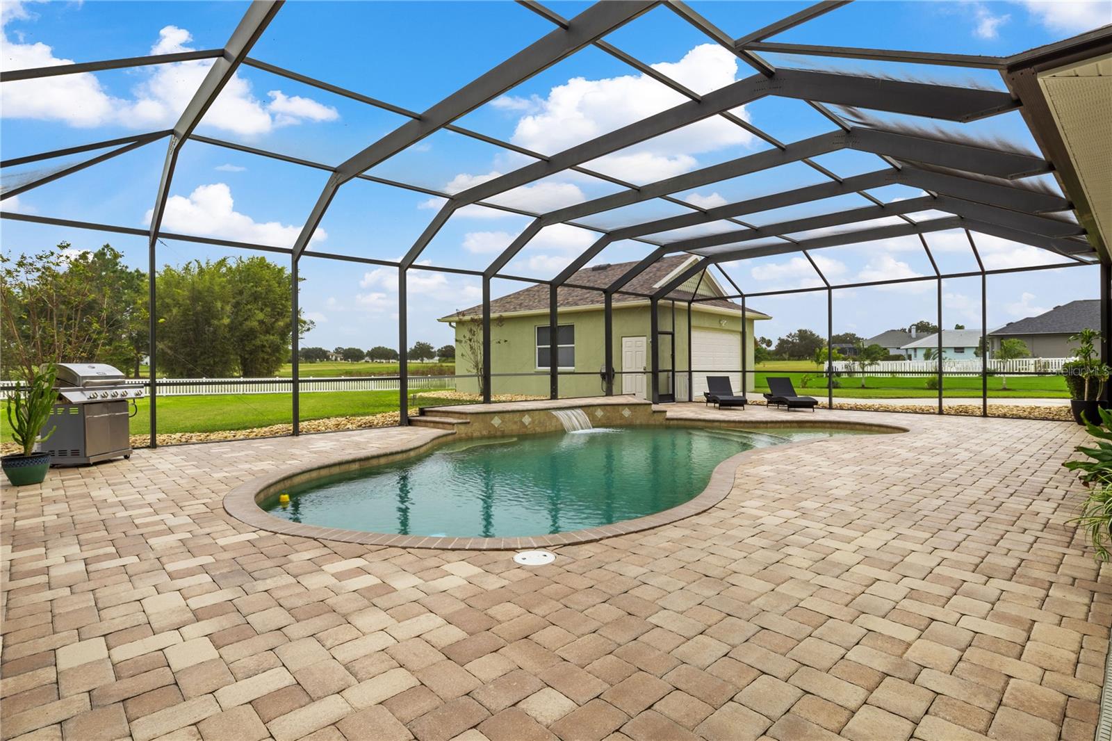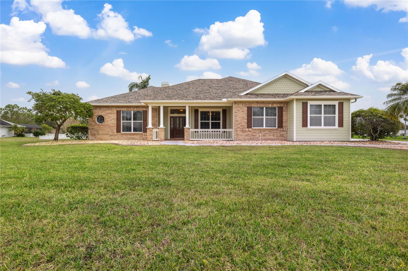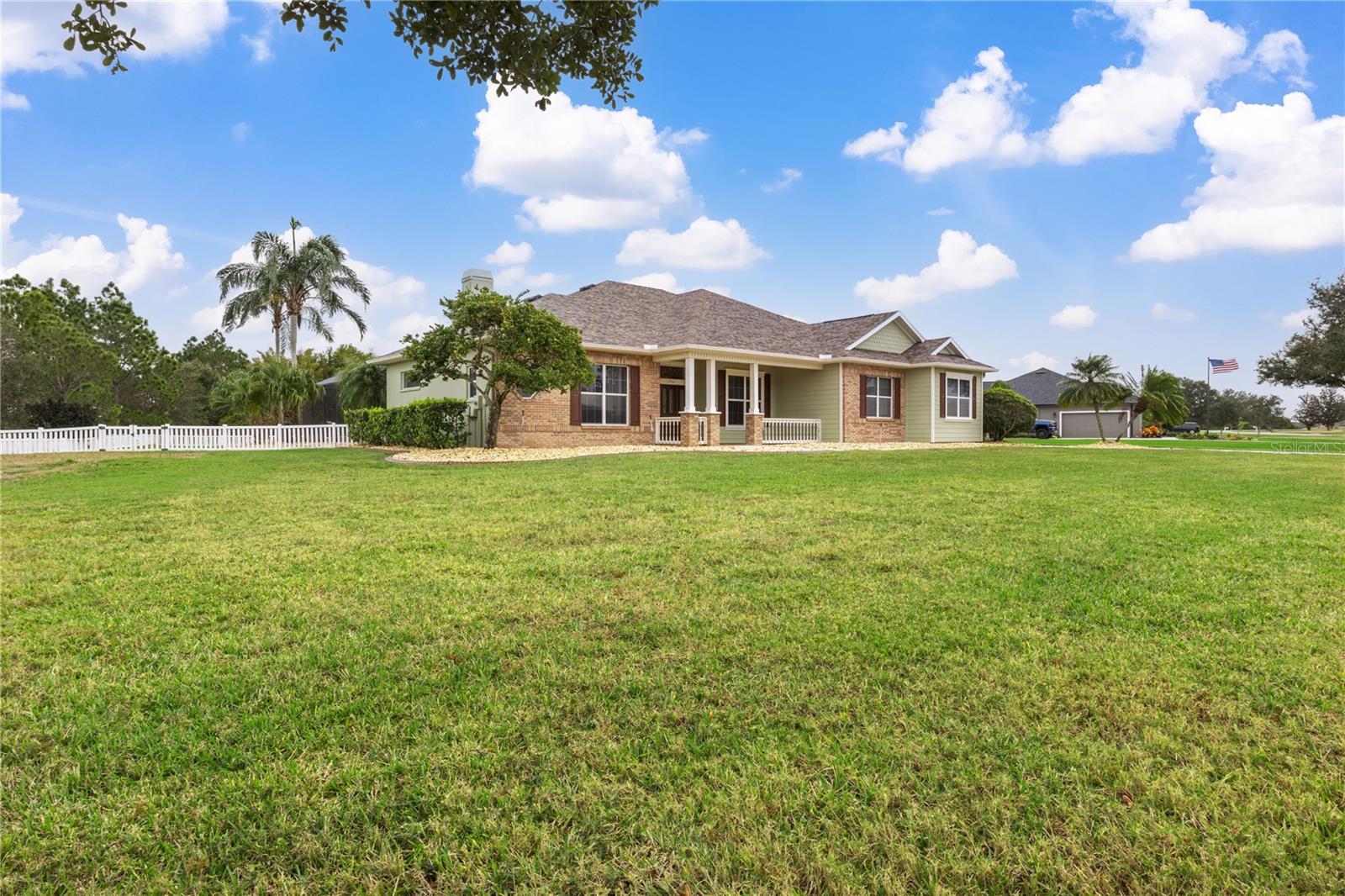 This home sits on a private one-acre lot in a cul-de-sac, featuring 3 bedrooms plus an office/den, 2.5 baths, an oversized side-loading 2-car garage, and a separate 800 sqft detached garage. The foyer opens into a spacious great room with a wood-burning fireplace and large sliders overlooking a waterfall in the enclosed saltwater pool. The kitchen boasts ample cabinets, a central island, and a walk-in pantry with a new GE Café refrigerator. The split plan includes 2 bedrooms sharing a Jack & Jill bathroom and a well-appointed office with built-in desk and shelves. The master bedroom offers plantation shutters, a reading area, and pool access, with a large walk-in closet and ensuite featuring dual vanities, a walk-in shower, and garden tub. Throughout the home, find intricate details like tray ceilings, crown molding, and chair rails. Enjoy the Florida lifestyle with seamless indoor/outdoor flow and a saltwater pool maintained by a Pool Pilot system. The fenced backyard overlooks a pond and greenbelt, offering privacy. The detached garage is ideal for a workshop or car collection. Unique features include a private well for the sprinkler system, a new roof, landscaping, and septic leach field, plus whole-house water softener and central vacuum system. Located in Foxbrook with no CDD fees and low HOA dues, centrally located for easy access to Tampa, St. Petersburg, beaches, and Sarasota. Come see this "Home sweet Home."