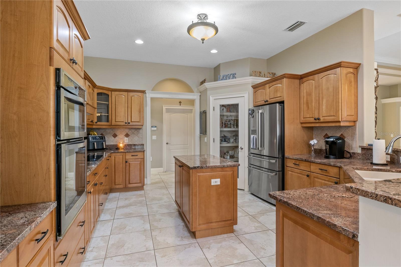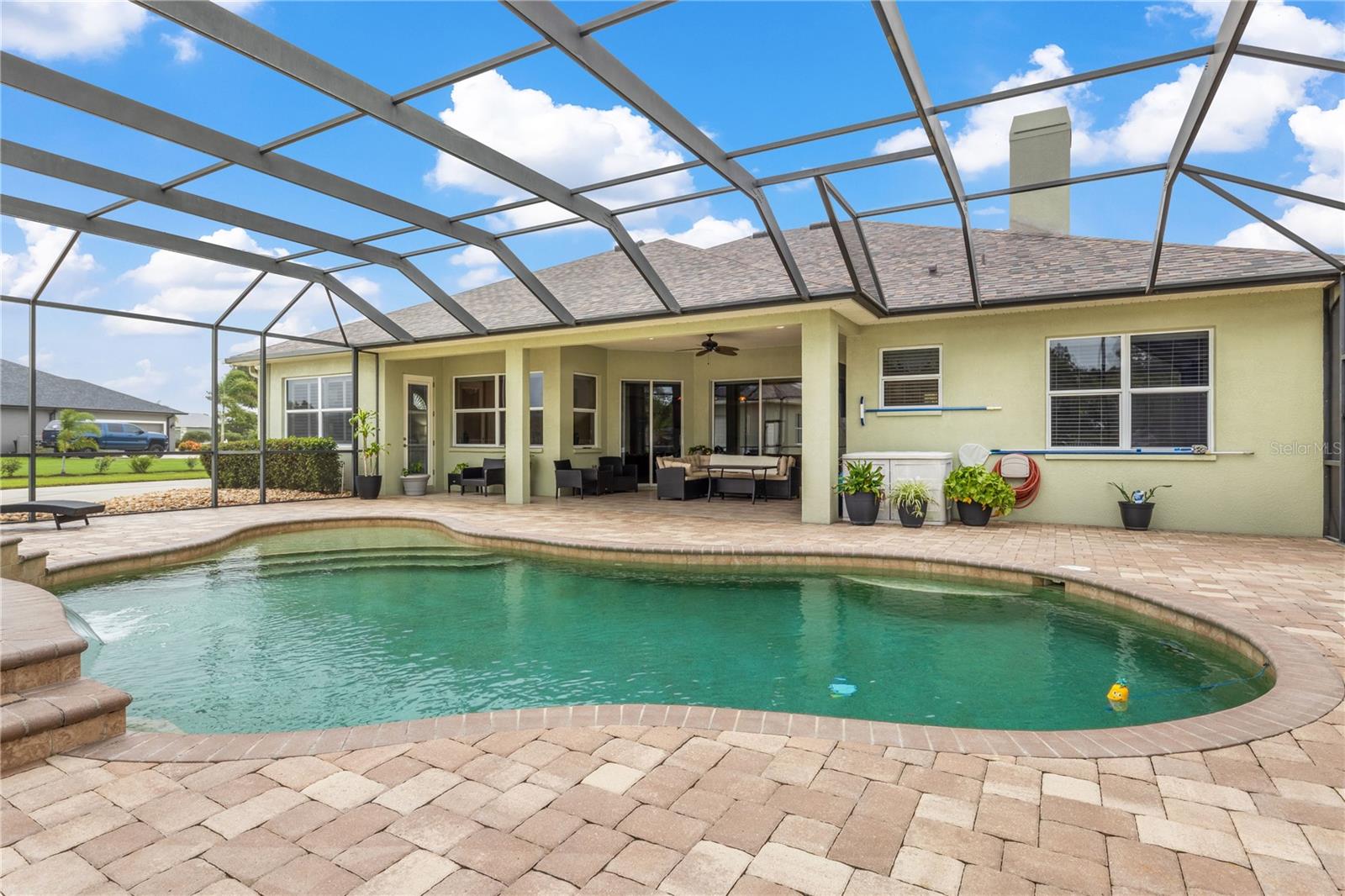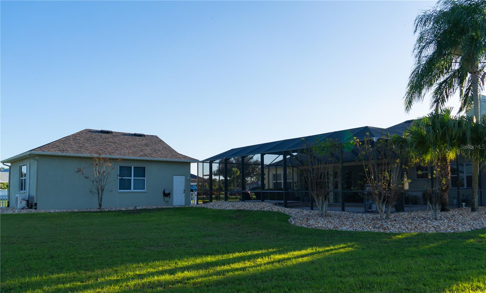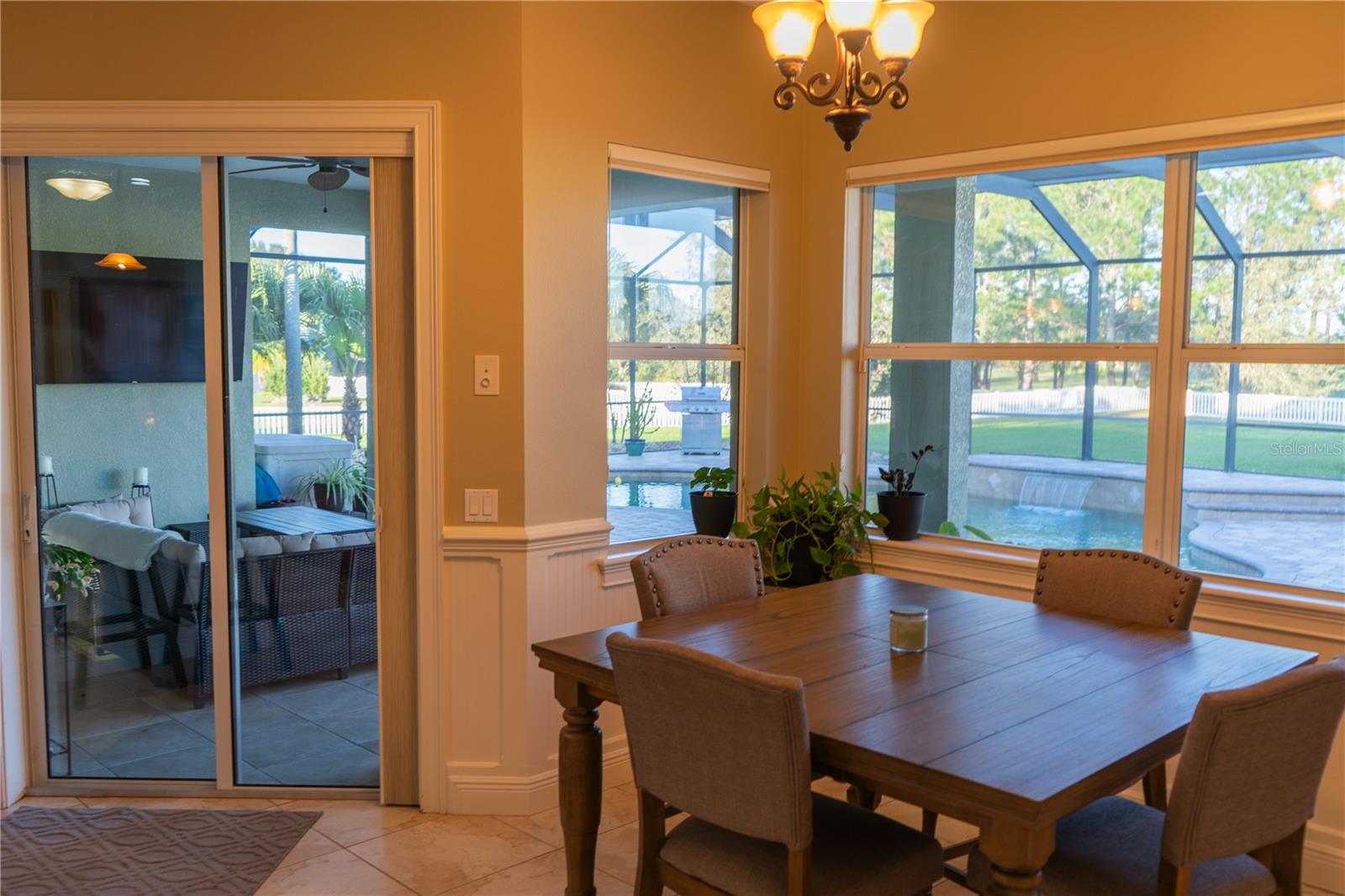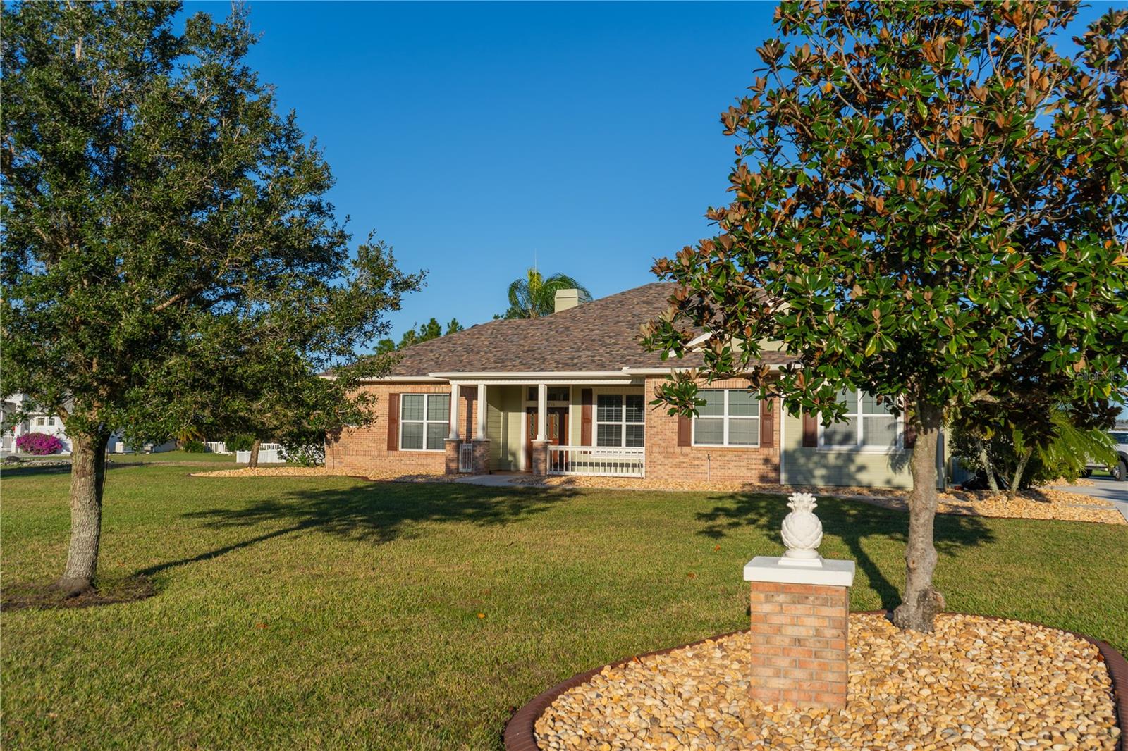 This home sits on a private one-acre lot in a cul-de-sac, featuring 3 bedrooms plus an office/den, 2.5 baths, an oversized side-loading 2-car garage, and a separate 800 sqft detached garage. The foyer opens into a spacious great room with a wood-burning fireplace and large sliders overlooking a waterfall in the enclosed saltwater pool. The kitchen boasts ample cabinets, a central island, and a walk-in pantry with a new GE Café refrigerator. The split plan includes 2 bedrooms sharing a Jack & Jill bathroom and a well-appointed office with built-in desk and shelves. The master bedroom offers plantation shutters, a reading area, and pool access, with a large walk-in closet and ensuite featuring dual vanities, a walk-in shower, and garden tub. Throughout the home, find intricate details like tray ceilings, crown molding, and chair rails. Enjoy the Florida lifestyle with seamless indoor/outdoor flow and a saltwater pool maintained by a Pool Pilot system. The fenced backyard overlooks a pond and greenbelt, offering privacy. The detached garage is ideal for a workshop or car collection. Unique features include a private well for the sprinkler system, a new roof, landscaping, and septic leach field, plus whole-house water softener and central vacuum system. Located in Foxbrook with no CDD fees and low HOA dues, centrally located for easy access to Tampa, St. Petersburg, beaches, and Sarasota. Come see this "Home sweet Home."