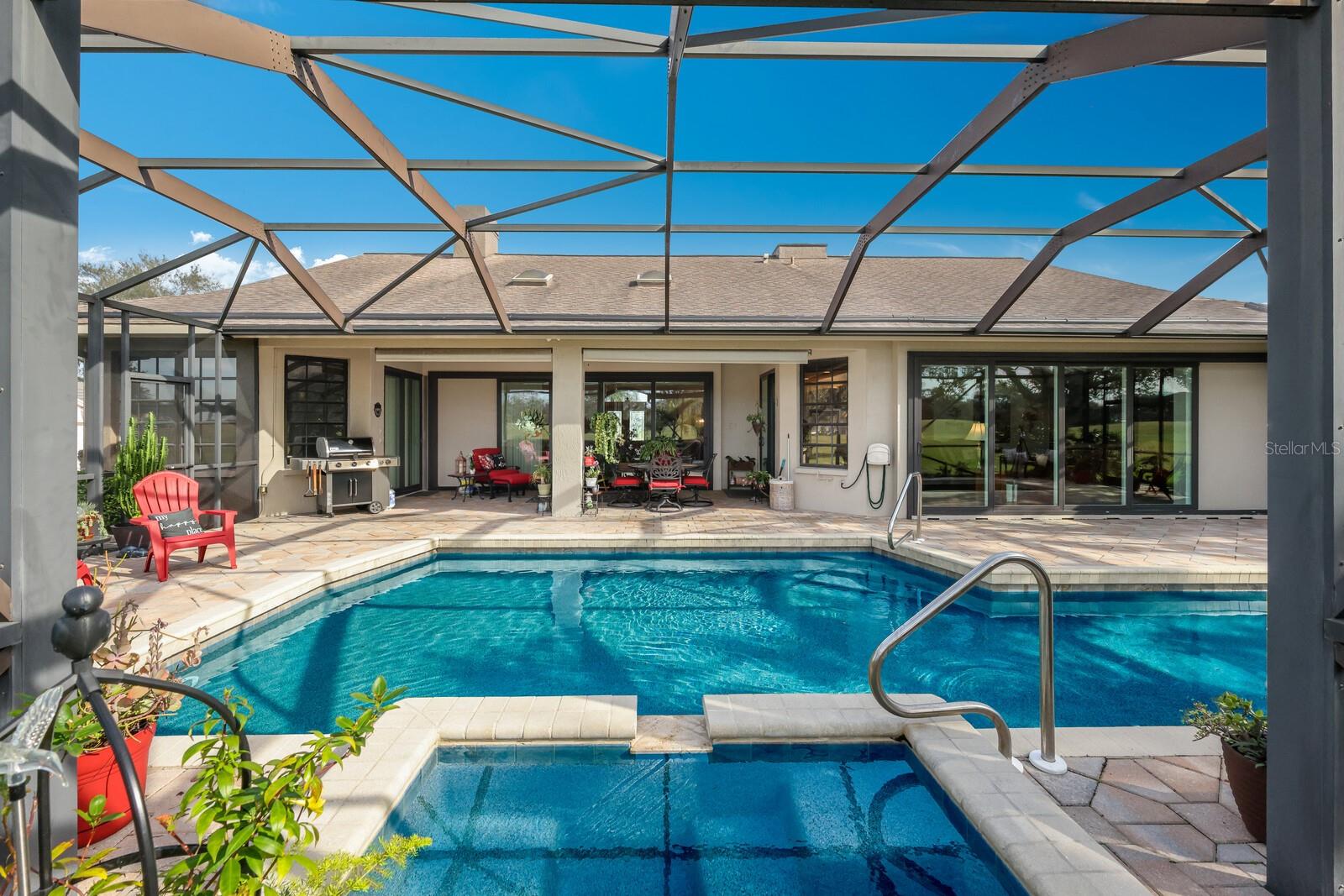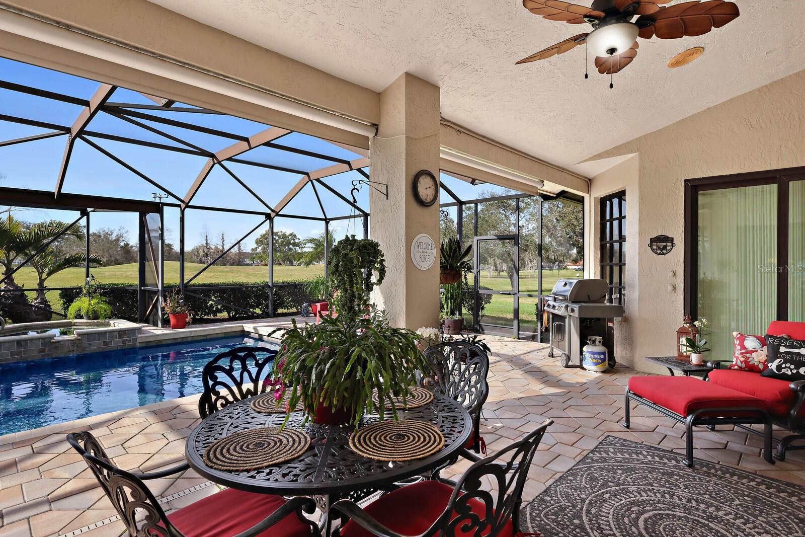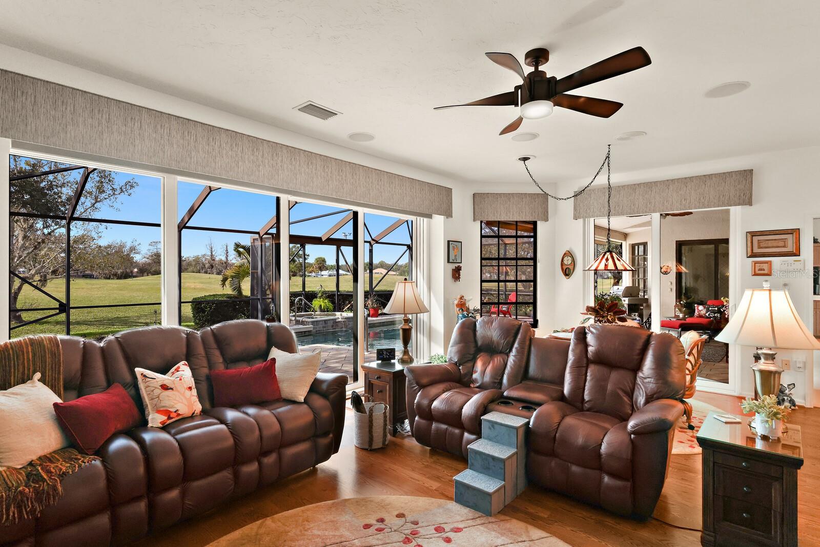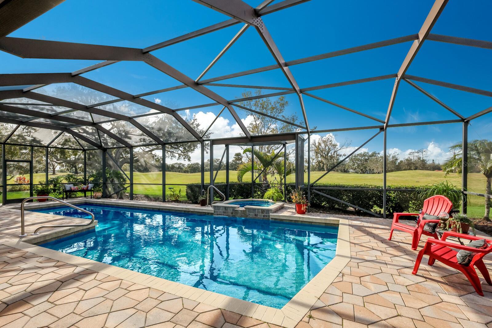 One or more photo(s) has been virtually staged. Make your mark on this estate-sized home in River Wilderness. Boasting over 3000 square feet on a nearly ½ acre lot, this residence offers space to customize your ideal home. Things you won't want to change: The location...Situated on the 8th tee of The Club at River Wilderness golf course, this home offers breathtaking views; Lap pool... including a large lanai with updated screens; New roof...updated in January 2024; Newer A/C systems...updated in 2018 (main unit) and 2022 (primary suite unit); Newer hot water heater...updated in 2017. The home was remodeled to the highest standards in 2016, providing a great start to its next owners with solid wood cabinetry in the kitchen and bathrooms, high-end appliances in the kitchen, and state-of-the-art plumbing fixtures in the bathrooms. Oversized 2-car garage with a space and separate door for golf cart. The enormous primary suite features two walk-in closets, a bay window feature, sliding doors to the lanai, and a big bathroom. The two additional bedrooms are large - with one providing an opportunity to create an ensuite feature by converting the pool bath and closet which share a wall. The formal dining room could be reimagined as a fourth bedroom or office. Add your own touch to the decor, flooring and paint and this is a value-buy with a luxury outcome. Membership at The Club at River Wilderness is optional, featuring golf, tennis, pickle ball, gym, lap pool, and many social activities. Find your place in Parrish, FL – a perfectly positioned community to Bradenton, Sarasota, St. Pete and Tampa. River Wilderness is a peaceful community with spacious lots, unique homes, and a true sense of community.