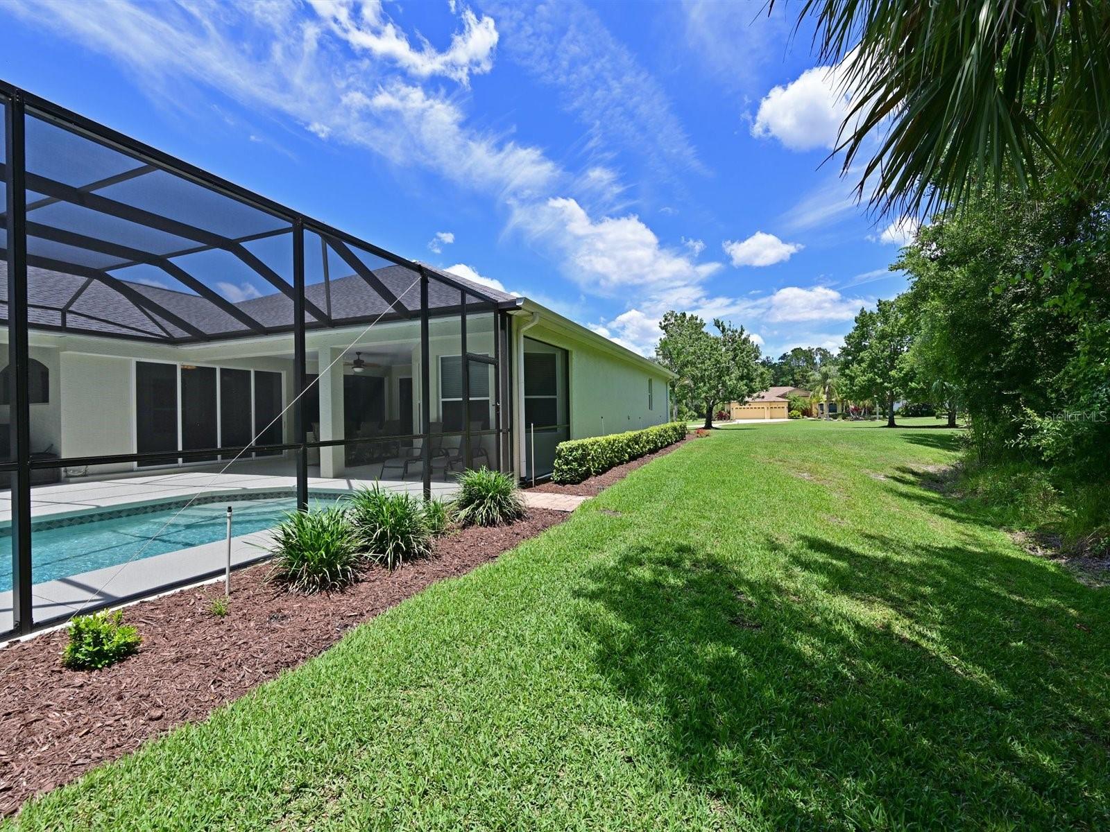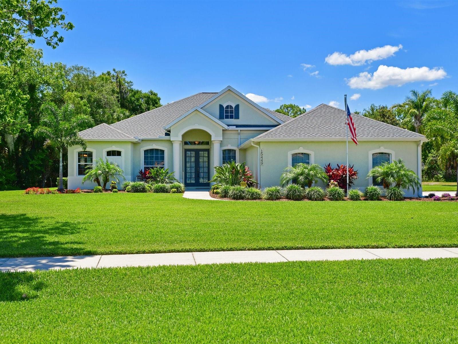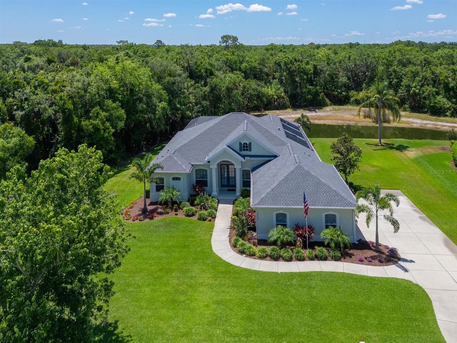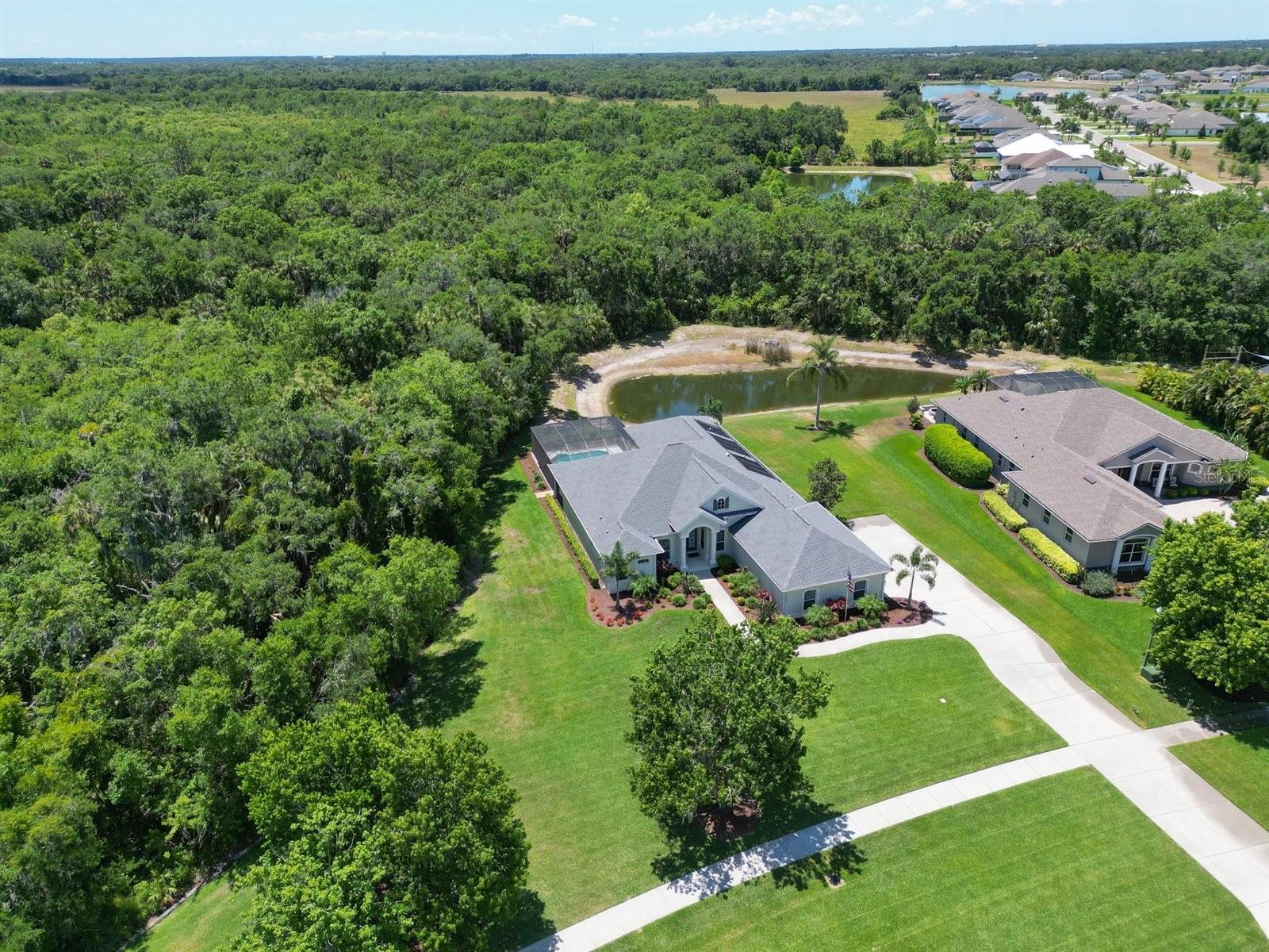 Complete privacy nestled on a full acre best describes this executive home in the tranquil community Twin Rivers of Parrish, FL. This stunning property, built in 2006, has 2672 sq ft and offers an unparalleled living experience with its complete privacy, scenic water view, and positioned adjacency to a conservation area. Enjoy the beauty and serenity of nature right at your doorstep while benefiting from modern comforts and luxurious amenities. Upon entering this the double entry doors of this magnificent residence, you are aware of the open and airy floor plan enhanced by soaring 9 & 10-foot ceilings that are adorned with crown molding and wide base floor moldings, adding a touch of elegance and sophistication. The home features four spacious bedrooms and three full baths, providing ample space for family and guests. The interior has been thoughtfully updated with new appliances, new backsplash, new floors, a new roof, and a new HVAC system, ensuring a move-in-ready experience with no detail overlooked. The heart of this home is the exquisite kitchen, equipped with recent state-of-the-art appliances and designed for both functionality and style. A gas cook top in the kitcehn makes all gourmet cooks happy! Adjacent to the kitchen is a formal dining room perfect for hosting dinner parties and special occasions. The formal living room offers a refined space for entertaining, while a private den provides a quiet retreat with views overlooking the Pebbletek saltwater pool that also has a lovely waterfall feature. Speaking of the pool, this home boasts an elegant saltwater solar-heated pool surrounded by lush landscaping, creating an idyllic outdoor oasis. The pool area is perfect for relaxing on sunny days or entertaining guests in a resort-like setting. The property also includes a security system, built-in closet designs, and several transom lights that enhance the natural light throughout the home. The master suite is a true sanctuary, featuring a luxurious walk-in shower and a soaking tub, providing a spa-like experience at home. Each additional bedroom is generously sized, offering comfort and privacy for everyone in the household. There is even private office space with hardwood floors and french doors for the work from home types. A unique feature of this property is the expansive three-car side entry garage. The garage has extended length to easily accommodates a long bed truck or boat. Get that golf cart you always wanted..there is plenty of space. Recent interior and exterior repainting add a fresh touch, ensuring there is nothing left to do except move in and enjoy the incredible lifestyle this home offers. Parrish is a thriving community experiencing significant growth, with new schools and fantastic amenities. Its prime location offers convenient access to Tampa, St. Petersburg, and Sarasota, all within an hour's drive. Experience the perfect blend of luxury, comfort, and convenience at 15449 Mulholland Rd. This exceptional property offers a unique opportunity to own a piece of paradise in one of Florida's most desirable areas. Don't miss out on making this dream home your reality. Schedule a private showing today and discover the unparalleled charm and elegance of this executive estate.