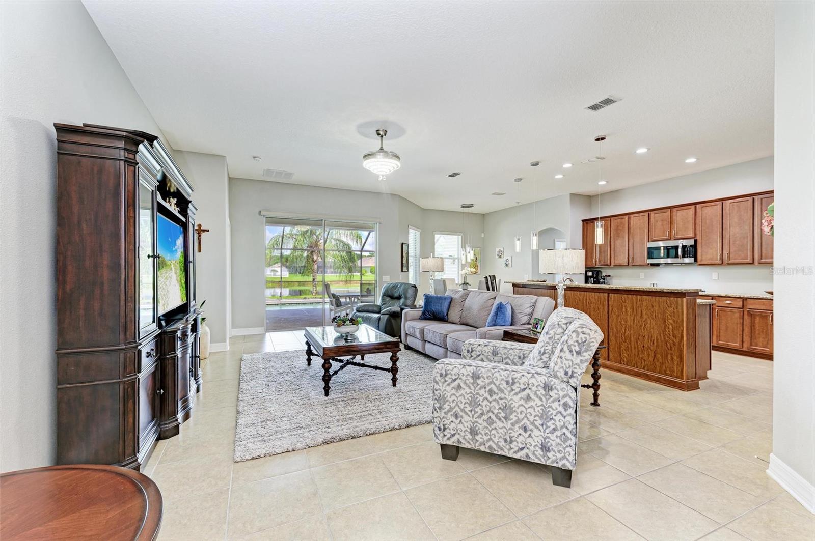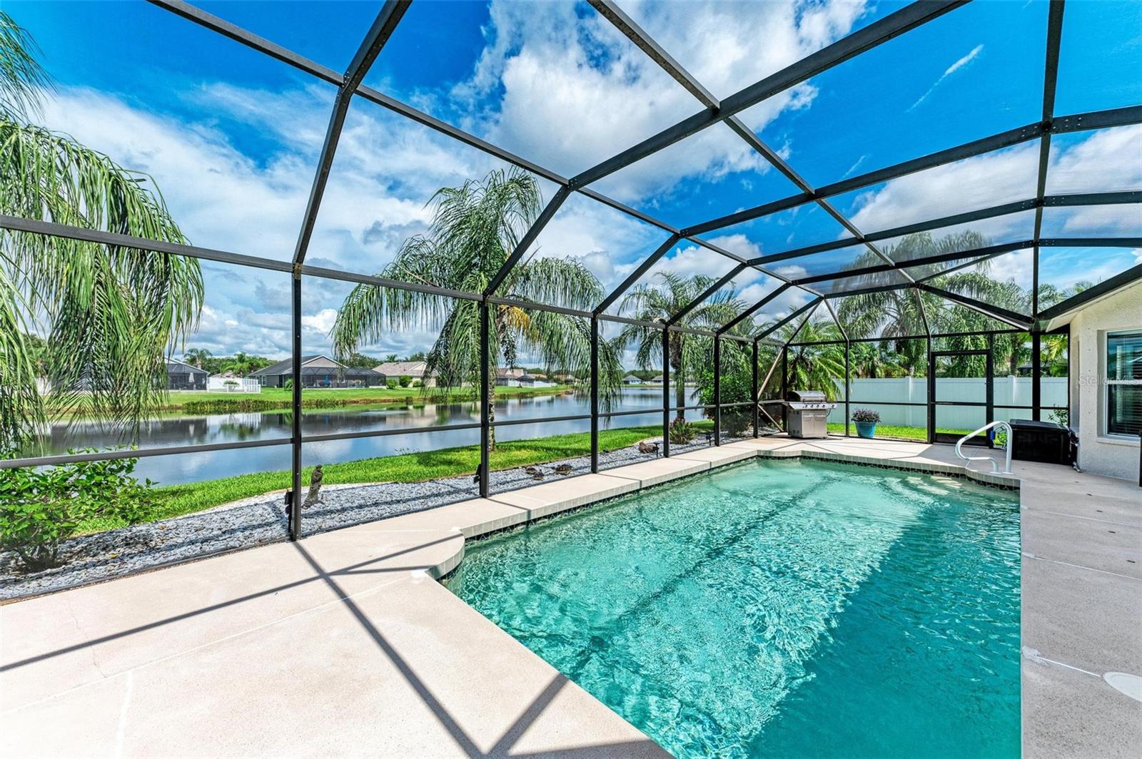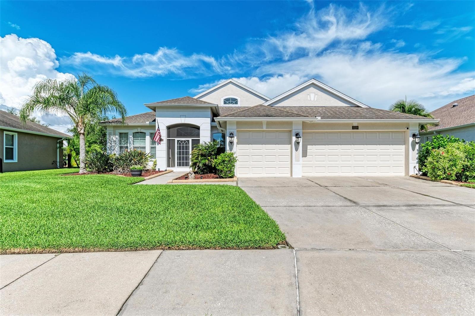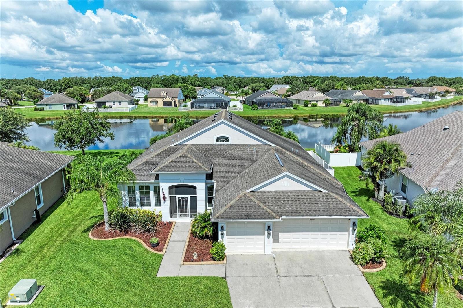 Presenting a stunning new listing in the sought-after Lakeside Preserve community! This immaculate home, just under 2,700 square feet, has 4 spacious bedrooms and 3 bathrooms. The open floor plan features high ceilings, creating a bright and airy atmosphere throughout the large family area, which seamlessly flows into the gourmet kitchen—perfect for entertaining. A formal dining room and an office/study offer versatile spaces for dining and work. The home is designed with ample storage, including an air-conditioned three-car garage with epoxy floors and a spacious floored attic. Modern conveniences abound, with a tankless water heater and an upgraded, beautifully appointed master bath. All tile floors throughout the house ensure easy maintenance, as there's no carpet. The west-facing saltwater heated pool offers gorgeous sunset views over one of the community's five lakes, providing a serene and picturesque setting. Enjoy the benefits of no CDD fees and low HOA fees. This home is move-in ready and in pristine condition, giving the impression it has never been lived in. Conveniently located near shopping, restaurants, I-75, and Lakewood Ranch, this home offers both luxury and convenience. Don't miss the opportunity to make it yours!