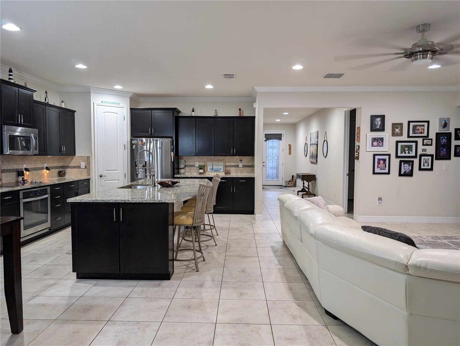 This beautiful one owner home built on conservation lot in the highly sought after community of Harrison Ranch. The Palm model features 6 bed/3 bath + den/office and an upstairs open recreation room. The upgrades start outside with well-manicured landscaping and sprinkler system. The exterior has gutters and a fresh coat of paint in 2022. From the covered front porch, you'll notice the inviting decorative glass door as you step inside, notice the upgraded trim package with 5 inch high baseboards and installed crown molding in the main living space, office, & master bedroom along with high ceilings and 8ft doors. The office/den is perfect for working from home and comes with french doors. This home is great for entertaining with a kitchen that opens up to a spacious family room. The kitchen has granite counters, cabinets with crown molding, tiled backsplash, stainless steel appliances. From the kitchen, you can step to your large brick paver, newly screened lanai or onto your concrete patio outside and enjoy the sunsets on your conservation lot. The main floor has 4 bedrooms including master, 2 baths, den/office, seperate dining room and a spacious laundry room with extra cabinets for storage and a large utility sink! The master suite has a large walk-in closet & an ensuite with an upgraded granite vanity with dual sinks and a large tiled walk-in shower. Take the staircase to the 2nd floor where you'll be greeted with a large open recreation room, as well as two more spacious bedrooms and a 3rd full bathroom. The home comes with an irrigation system and hurricane shutters. School re-zoning has residents attending the new Parrish Community High School and Barbara Harvey Elementary. Harrison Ranch features a 24-hour gym, heated junior Olympic pool and 5.5 miles of nature trails! There are also tennis courts and a brand new basketball & pickleball court. An activity director is also on-site, putting on fun events for young families as well as active adults. Tampa, St. Pete and Sarasota are all within 45 minutes, making this a perfect central location. Harrison Ranch is a beautiful community with a lifestyle you can truly enjoy! Furniture is negotiable along with price.