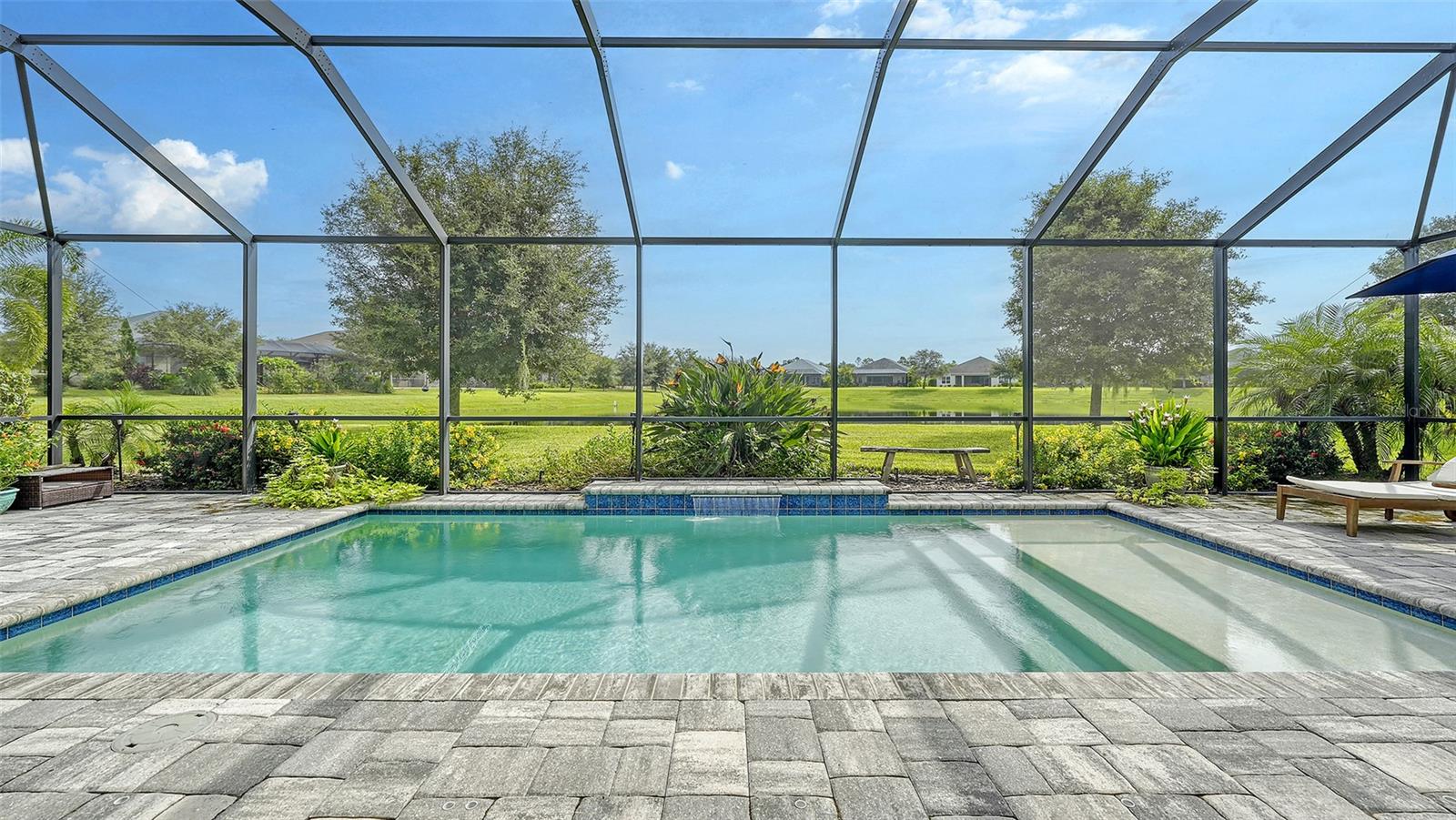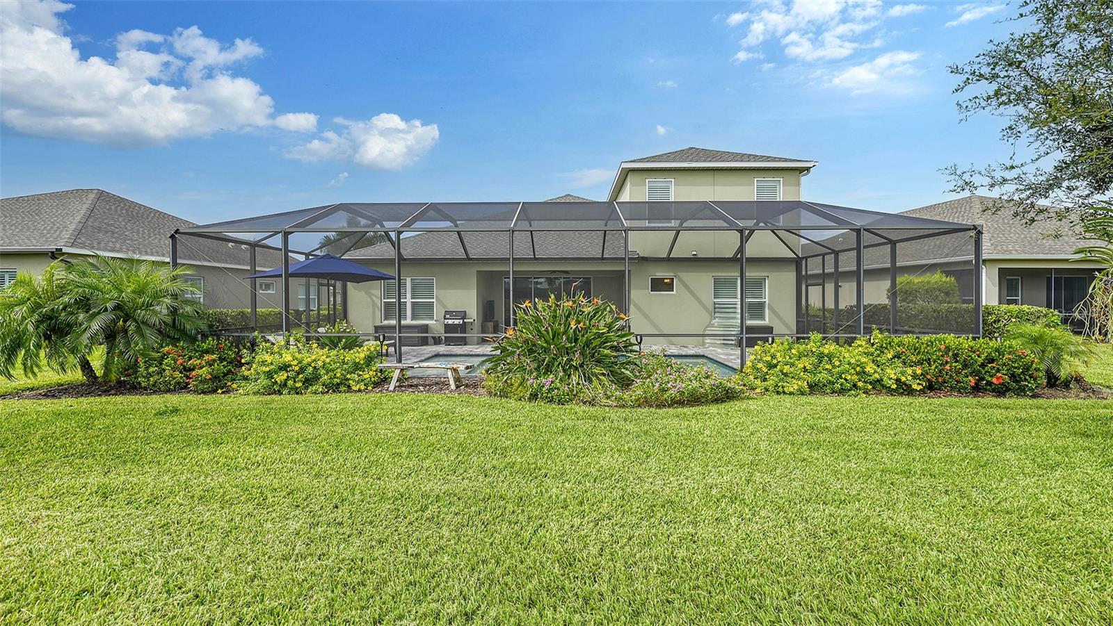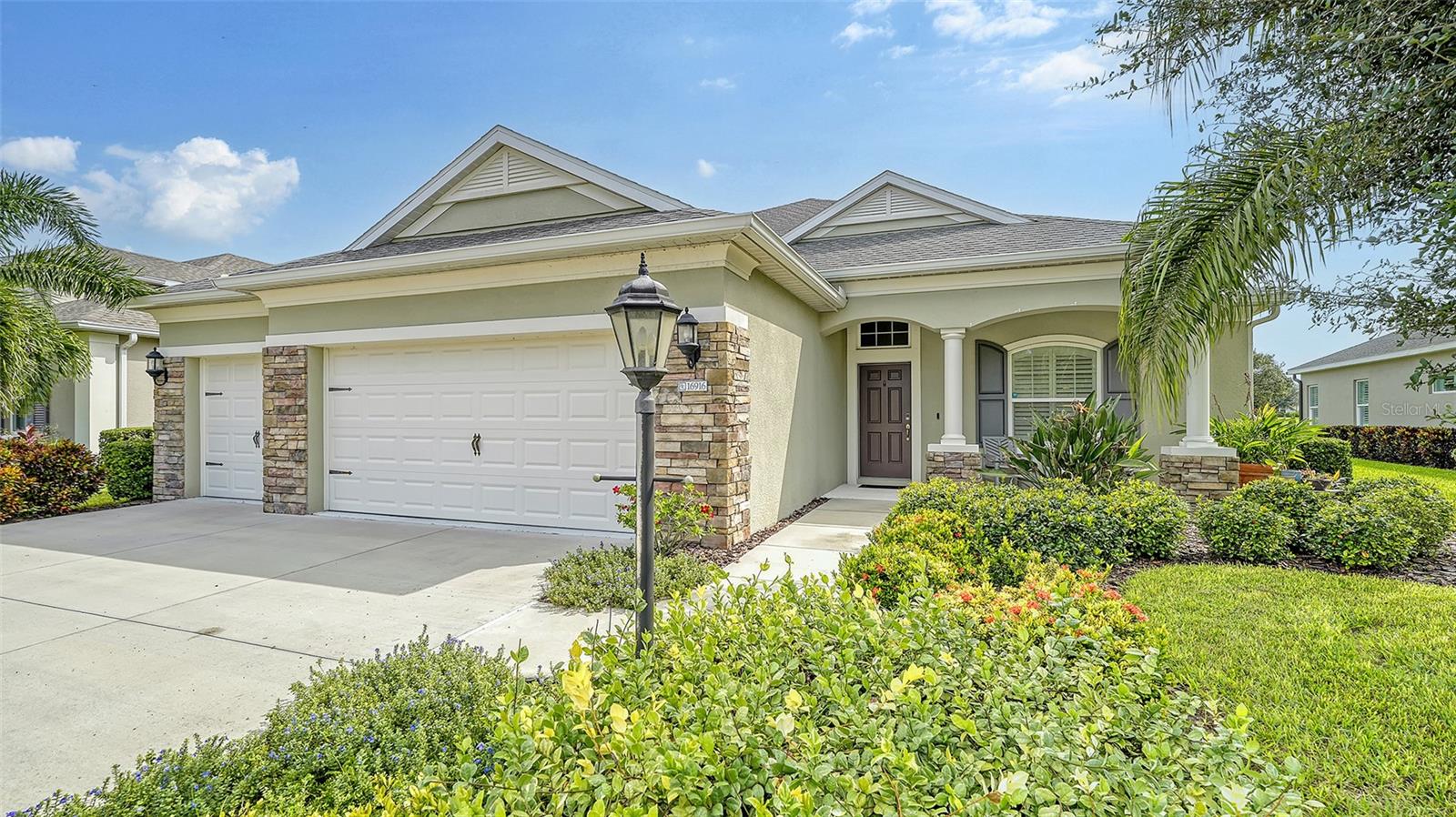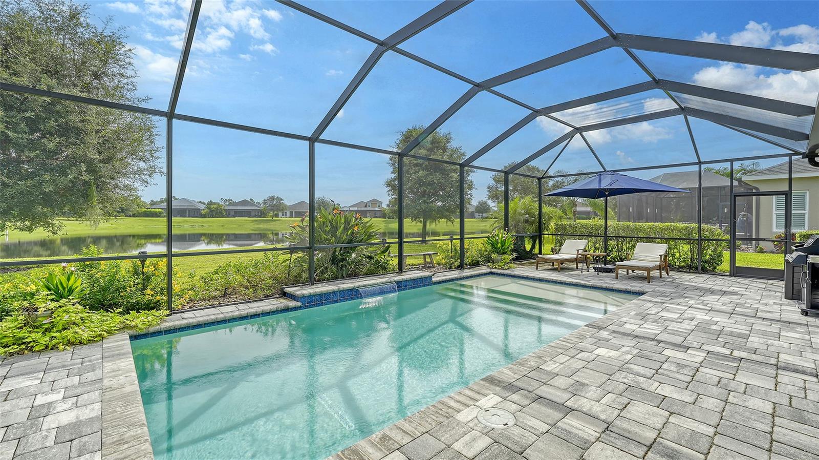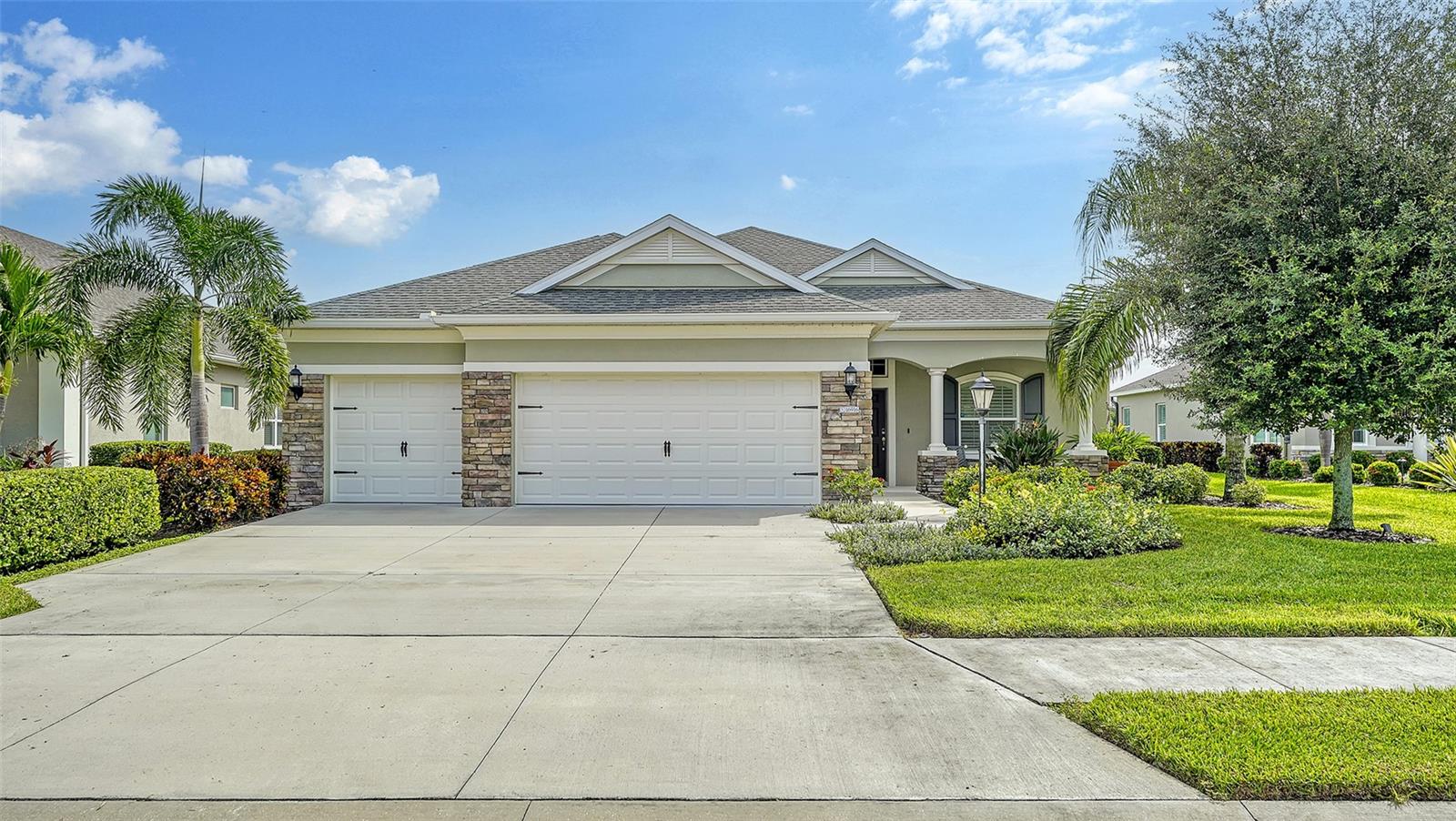 Welcome to Rivers Reach! Experience the peace of mind that comes with living in this stunning home, elevated 30 feet for added tranquility and security. This four-bedroom residence is perfect for growing families or those who work and study from home. With exceptional curb appeal featuring elegant stacked stone columns and a charming front porch, this home radiates warmth, style, and spaciousness. Inside, you're greeted by a welcoming foyer that leads to expansive living areas, including a formal living and dining room, a spacious kitchen, and a cozy great room. The versatile layout also includes a separate den/office, three bedrooms, and a generously sized bonus room upstairs, which adjoins an additional guest bedroom. The chef’s kitchen is a standout, with classic white Shaker-style cabinets, convenient pull-out drawers, a large center island, slate-colored GE appliances, and a walk-in pantry. The great room features a tray ceiling and seamlessly connects to the outdoor living area, enhancing the home’s open, airy feel. The oversized master suite is a true sanctuary, complete with two large closets with custom shelving, a double sink vanity, and a walk-in shower. Two additional bedrooms on the main floor share a full bath, while the office/den is ideally positioned near the pool bath for convenience. Upstairs, the expansive bonus room, along with a full bedroom and bath, is perfect for guests, teenagers, or visiting family members. Step outside through the pocketing sliding doors to enjoy a beautifully landscaped backyard with a covered sitting area and an extended lanai overlooking the sparkling heated saltwater pool and serene pond. The professionally designed yard features vibrant flowering plants, adding a burst of color to the outdoor space. Additional highlights include a herringbone subway tile backsplash in the kitchen, upgraded vinyl flooring in the living areas, plantation shutters throughout, and custom closets in every bedroom. Plus, the low HOA annual fee adds even more appeal to this already exceptional home. Located in the desirable Rivers Reach community, you’ll be just minutes from the Manatee River, shopping, and dining. This gated neighborhood also offers amenities like a community pool, playground, and walking trails. Don’t miss the opportunity to call this remarkable home yours—schedule a viewing today!