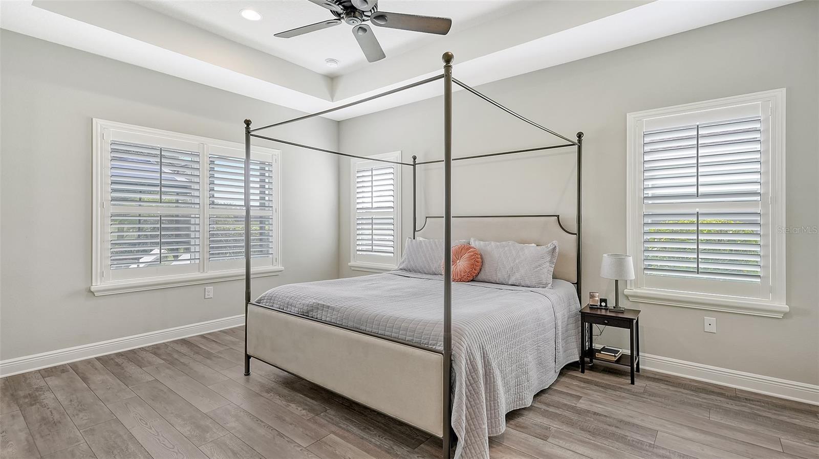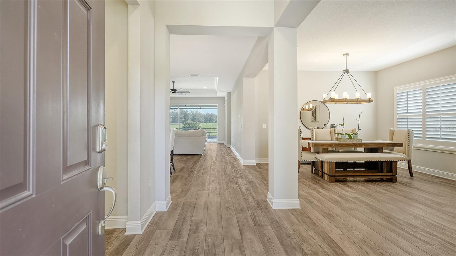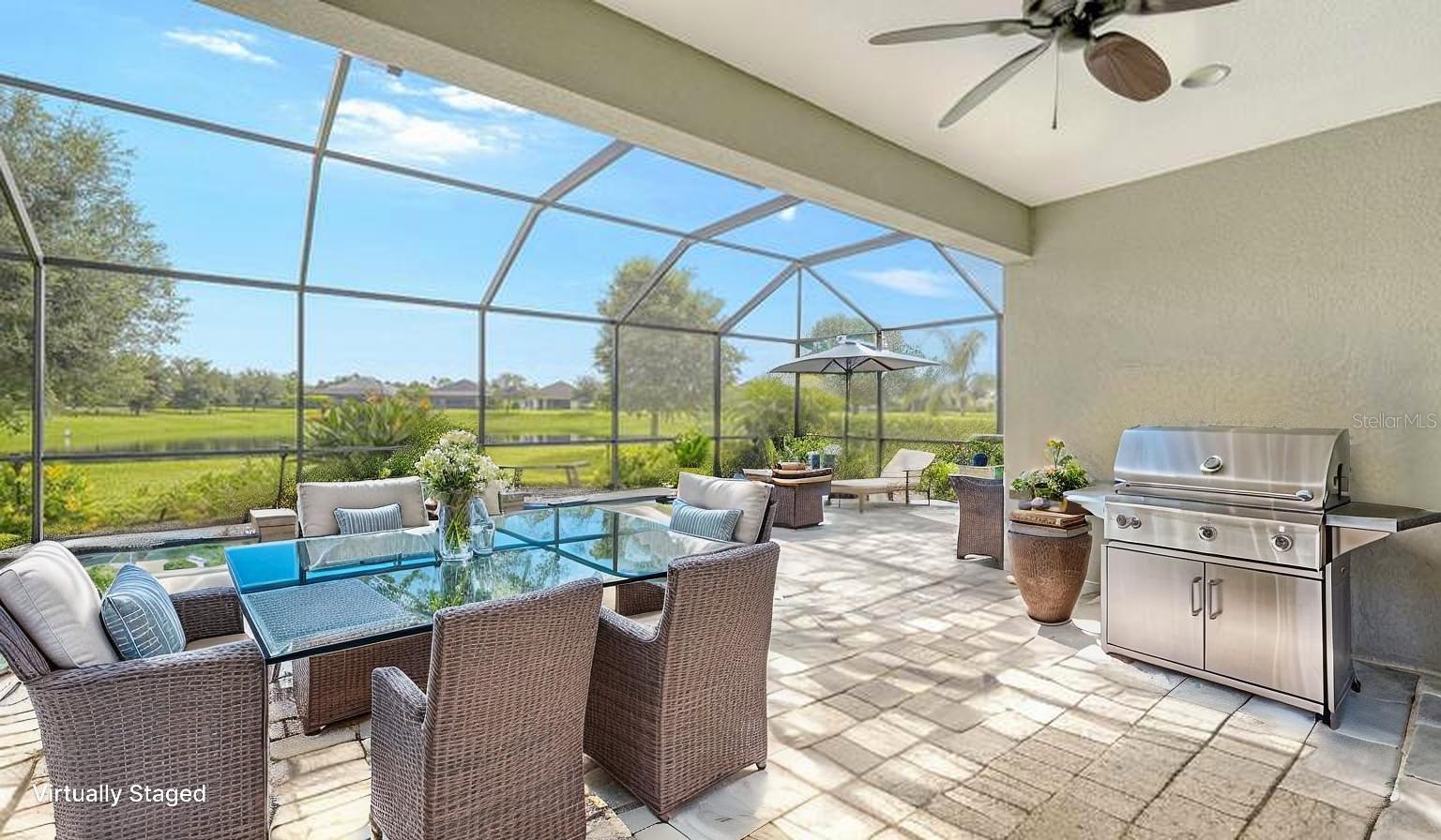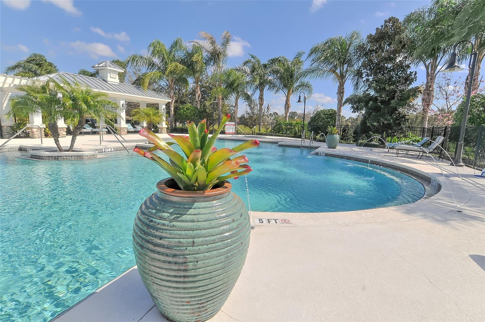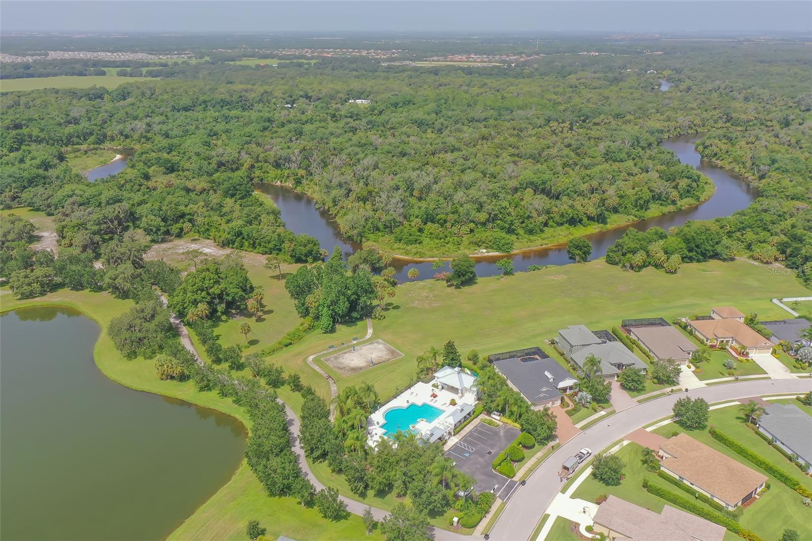 Welcome to Rivers Reach! Experience the peace of mind that comes with living in this stunning home, elevated 30 feet for added tranquility and security. This four-bedroom residence is perfect for growing families or those who work and study from home. With exceptional curb appeal featuring elegant stacked stone columns and a charming front porch, this home radiates warmth, style, and spaciousness. Inside, you're greeted by a welcoming foyer that leads to expansive living areas, including a formal living and dining room, a spacious kitchen, and a cozy great room. The versatile layout also includes a separate den/office, three bedrooms, and a generously sized bonus room upstairs, which adjoins an additional guest bedroom. The chef’s kitchen is a standout, with classic white Shaker-style cabinets, convenient pull-out drawers, a large center island, slate-colored GE appliances, and a walk-in pantry. The great room features a tray ceiling and seamlessly connects to the outdoor living area, enhancing the home’s open, airy feel. The oversized master suite is a true sanctuary, complete with two large closets with custom shelving, a double sink vanity, and a walk-in shower. Two additional bedrooms on the main floor share a full bath, while the office/den is ideally positioned near the pool bath for convenience. Upstairs, the expansive bonus room, along with a full bedroom and bath, is perfect for guests, teenagers, or visiting family members. Step outside through the pocketing sliding doors to enjoy a beautifully landscaped backyard with a covered sitting area and an extended lanai overlooking the sparkling heated saltwater pool and serene pond. The professionally designed yard features vibrant flowering plants, adding a burst of color to the outdoor space. Additional highlights include a herringbone subway tile backsplash in the kitchen, upgraded vinyl flooring in the living areas, plantation shutters throughout, and custom closets in every bedroom. Plus, the low HOA annual fee adds even more appeal to this already exceptional home. Located in the desirable Rivers Reach community, you’ll be just minutes from the Manatee River, shopping, and dining. This gated neighborhood also offers amenities like a community pool, playground, and walking trails. Don’t miss the opportunity to call this remarkable home yours—schedule a viewing today!