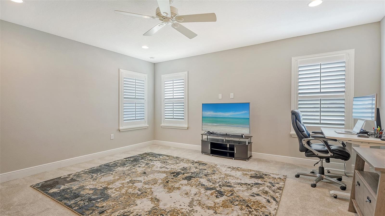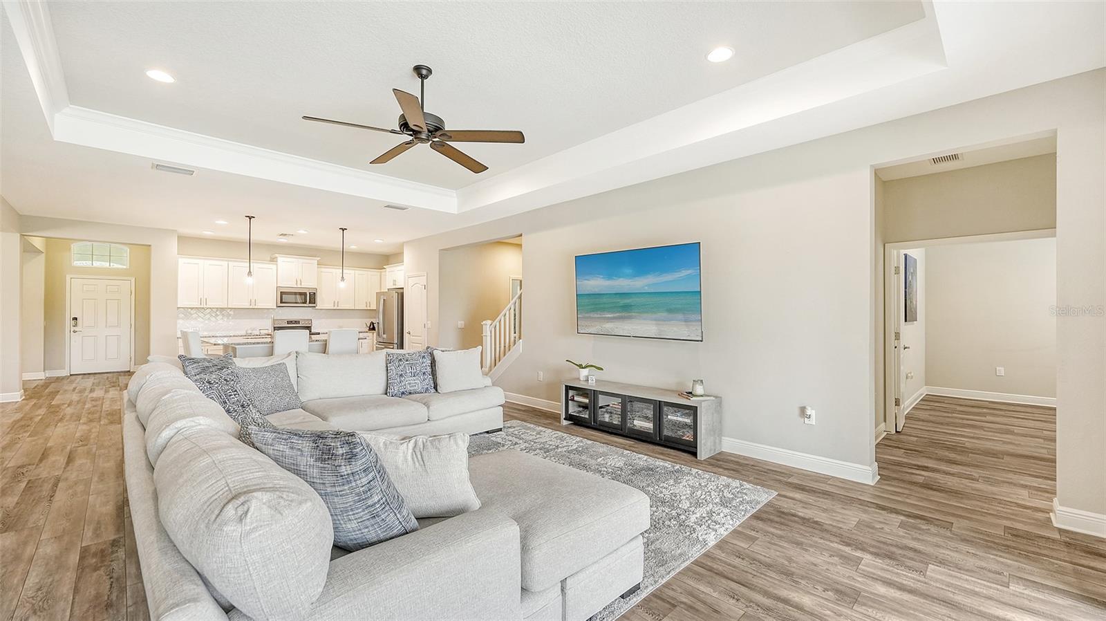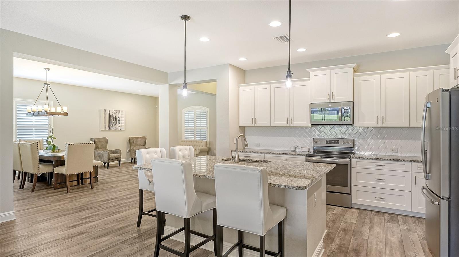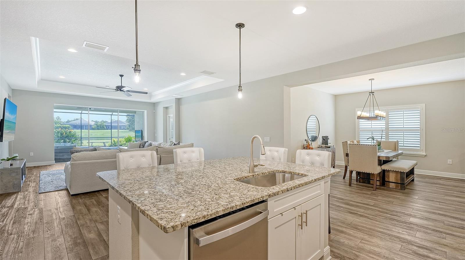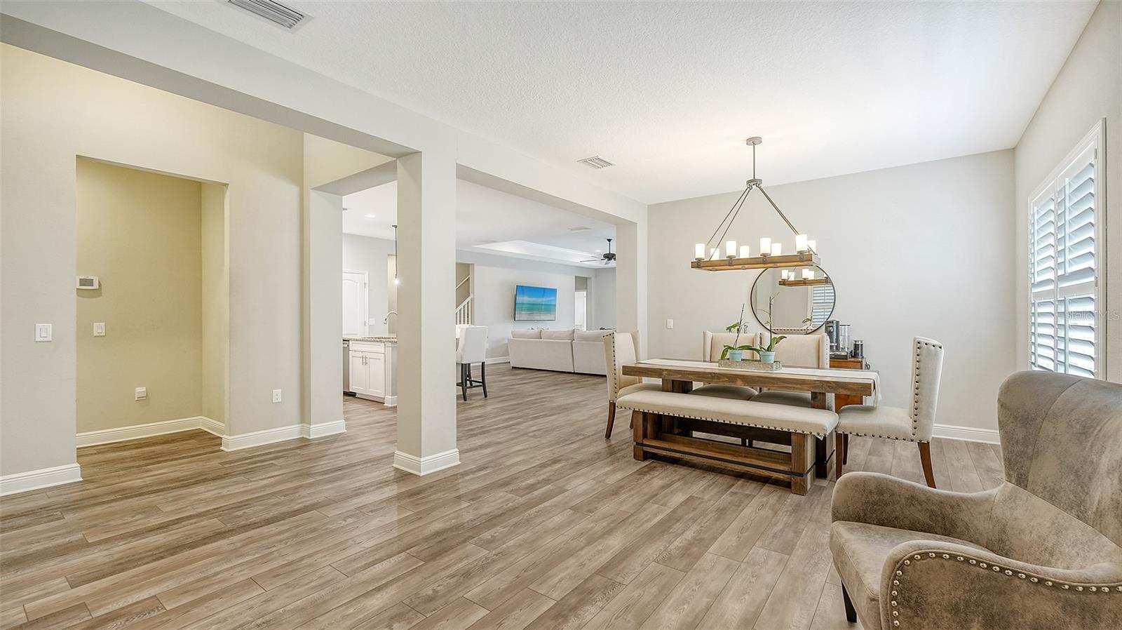 Welcome to Rivers Reach! Experience the peace of mind that comes with living in this stunning home, elevated 30 feet for added tranquility and security. This four-bedroom residence is perfect for growing families or those who work and study from home. With exceptional curb appeal featuring elegant stacked stone columns and a charming front porch, this home radiates warmth, style, and spaciousness. Inside, you're greeted by a welcoming foyer that leads to expansive living areas, including a formal living and dining room, a spacious kitchen, and a cozy great room. The versatile layout also includes a separate den/office, three bedrooms, and a generously sized bonus room upstairs, which adjoins an additional guest bedroom. The chef’s kitchen is a standout, with classic white Shaker-style cabinets, convenient pull-out drawers, a large center island, slate-colored GE appliances, and a walk-in pantry. The great room features a tray ceiling and seamlessly connects to the outdoor living area, enhancing the home’s open, airy feel. The oversized master suite is a true sanctuary, complete with two large closets with custom shelving, a double sink vanity, and a walk-in shower. Two additional bedrooms on the main floor share a full bath, while the office/den is ideally positioned near the pool bath for convenience. Upstairs, the expansive bonus room, along with a full bedroom and bath, is perfect for guests, teenagers, or visiting family members. Step outside through the pocketing sliding doors to enjoy a beautifully landscaped backyard with a covered sitting area and an extended lanai overlooking the sparkling heated saltwater pool and serene pond. The professionally designed yard features vibrant flowering plants, adding a burst of color to the outdoor space. Additional highlights include a herringbone subway tile backsplash in the kitchen, upgraded vinyl flooring in the living areas, plantation shutters throughout, and custom closets in every bedroom. Plus, the low HOA annual fee adds even more appeal to this already exceptional home. Located in the desirable Rivers Reach community, you’ll be just minutes from the Manatee River, shopping, and dining. This gated neighborhood also offers amenities like a community pool, playground, and walking trails. Don’t miss the opportunity to call this remarkable home yours—schedule a viewing today!