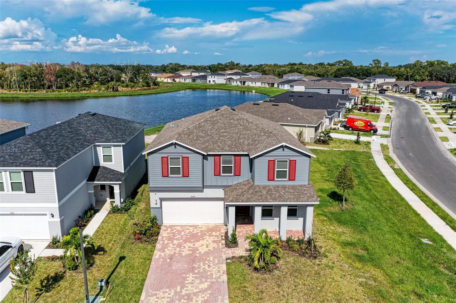 Nestled in the idyllic community of Sawgrass Lakes Parrish with no CDD Fees, this stunning 5-bedroom, 3-bathroom home is a modern masterpiece designed for family living. Just a year old, the property boasts a spacious corner lot with breathtaking water views that provide a serene backdrop for relaxation and entertainment. Upon entering, you're greeted by high ceilings that enhance the airy feel throughout. The living area features an elegant electric fireplace, adding warmth and sophistication to your gatherings. The first floor includes a convenient bedroom and full bathroom, perfect for guests or multi-generational family members. The heart of the home, the kitchen, is outfitted with high-end features including soft close drawers, upgraded door handles, and a large pantry for all your culinary needs. Step outside to the expansive lanai overlooking the tranquil water, an ideal spot for morning coffee or evening sunsets. Upstairs, discover four generously sized bedrooms, all with spacious closets. The primary suite offers a lovely tub for unwinding after long days, while the third bathroom features a double vanity for added convenience. A loft area provides a versatile bonus space, perfect for a home office or playroom. Safety and comfort are paramount, with hurricane shutters and an electric hookup voltage in the two-car garage, offering peace of mind and convenience. Why wait with a more expensive new construction home, when this can be your new today! This home is perfect for family home seekers and buyers looking for a modern, comfortable, and stylish residence in a desirable, family-friendly neighborhood. Experience the perfect blend of luxury and function at 9589 Sandy Bluffs Circle—schedule your viewing today!