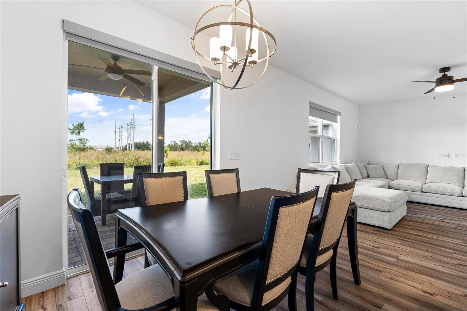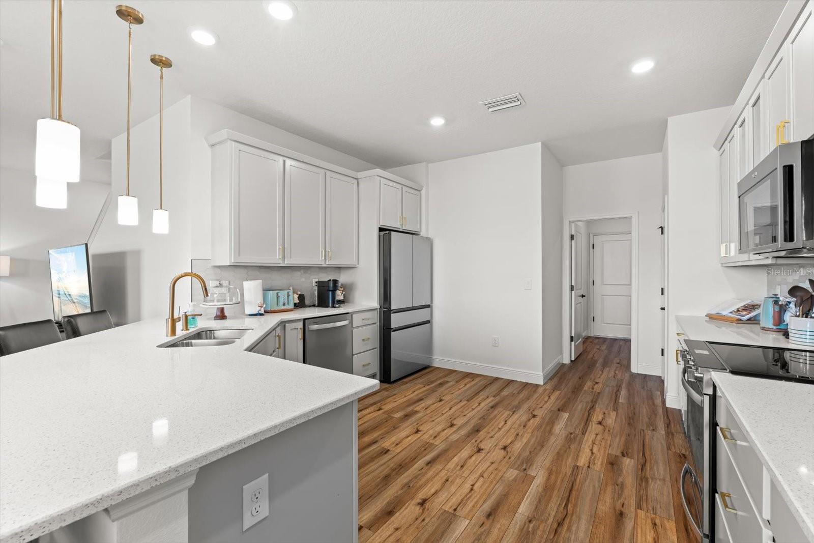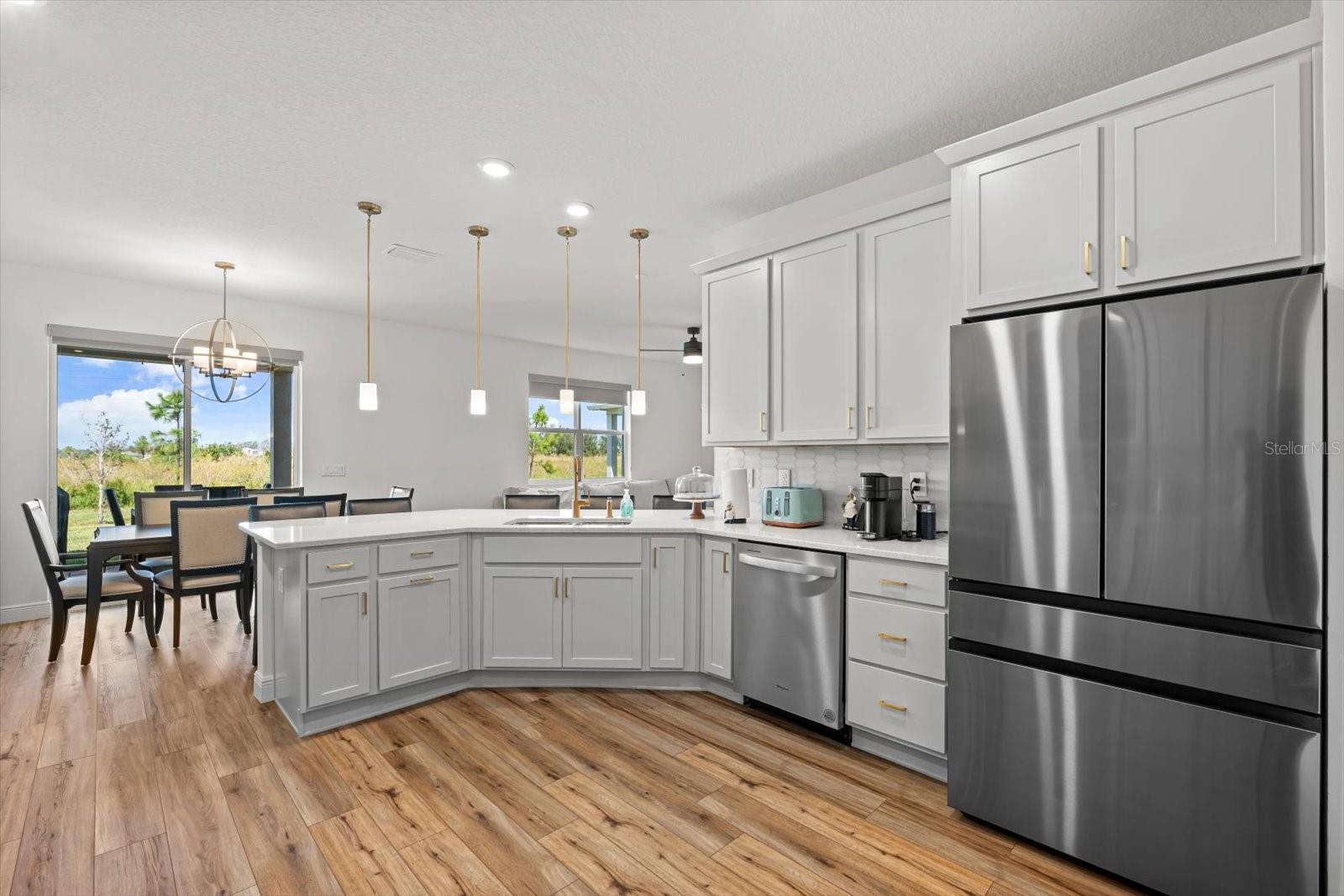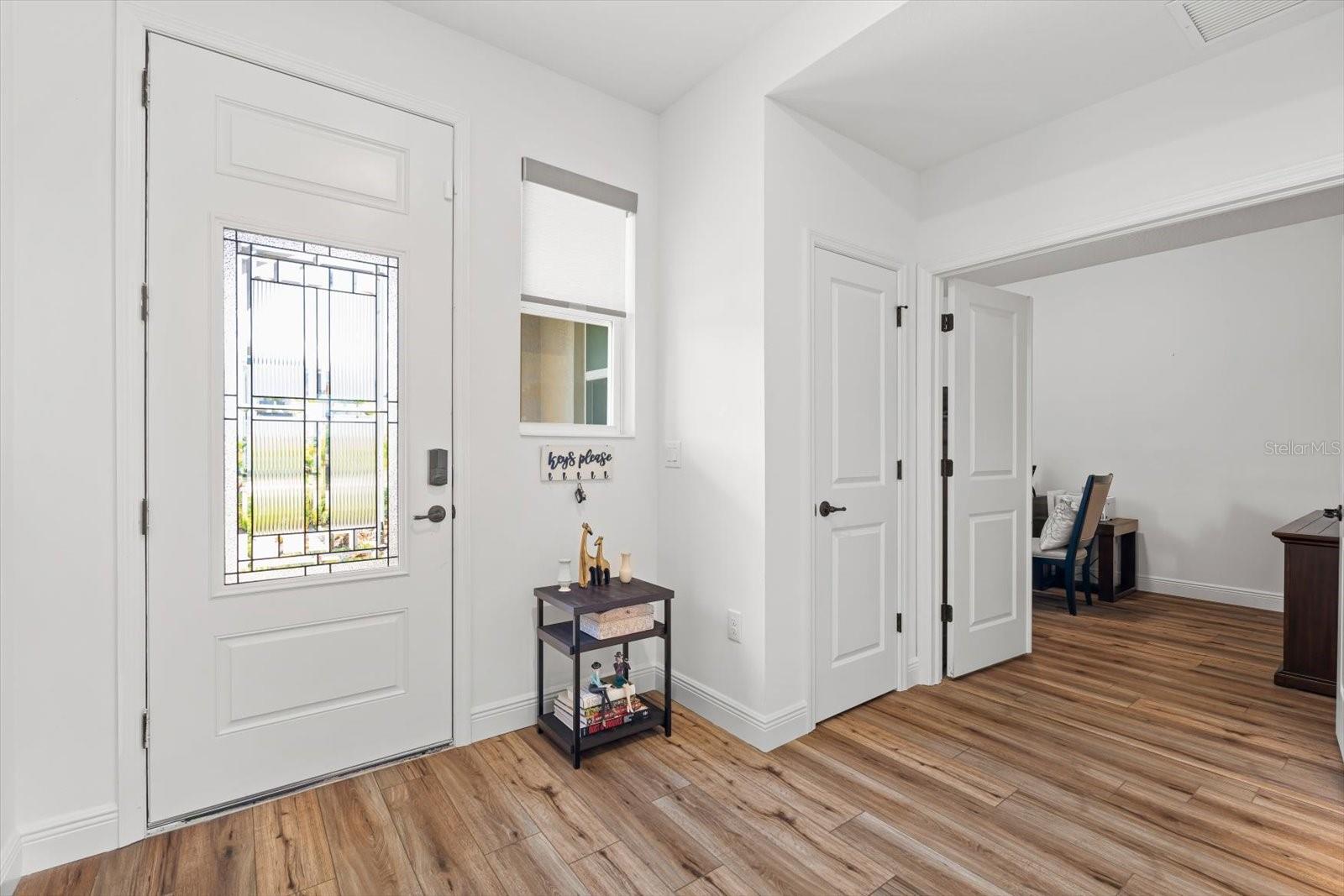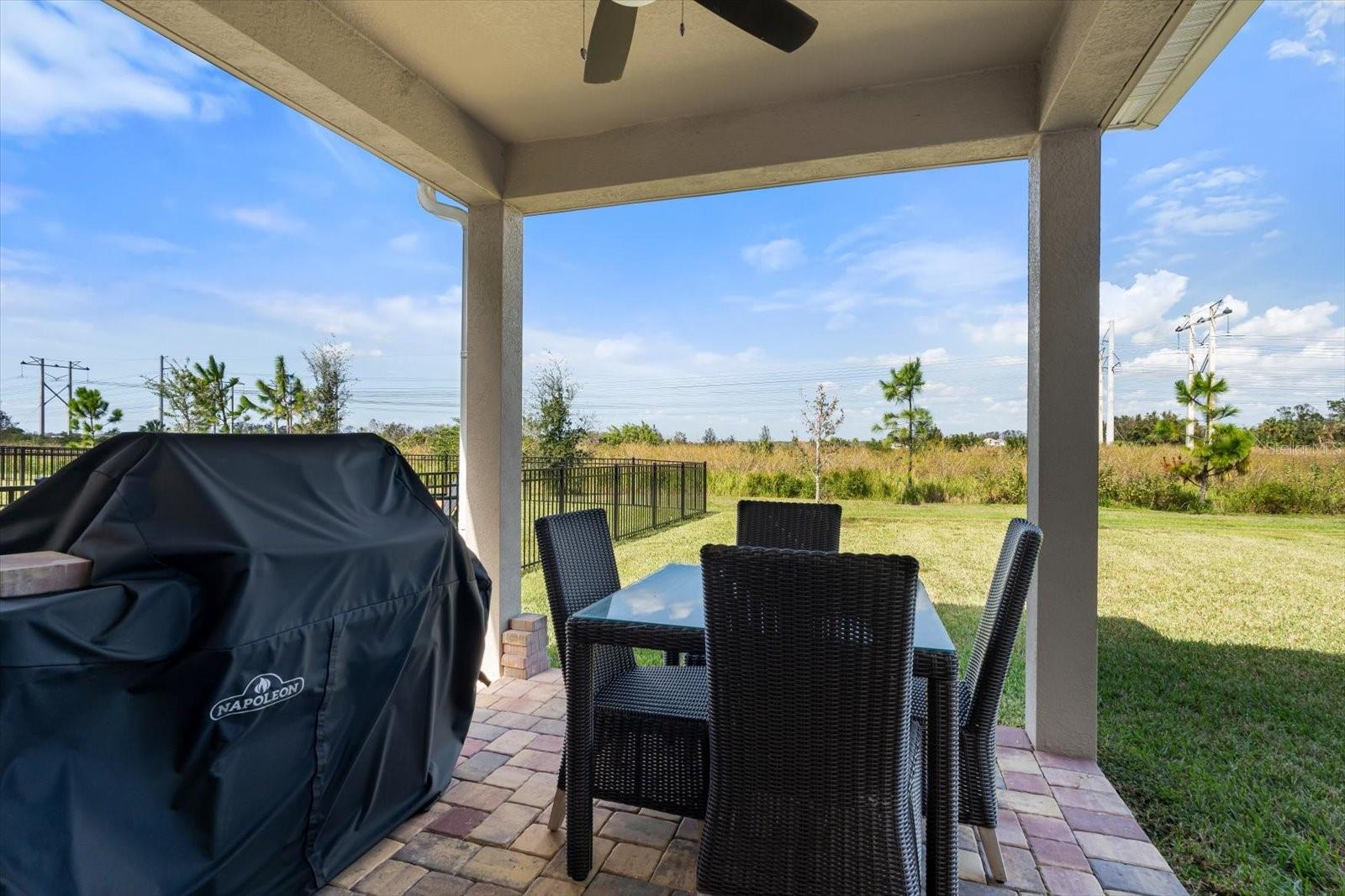 Discover this stunning home, built in 2023, nestled in the vibrant North River Ranch community. Featuring 5 spacious bedrooms - including a versatile first-floor bedroom that doubles as a stylish office - 2.5 bathrooms, and a spacious loft. With numerous upgraded features both before and after construction, this home is designed for modern living, boasting luxury vinyl wood plank flooring on the main level and plush Berber-style carpeting throughout the stairs and bedrooms. The exterior exudes charm with a brick-paved driveway, an inviting 8ft decorative glass front door, and impressive 9’4 ceilings. The gourmet kitchen is a chef’s dream, complete with 42” cabinets, quartz countertops, an extended breakfast bar, and high-end stainless-steel appliances - including a four-door refrigerator and a three-drawer dishwasher - along with stylish designer faucets and convenient soft-close drawers and doors. The office, equipped with elegant French doors, can easily serve as the fifth bedroom, while the expansive master bedroom invites you to indulge in the luxurious master bath, highlighted by a frameless glass shower enclosure. Additional features include ceiling fans in the living room and lanai, a Whirlpool stackable washer/dryer, a covered rear patio, and an insulated garage with epoxied floors. This home offers an upgraded lighting package that enhances the ambiance throughout, from the foyer to the dining area and all bathroom vanities. Located in the heart of the rapidly growing North River Ranch community, residents will soon enjoy access to new schools, shopping, and dining options, along with a forthcoming hospital. Take advantage of the nearby pavilion, which features a resort-style pool, fitness center, game room, playground, outdoor gym, soccer field, fire pits, swings, and serene pond seating, while a neighborhood trail meanders behind the home, leading to even more recreational facilities, including an additional pool across Moccasin Wallow and a new clubhouse with a heated pool being developed at the end of the trail. Don’t miss out on this incredible opportunity to call North River Ranch home!