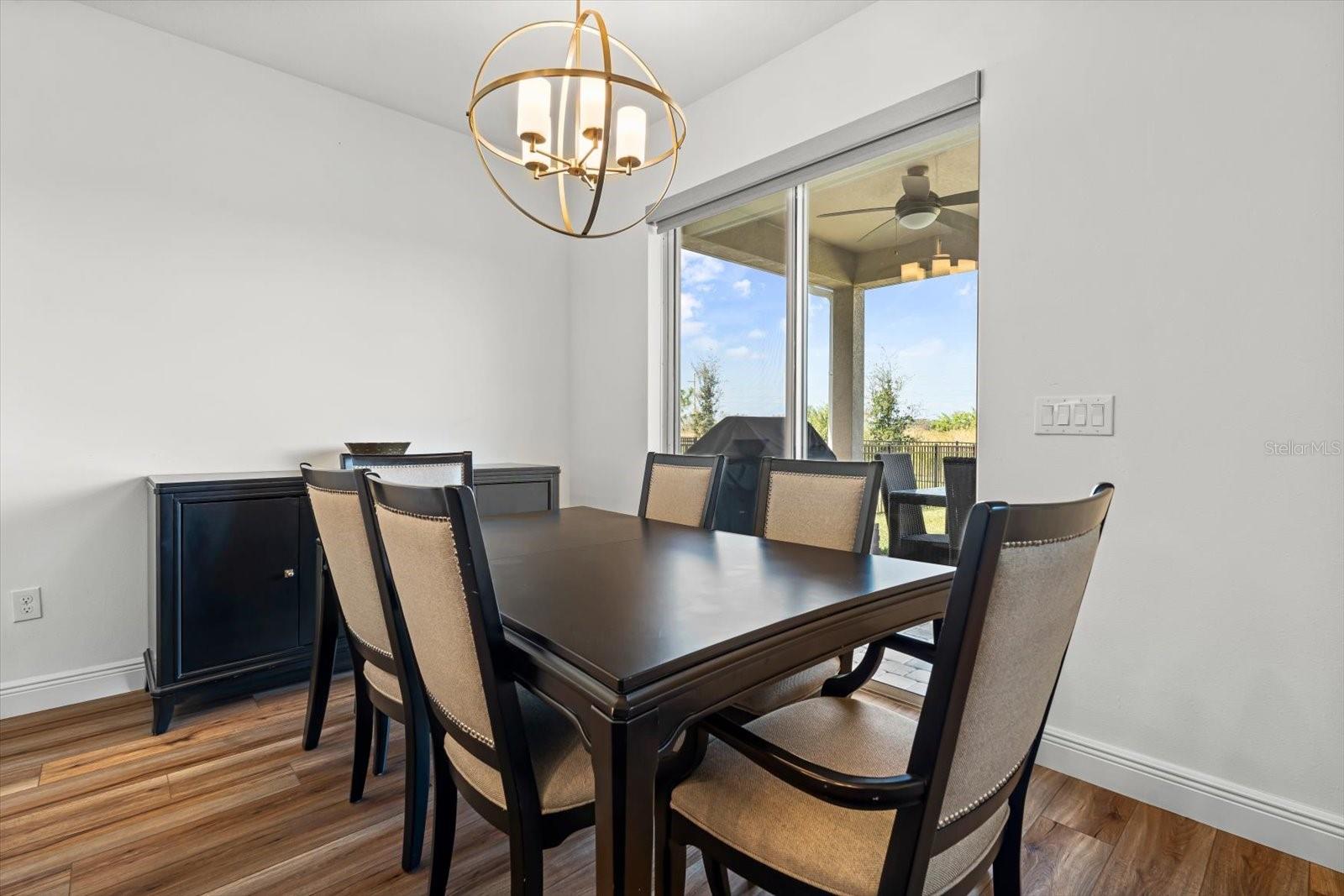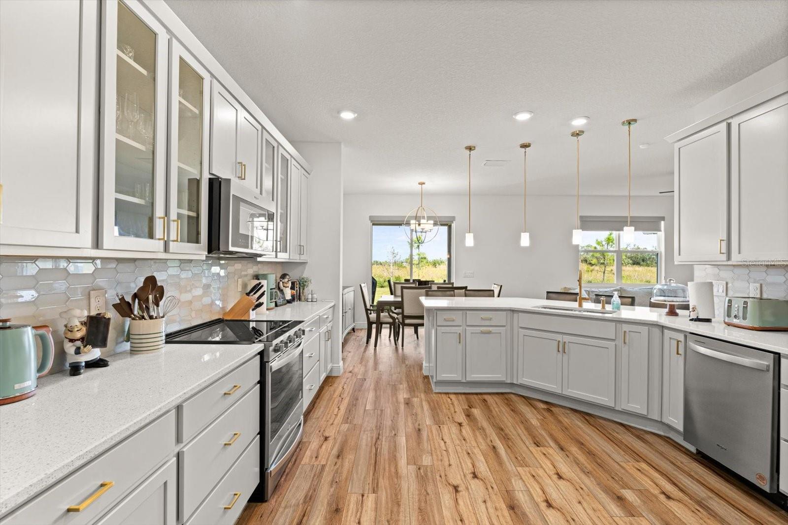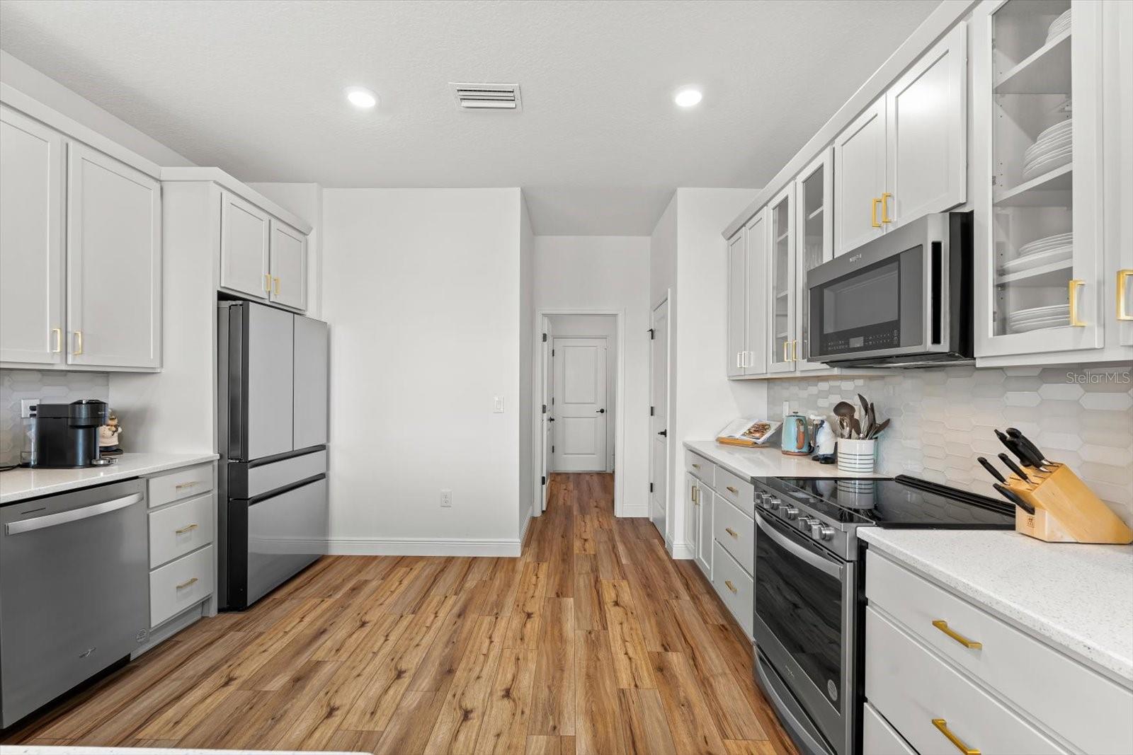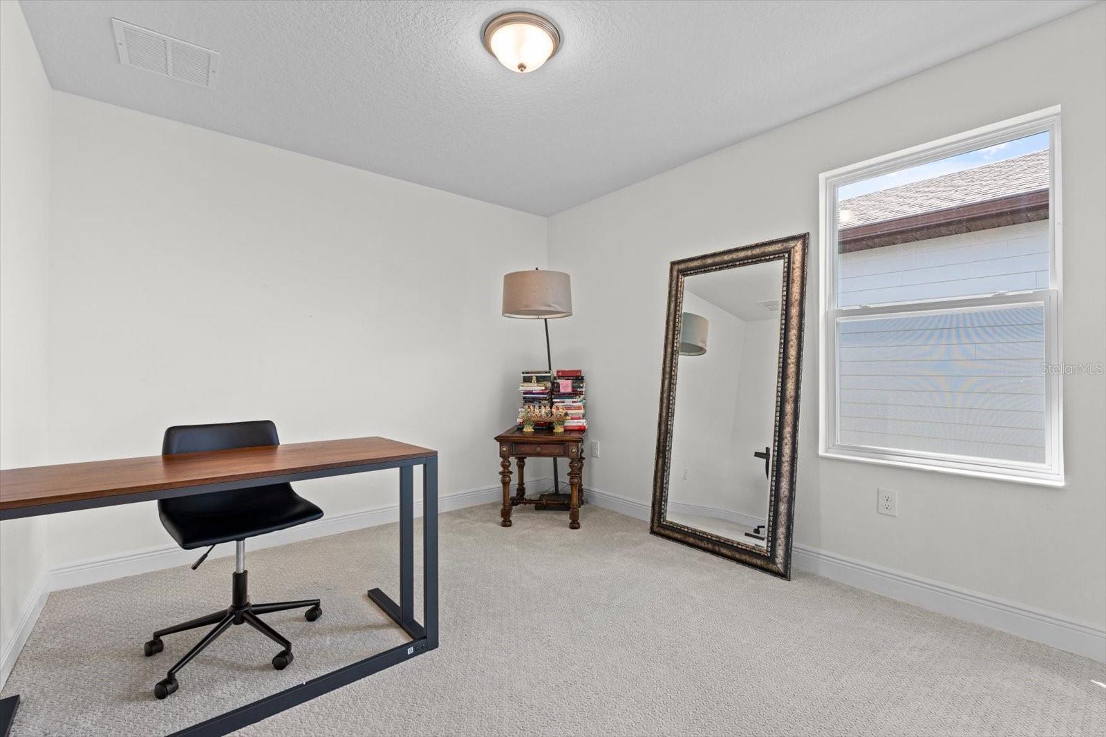 Discover this stunning home, built in 2023, nestled in the vibrant North River Ranch community. Featuring 5 spacious bedrooms - including a versatile first-floor bedroom that doubles as a stylish office - 2.5 bathrooms, and a spacious loft. With numerous upgraded features both before and after construction, this home is designed for modern living, boasting luxury vinyl wood plank flooring on the main level and plush Berber-style carpeting throughout the stairs and bedrooms. The exterior exudes charm with a brick-paved driveway, an inviting 8ft decorative glass front door, and impressive 9’4 ceilings. The gourmet kitchen is a chef’s dream, complete with 42” cabinets, quartz countertops, an extended breakfast bar, and high-end stainless-steel appliances - including a four-door refrigerator and a three-drawer dishwasher - along with stylish designer faucets and convenient soft-close drawers and doors. The office, equipped with elegant French doors, can easily serve as the fifth bedroom, while the expansive master bedroom invites you to indulge in the luxurious master bath, highlighted by a frameless glass shower enclosure. Additional features include ceiling fans in the living room and lanai, a Whirlpool stackable washer/dryer, a covered rear patio, and an insulated garage with epoxied floors. This home offers an upgraded lighting package that enhances the ambiance throughout, from the foyer to the dining area and all bathroom vanities. Located in the heart of the rapidly growing North River Ranch community, residents will soon enjoy access to new schools, shopping, and dining options, along with a forthcoming hospital. Take advantage of the nearby pavilion, which features a resort-style pool, fitness center, game room, playground, outdoor gym, soccer field, fire pits, swings, and serene pond seating, while a neighborhood trail meanders behind the home, leading to even more recreational facilities, including an additional pool across Moccasin Wallow and a new clubhouse with a heated pool being developed at the end of the trail. Don’t miss out on this incredible opportunity to call North River Ranch home!