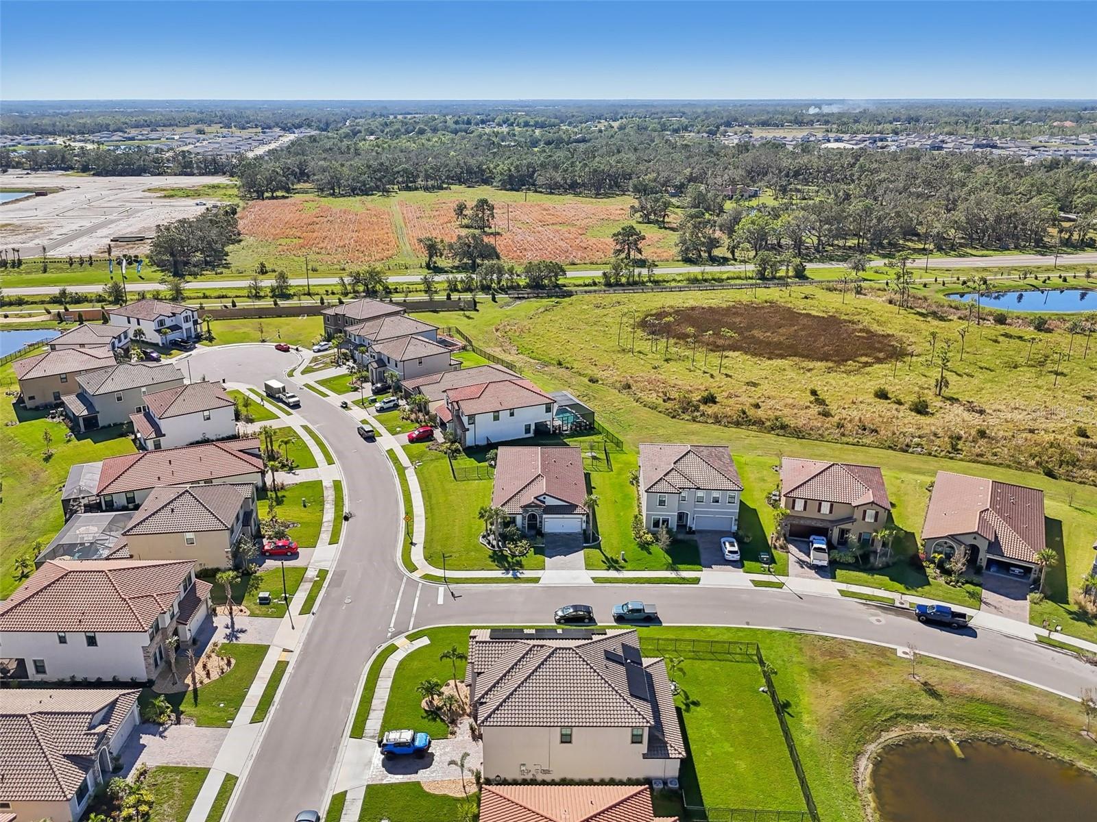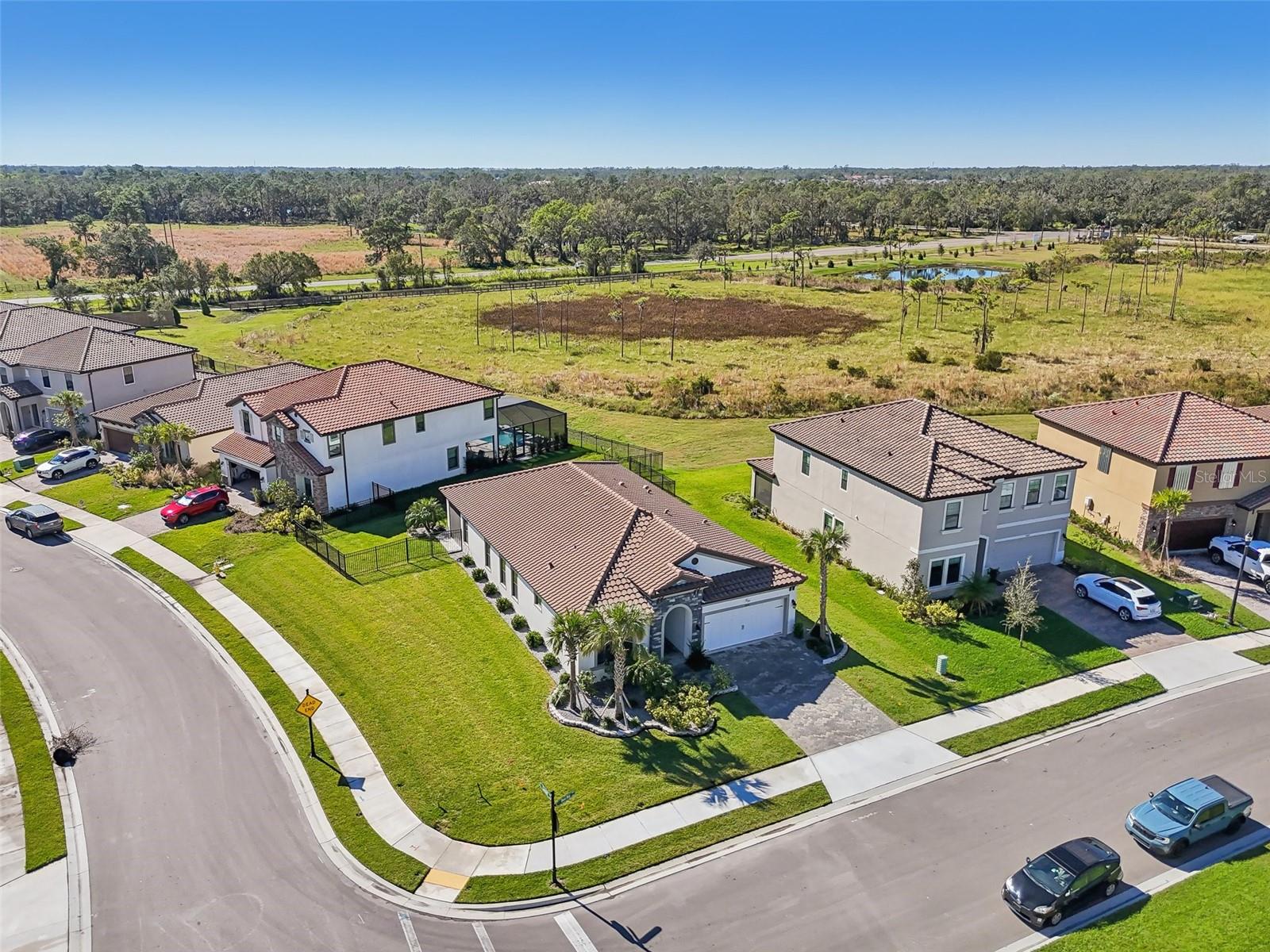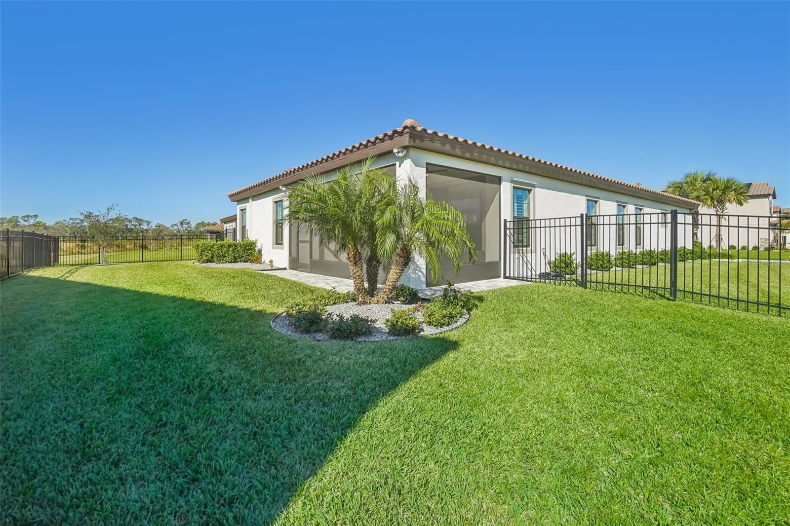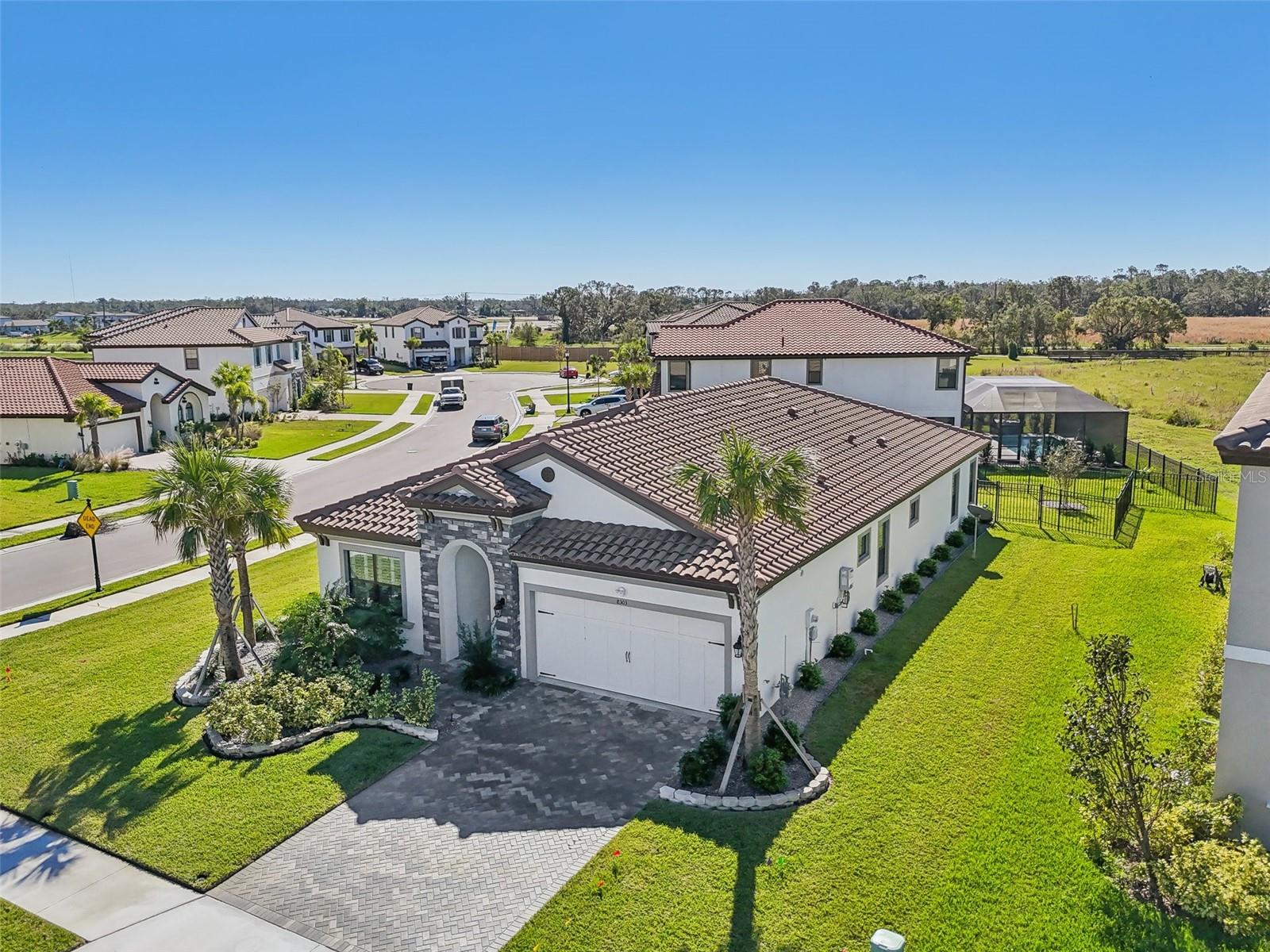 One or more photo(s) has been virtually staged. Model-Perfect Home in Crosswind Ranch – Move-In Ready & Loaded with Upgrades! Why wait for new construction when this pristine Sandpiper model by Homes by WestBay is ready now? Located in the highly sought-after Crosswind Ranch community of Parrish, this stunning 3-bedroom, 3-bathroom home with a bonus den/office is less than 2 years old and shows like a model! Situated on a spacious corner lot with a partial preserve view, this home offers privacy, space, and thoughtful design throughout. The open-concept floor plan features a gourmet kitchen with upgraded quartz countertops, elegant cabinetry with crown molding, a large center island, and gas availability for your stove. Enjoy casual meals in the bright dining nook or entertain effortlessly in the expansive great room, where sliding glass doors lead to the extended screened-in lanai—perfect for relaxing or dining al fresco while watching local wildlife. Every bedroom is thoughtfully positioned for privacy, and one includes its own en-suite bath—ideal for guests or a mother-in-law suite. The luxurious primary suite features two walk-in closets, blackout shades behind stylish plantation shutters, and a spa-like bath with an oversized walk-in shower. Additional upgrades include tray ceilings with crown molding, 8' interior doors, a tankless water heater, and a hospital-grade water filtration system. The fully fenced backyard offers plenty of room for a future pool and showcases a peaceful conservation backdrop. This home also includes a washer, dryer, and refrigerator, adding to its move-in-ready appeal. Enjoy all the charm and quality of this growing community, complete with tile roofs, paver driveways, and easy access to US-301, I-75, St. Pete (30 mins), and Tampa (45 mins).