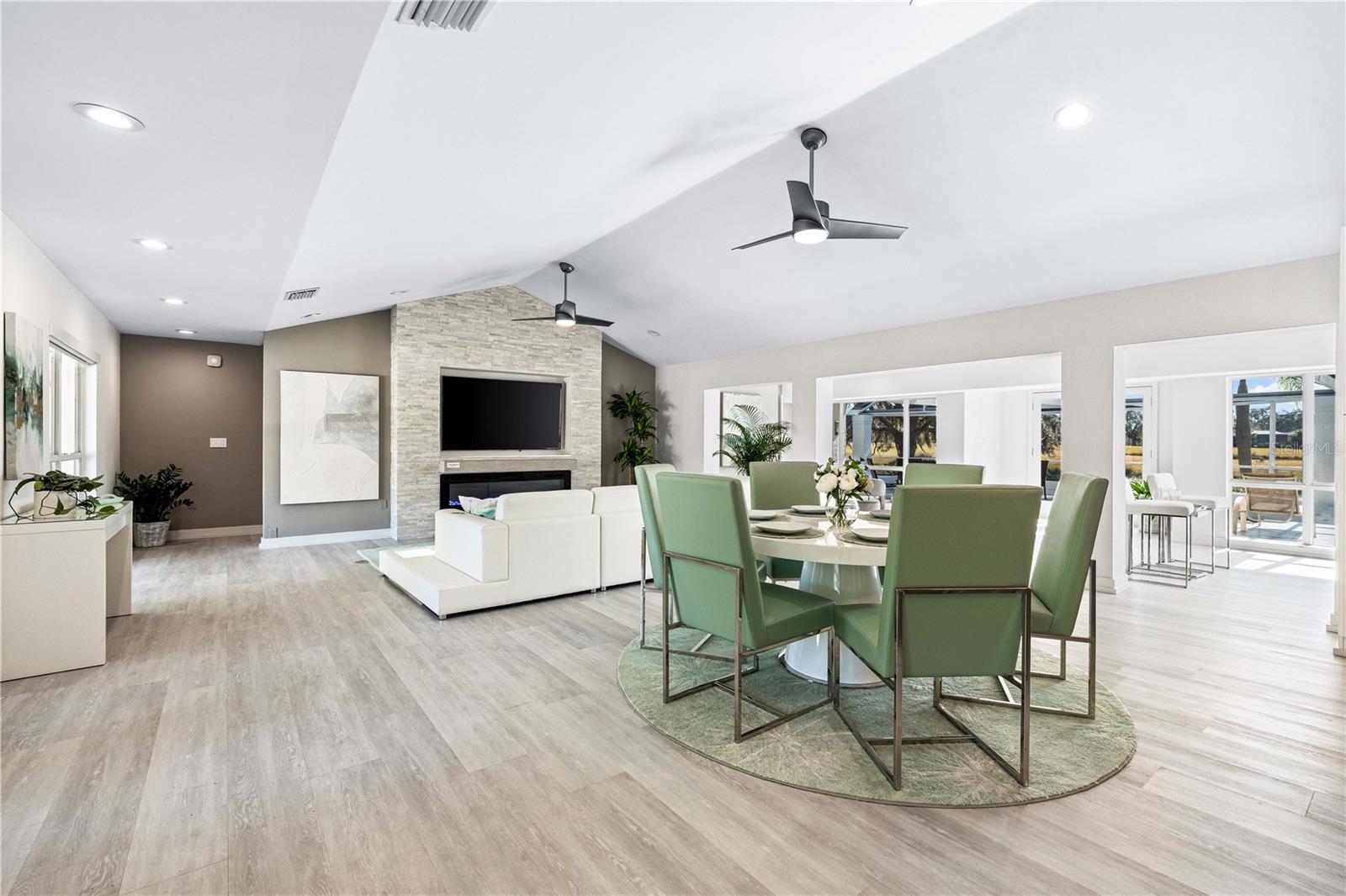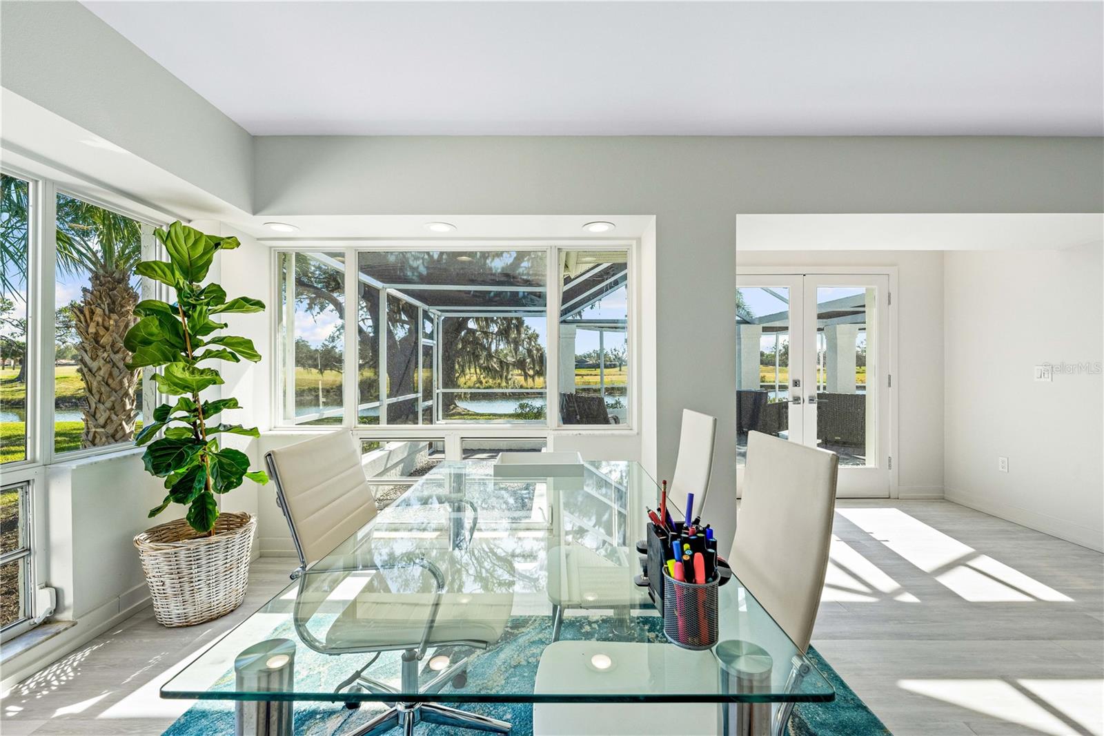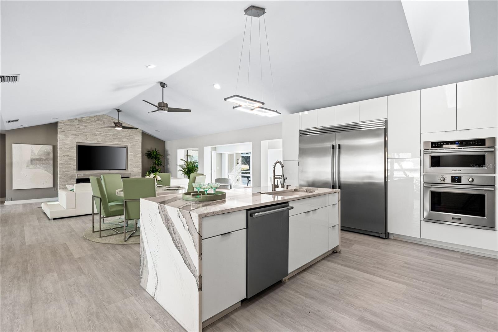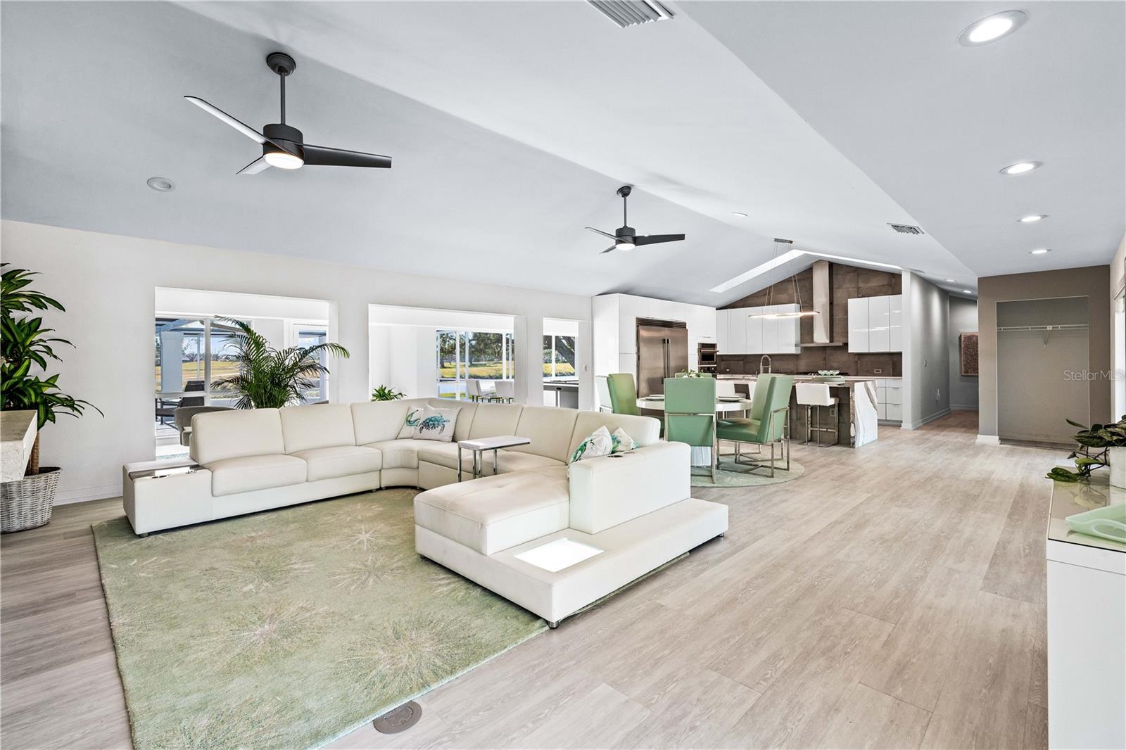 Exquisitely remodeled 4/3.5 contemporary on a spacious golf course lot in the popular Club at River Wilderness. A totally open floor plan featuring extensive windows and a cathedral ceiling create a bright, airy feeling, highlighting the stunningly luxurious, designer finishes throughout. The huge 800sf great room-dining-kitchen area features a floor to ceiling quartzite stone fireplace on one end, with electric fireplace and 72” tv niche, and a chef’s dream kitchen on the opposite end, making this the perfect home for entertaining. The incredible kitchen features glossy white European style cabinetry with premium Cambria counter tops and an impressive waterfalled center island with a composite sink, extremely quiet SS dishwasher and seating for four. Top of the line Frigidaire Professional SS appliances include a 66" twin column frig and freezer, built-in dual wall ovens with a convection microwave, a 36” natural gas cooktop with SS chimney vent. Beyond the great room is a more intimate seating area overlooking the serene golf course and a game room leading out to the expansive, screened in lanai. The spacious master suite boasts a cathedral ceiling, ample room for a king size bed that overlooks an intimate seating area with a built-in electric fireplace to warm cooler evenings after relaxing in the opulent master bath’s whirlpool jet tub. Bathroom also features a large, walk-in glass lined porcelain shower, his and hers vanities with lighted & fog proof mirrors and a separate toilet room. An immense walk-in closet will surprise you with its spacious “California” closet design, it’s convenient second laundry room featuring Bosch under counter washer and dryer, storage cabinets, sink and quartz counter perfect for your morning coffee or expresso machine! Completing the owner’s wing is a large office area with tons of naturel light and a beautiful view overlooking the golf course. The "other wing" of this magnificent home features 3 spacious bedrooms with built-in desks, plenty of closet space and 2 baths en-suite both completely updated with lighted mirrors, porcelain tile and wall hung vanities. The spacious main laundry room in located off the kitchen and leads to a unique 220sf multi-functional workshop/craft room/golf cart room with laundry tub and slatted walls for convenient storage and direct access to the 2.5 car attached garage. Additional upgrades include a new roof and air conditioning systems, all new landscaping, quartzite brick enhanced facias for curb appeal, a circular drive for plenty of guest parking, all new hardware, lighting and plumbing fixtures, freshly painted walls and ceilings and new luxury vinyl plank for porcelain tile floors throughout. You will love the privacy and serenity from your screened in patio with pond/golf course view and room for a pool or hot tub. This community has many amenities including a 18 hole championship golf course, clubhouse with dining, Olympic sized pool, fully equipped fitness center, lighted har-tru tennis courts and pickle ball as well as community ramp with boating access to the Manatee River! The club has many optional memberships for golf, tennis, and social. This incredible community is conveniently located to shopping, restaurants and schools. Call me today for a private tour while this masterpiece is still available.