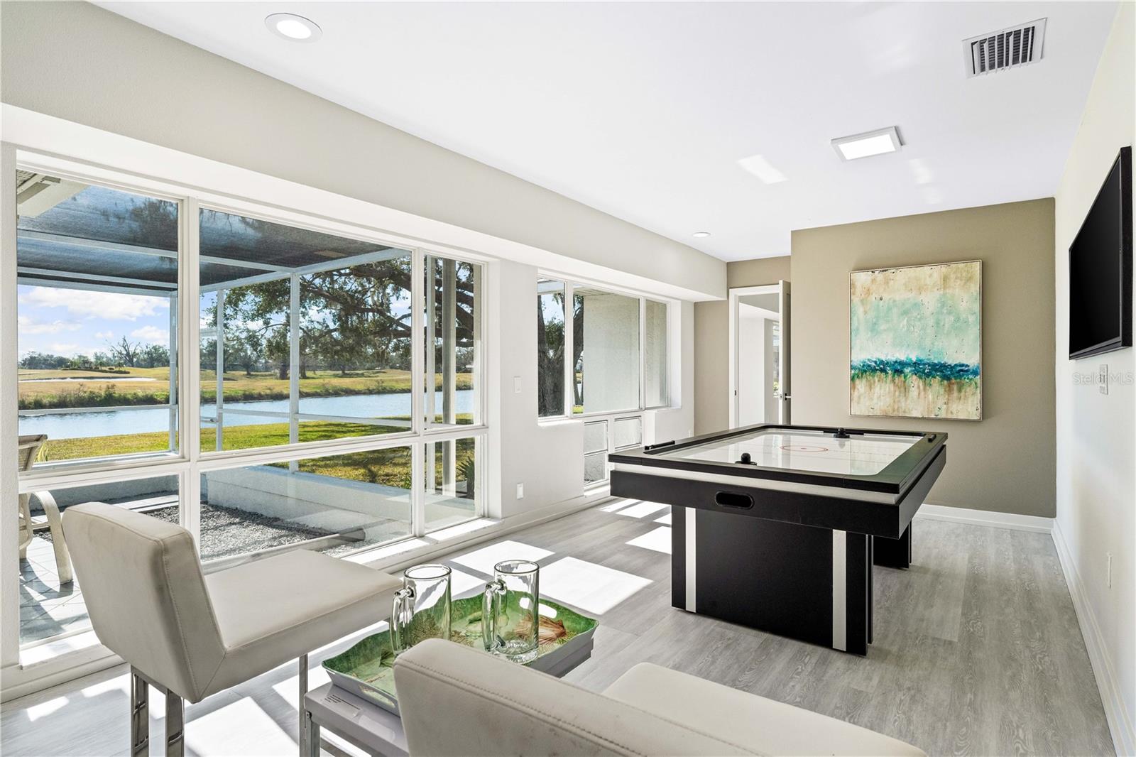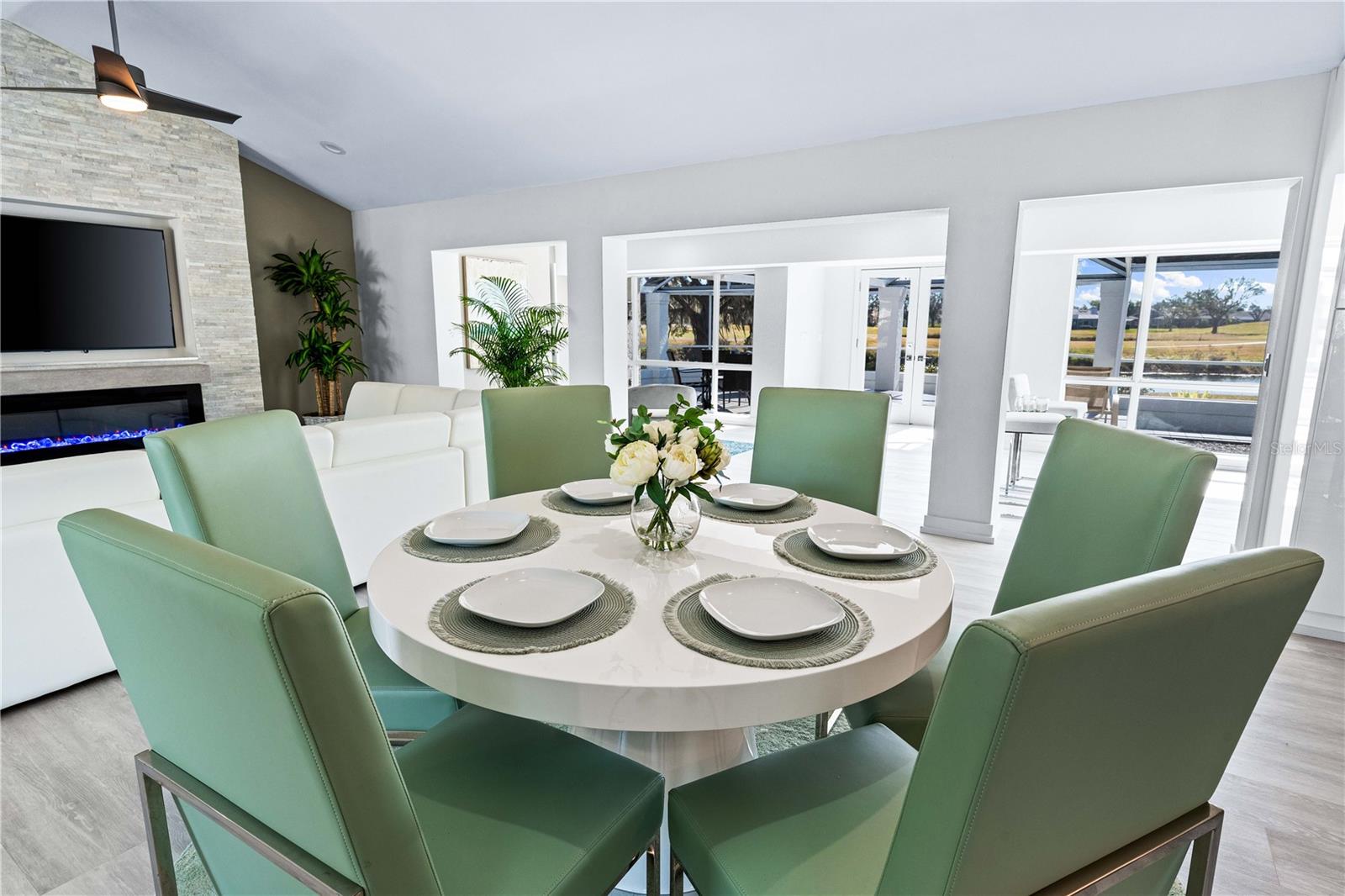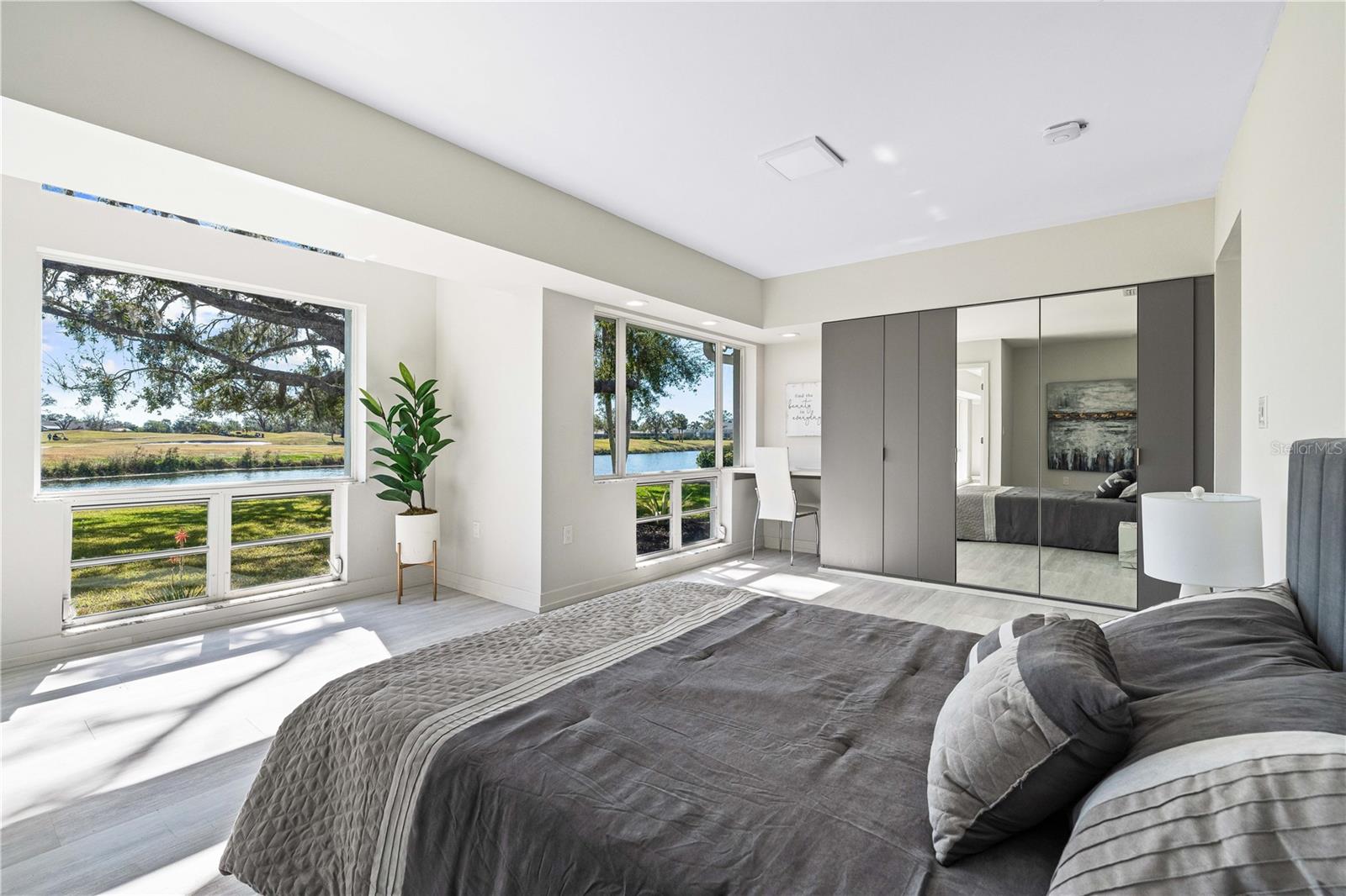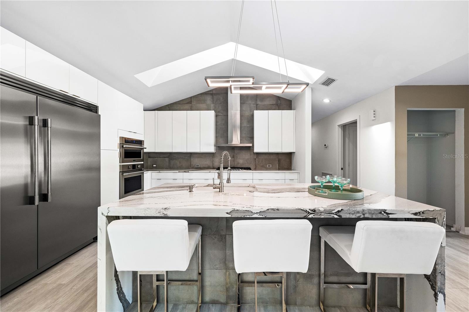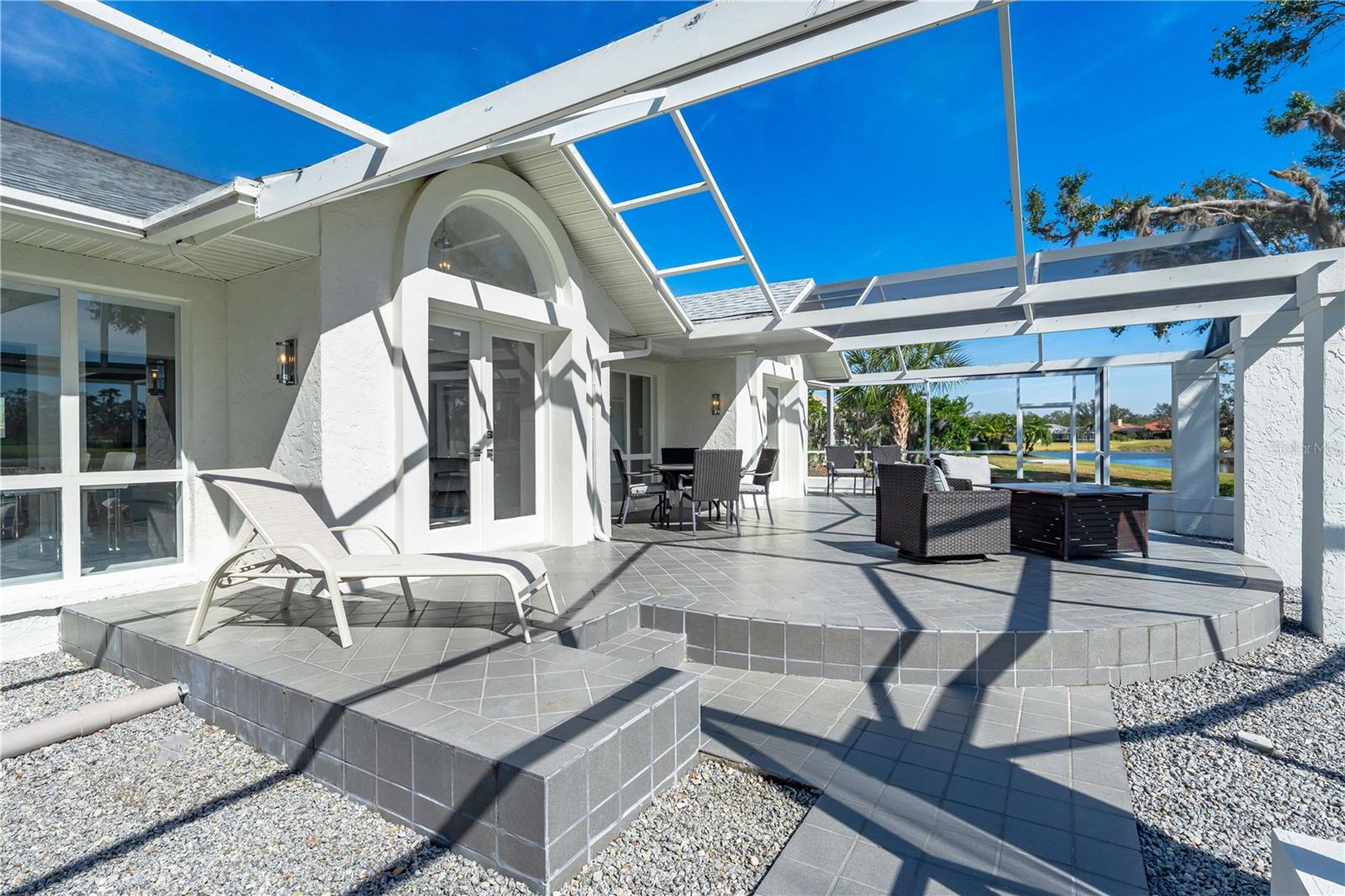 Exquisitely remodeled 4/3.5 contemporary on a spacious golf course lot in the popular Club at River Wilderness. A totally open floor plan featuring extensive windows and a cathedral ceiling create a bright, airy feeling, highlighting the stunningly luxurious, designer finishes throughout. The huge 800sf great room-dining-kitchen area features a floor to ceiling quartzite stone fireplace on one end, with electric fireplace and 72” tv niche, and a chef’s dream kitchen on the opposite end, making this the perfect home for entertaining. The incredible kitchen features glossy white European style cabinetry with premium Cambria counter tops and an impressive waterfalled center island with a composite sink, extremely quiet SS dishwasher and seating for four. Top of the line Frigidaire Professional SS appliances include a 66" twin column frig and freezer, built-in dual wall ovens with a convection microwave, a 36” natural gas cooktop with SS chimney vent. Beyond the great room is a more intimate seating area overlooking the serene golf course and a game room leading out to the expansive, screened in lanai. The spacious master suite boasts a cathedral ceiling, ample room for a king size bed that overlooks an intimate seating area with a built-in electric fireplace to warm cooler evenings after relaxing in the opulent master bath’s whirlpool jet tub. Bathroom also features a large, walk-in glass lined porcelain shower, his and hers vanities with lighted & fog proof mirrors and a separate toilet room. An immense walk-in closet will surprise you with its spacious “California” closet design, it’s convenient second laundry room featuring Bosch under counter washer and dryer, storage cabinets, sink and quartz counter perfect for your morning coffee or expresso machine! Completing the owner’s wing is a large office area with tons of naturel light and a beautiful view overlooking the golf course. The "other wing" of this magnificent home features 3 spacious bedrooms with built-in desks, plenty of closet space and 2 baths en-suite both completely updated with lighted mirrors, porcelain tile and wall hung vanities. The spacious main laundry room in located off the kitchen and leads to a unique 220sf multi-functional workshop/craft room/golf cart room with laundry tub and slatted walls for convenient storage and direct access to the 2.5 car attached garage. Additional upgrades include a new roof and air conditioning systems, all new landscaping, quartzite brick enhanced facias for curb appeal, a circular drive for plenty of guest parking, all new hardware, lighting and plumbing fixtures, freshly painted walls and ceilings and new luxury vinyl plank for porcelain tile floors throughout. You will love the privacy and serenity from your screened in patio with pond/golf course view and room for a pool or hot tub. This community has many amenities including a 18 hole championship golf course, clubhouse with dining, Olympic sized pool, fully equipped fitness center, lighted har-tru tennis courts and pickle ball as well as community ramp with boating access to the Manatee River! The club has many optional memberships for golf, tennis, and social. This incredible community is conveniently located to shopping, restaurants and schools. Call me today for a private tour while this masterpiece is still available.