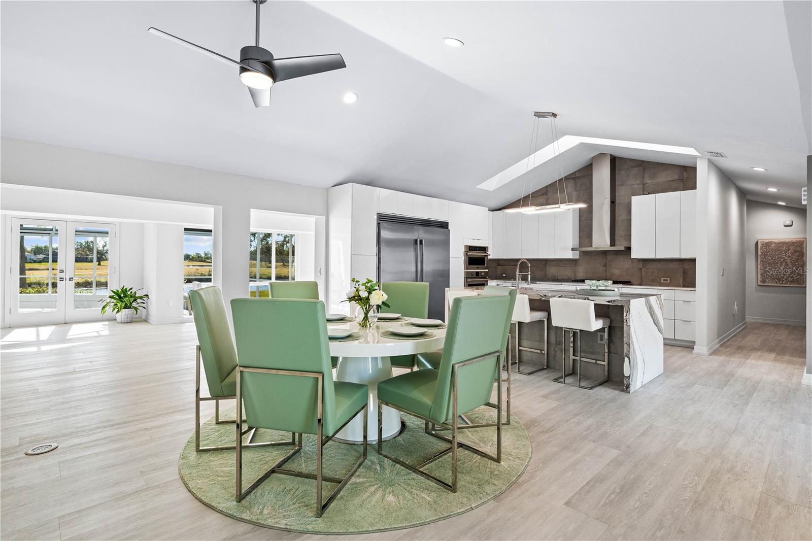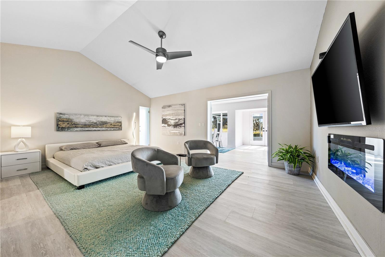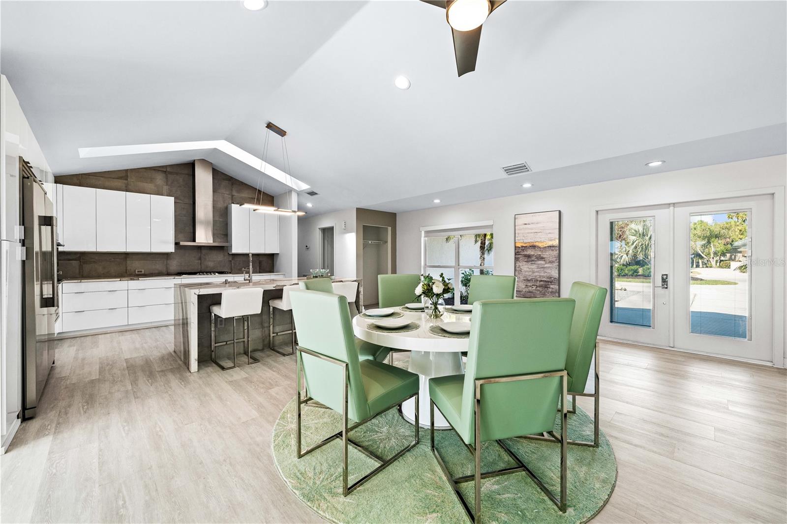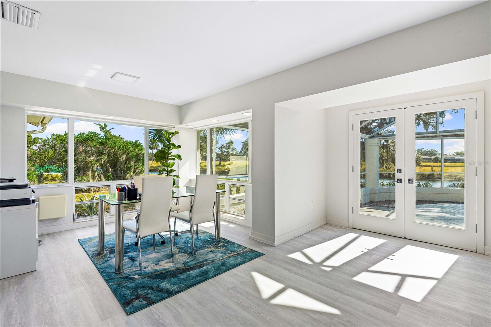 Exquisitely remodeled 4/3.5 contemporary on a spacious golf course lot in the popular Club at River Wilderness. A totally open floor plan featuring extensive windows and a cathedral ceiling create a bright, airy feeling, highlighting the stunningly luxurious, designer finishes throughout. The huge 800sf great room-dining-kitchen area features a floor to ceiling quartzite stone fireplace on one end, with electric fireplace and 72” tv niche, and a chef’s dream kitchen on the opposite end, making this the perfect home for entertaining. The incredible kitchen features glossy white European style cabinetry with premium Cambria counter tops and an impressive waterfalled center island with a composite sink, extremely quiet SS dishwasher and seating for four. Top of the line Frigidaire Professional SS appliances include a 66" twin column frig and freezer, built-in dual wall ovens with a convection microwave, a 36” natural gas cooktop with SS chimney vent. Beyond the great room is a more intimate seating area overlooking the serene golf course and a game room leading out to the expansive, screened in lanai. The spacious master suite boasts a cathedral ceiling, ample room for a king size bed that overlooks an intimate seating area with a built-in electric fireplace to warm cooler evenings after relaxing in the opulent master bath’s whirlpool jet tub. Bathroom also features a large, walk-in glass lined porcelain shower, his and hers vanities with lighted & fog proof mirrors and a separate toilet room. An immense walk-in closet will surprise you with its spacious “California” closet design, it’s convenient second laundry room featuring Bosch under counter washer and dryer, storage cabinets, sink and quartz counter perfect for your morning coffee or expresso machine! Completing the owner’s wing is a large office area with tons of naturel light and a beautiful view overlooking the golf course. The "other wing" of this magnificent home features 3 spacious bedrooms with built-in desks, plenty of closet space and 2 baths en-suite both completely updated with lighted mirrors, porcelain tile and wall hung vanities. The spacious main laundry room in located off the kitchen and leads to a unique 220sf multi-functional workshop/craft room/golf cart room with laundry tub and slatted walls for convenient storage and direct access to the 2.5 car attached garage. Additional upgrades include a new roof and air conditioning systems, all new landscaping, quartzite brick enhanced facias for curb appeal, a circular drive for plenty of guest parking, all new hardware, lighting and plumbing fixtures, freshly painted walls and ceilings and new luxury vinyl plank for porcelain tile floors throughout. You will love the privacy and serenity from your screened in patio with pond/golf course view and room for a pool or hot tub. This community has many amenities including a 18 hole championship golf course, clubhouse with dining, Olympic sized pool, fully equipped fitness center, lighted har-tru tennis courts and pickle ball as well as community ramp with boating access to the Manatee River! The club has many optional memberships for golf, tennis, and social. This incredible community is conveniently located to shopping, restaurants and schools. Call me today for a private tour while this masterpiece is still available.