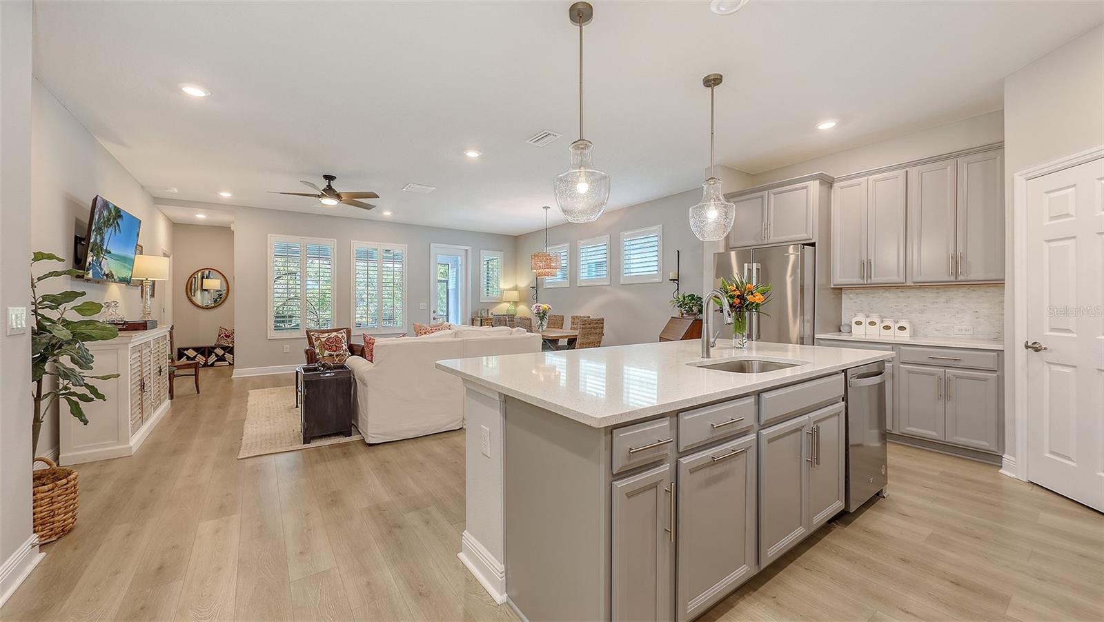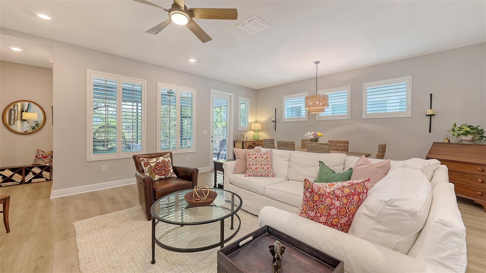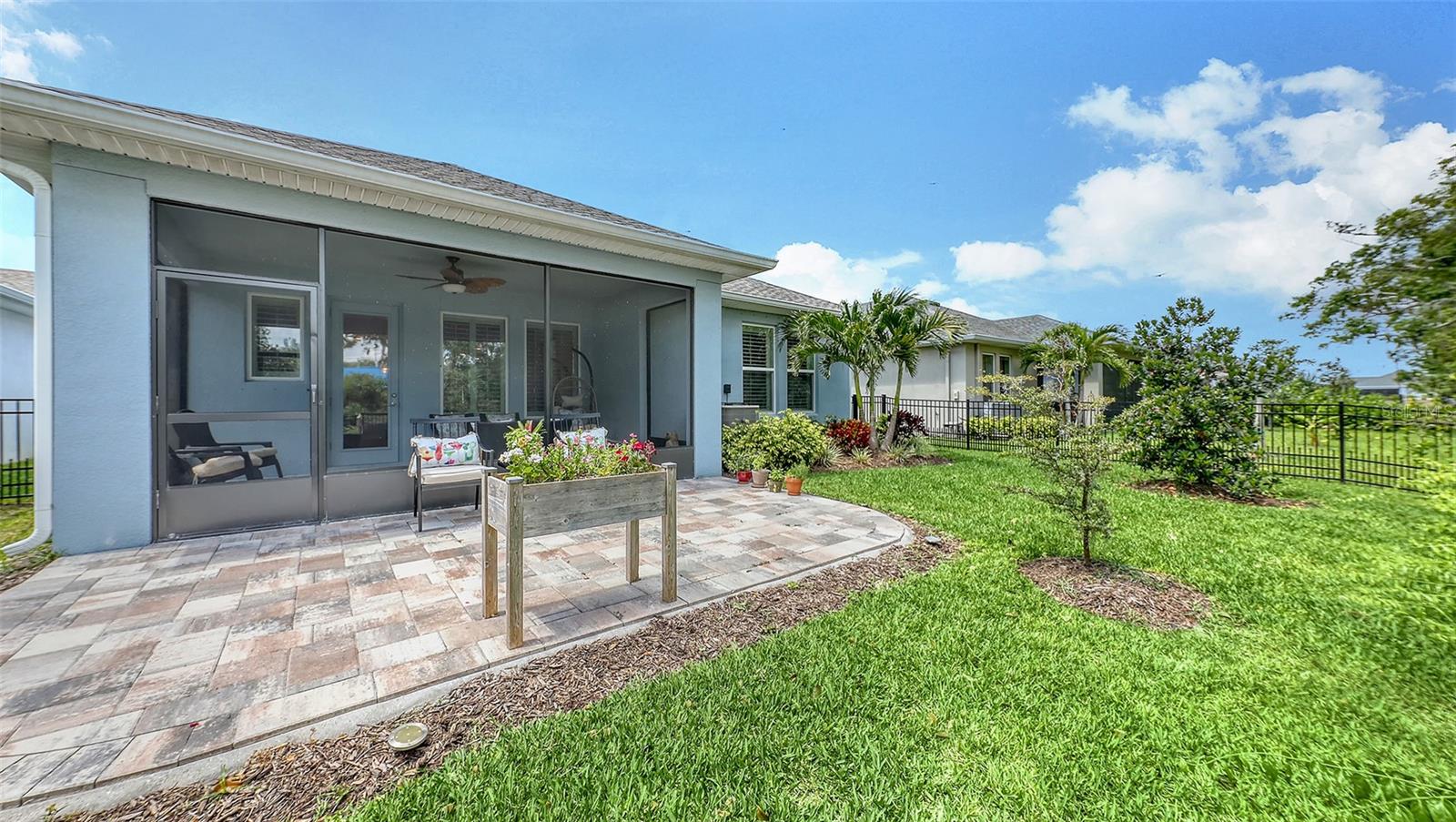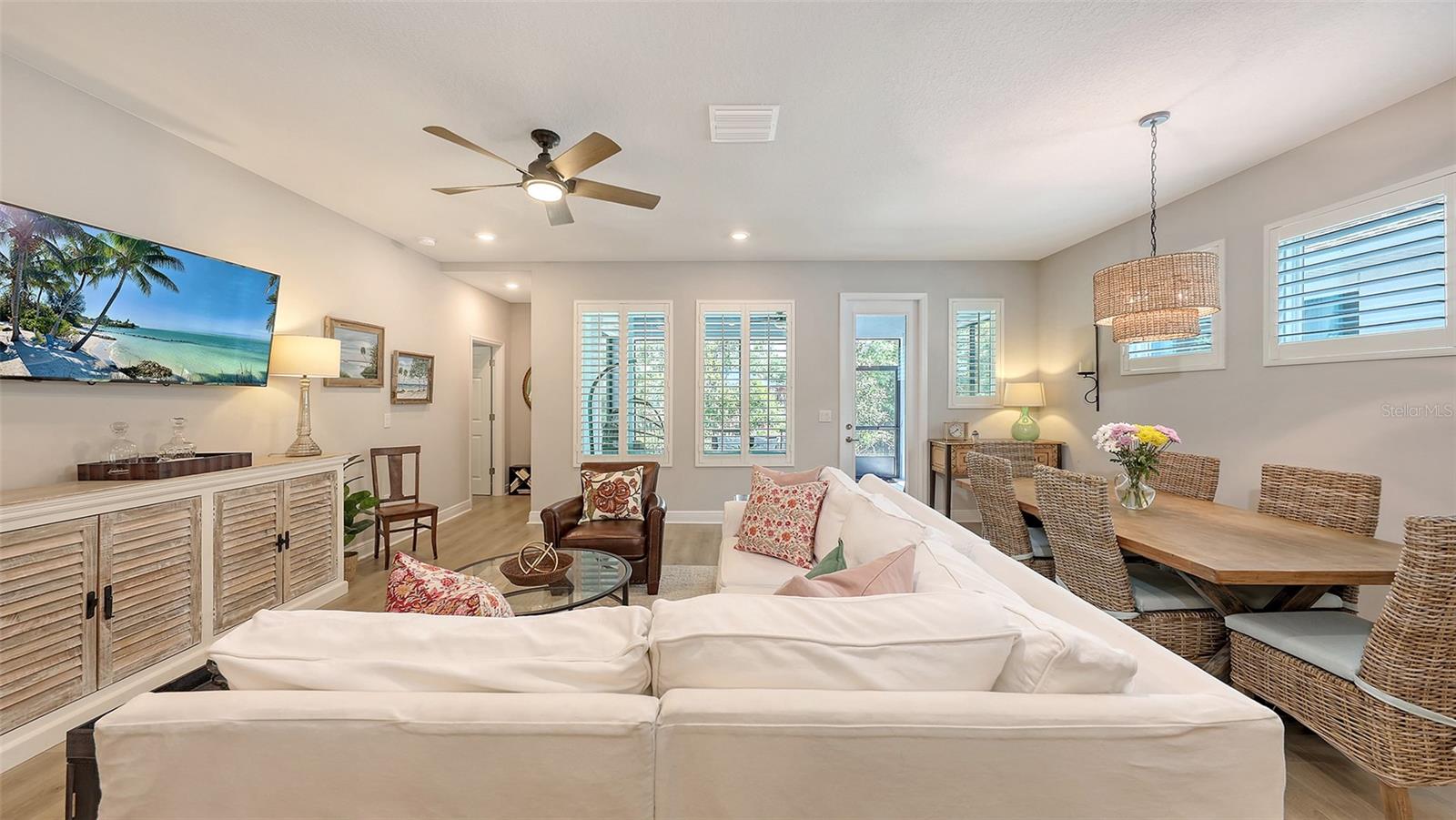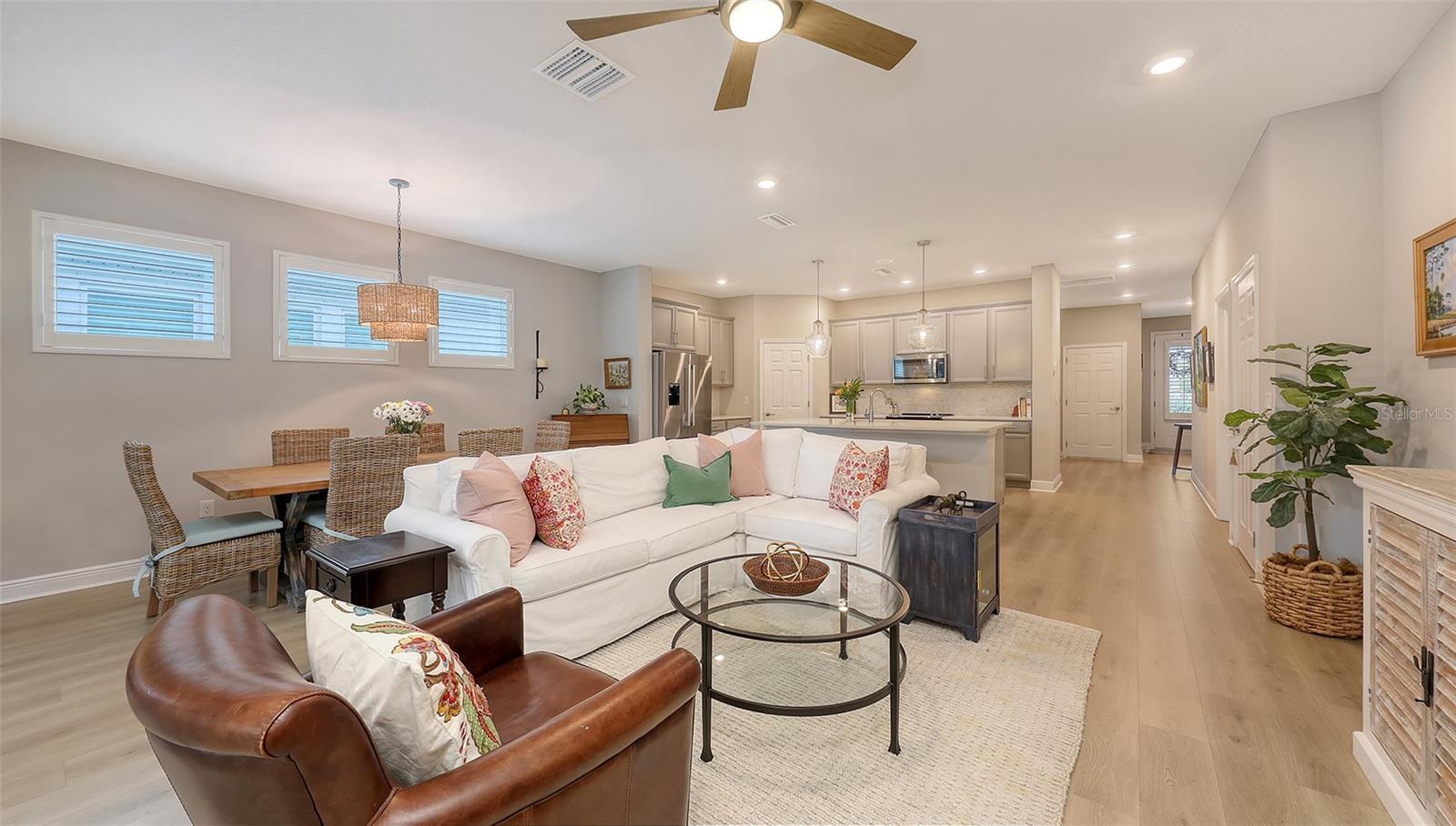 METICULOUSLY UPGRADED 3 Bedroom + Den, David Weekley Home in the desirable North River Ranch community of Parrish. Popular Ensenada floorplan, built in 2022. Thoughtfully enhanced after completion with $40,000 in upgrades. INCREDIBLE DEAL! No need to wait on building. A move-in ready home with TIMELESS FINISHES THROUGHOUT and many enhancements. Open-concept design creates a bright and airy atmosphere with volume ceilings, recessed lighting, upgraded light fixtures, and plantation shutters. Wood-look laminate plank flooring flowing throughout the main living areas. Gourmet kitchen with light gray 42” cabinetry with crown molding, quartz countertops, stylish backsplash, Bosch and Whirlpool stainless steel appliances, walk-in pantry and a large center island with designer pendant lighting. Primary suite with coffered ceiling and a large walk-in closet custom designed by "Tailored Closets," with direct access to the laundry room. Beautiful ensuite bath featuring a dual vanity with framed mirror, private water closet, linen closet and a spacious walk-in shower with floor-to-ceiling tile, frameless glass and built-in niche. Versatile den located off the foyer with double glass French doors can be used as a home office, playroom, studio, media room, 4th bedroom or anything to fit you needs. Two additional bedrooms and a full bathroom are tucked away in a private hallway off the foyer, offering privacy for family or guests. Enjoy outdoor relaxation on the spacious screened lanai, plus an additional stone-paver patio. The FULLY FENCED BACKYARD features wrought iron fencing with puppy pickets. Additional features include a laundry room with built-in cabinets, an LG front-loading washer and dryer, and a two-car garage with epoxy flooring. The master-planned North River Ranch community offers resort-style living with 3 community pools with cabanas, fitness center, miles of walking and biking trails, soccer fields, playgrounds, dog parks, fire pits, bike share program, and multiple clubhouses and social spaces. Conveniently located close to the new Parrish Community Park and the new Publix Plaza and just a short drive to dining, shopping, top-rated schools, and family-friendly activities. Parrish is a rapidly growing area with easy access to St. Pete, Tampa, Lakewood Ranch, Sarasota, and the stunning Gulf Coast beaches. WHY WAIT TO BUILD? You can move into this incredible home today.