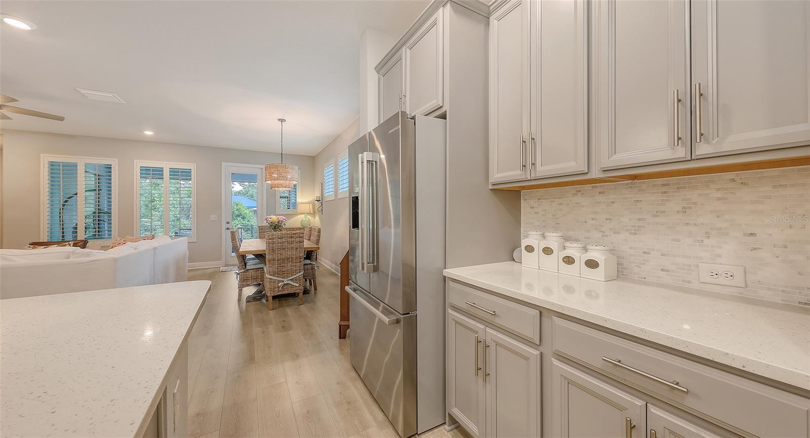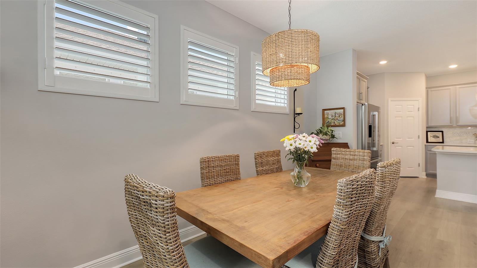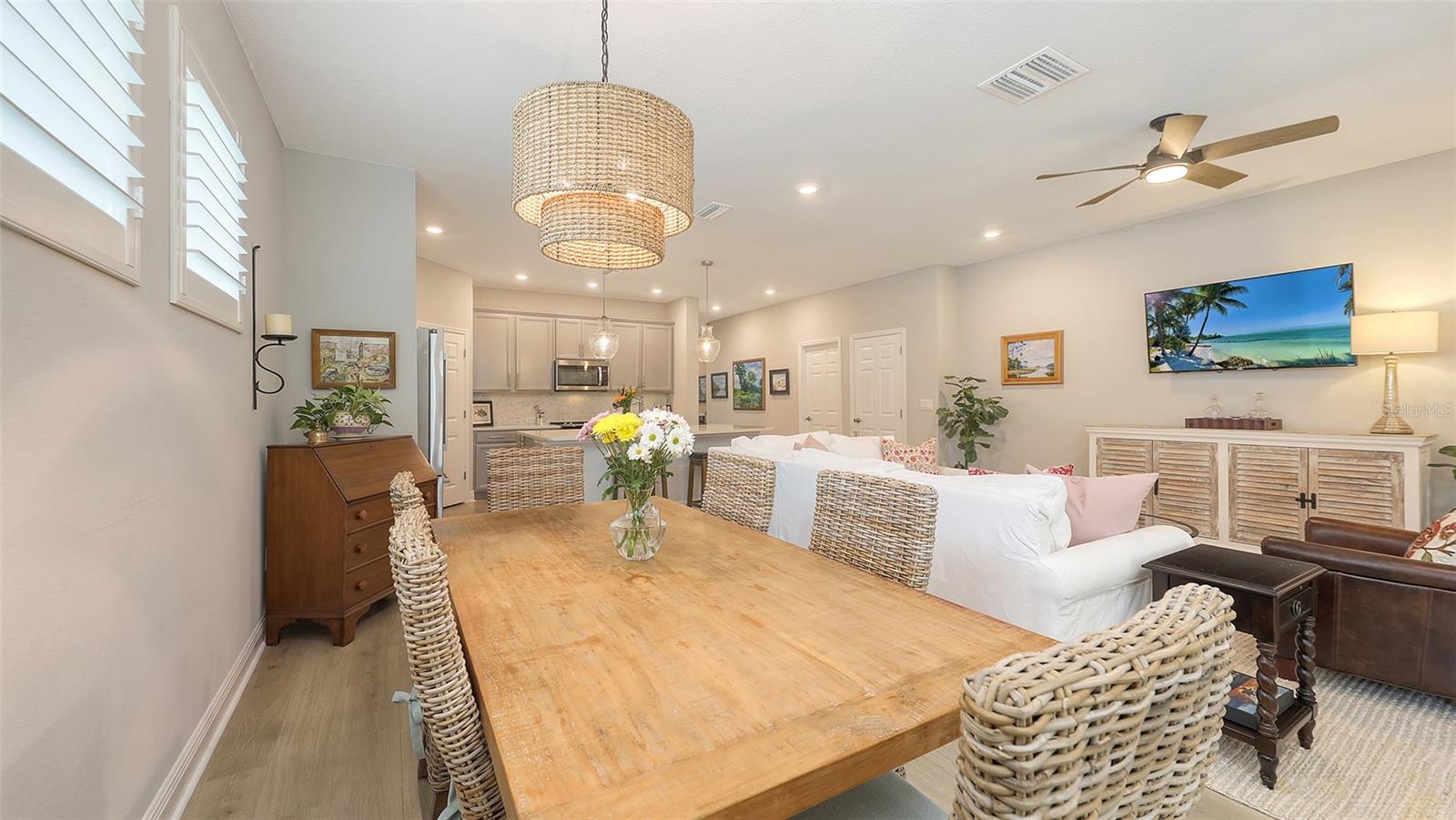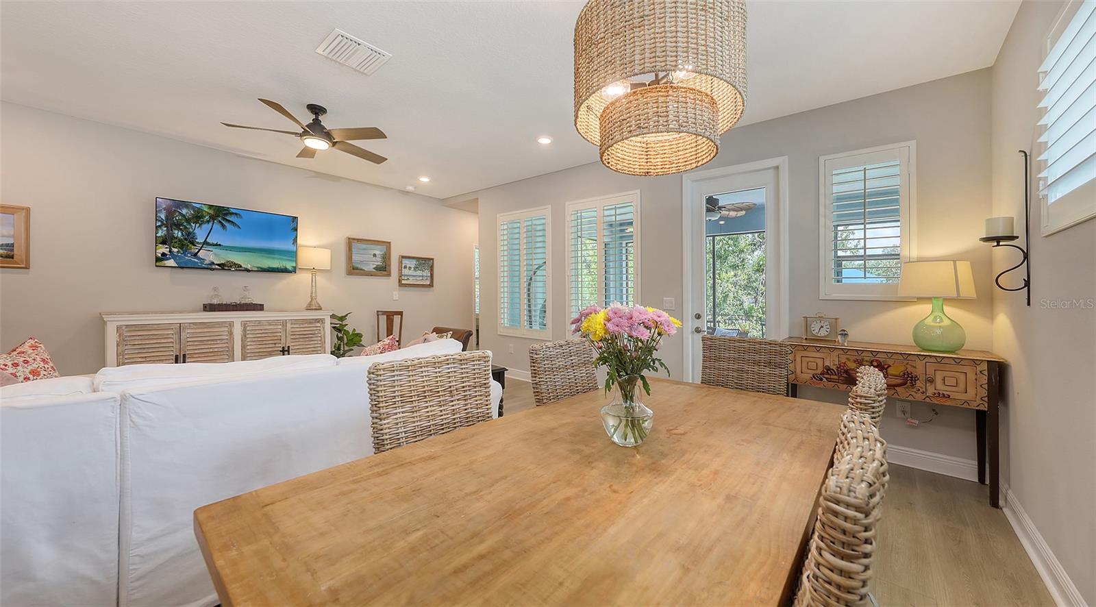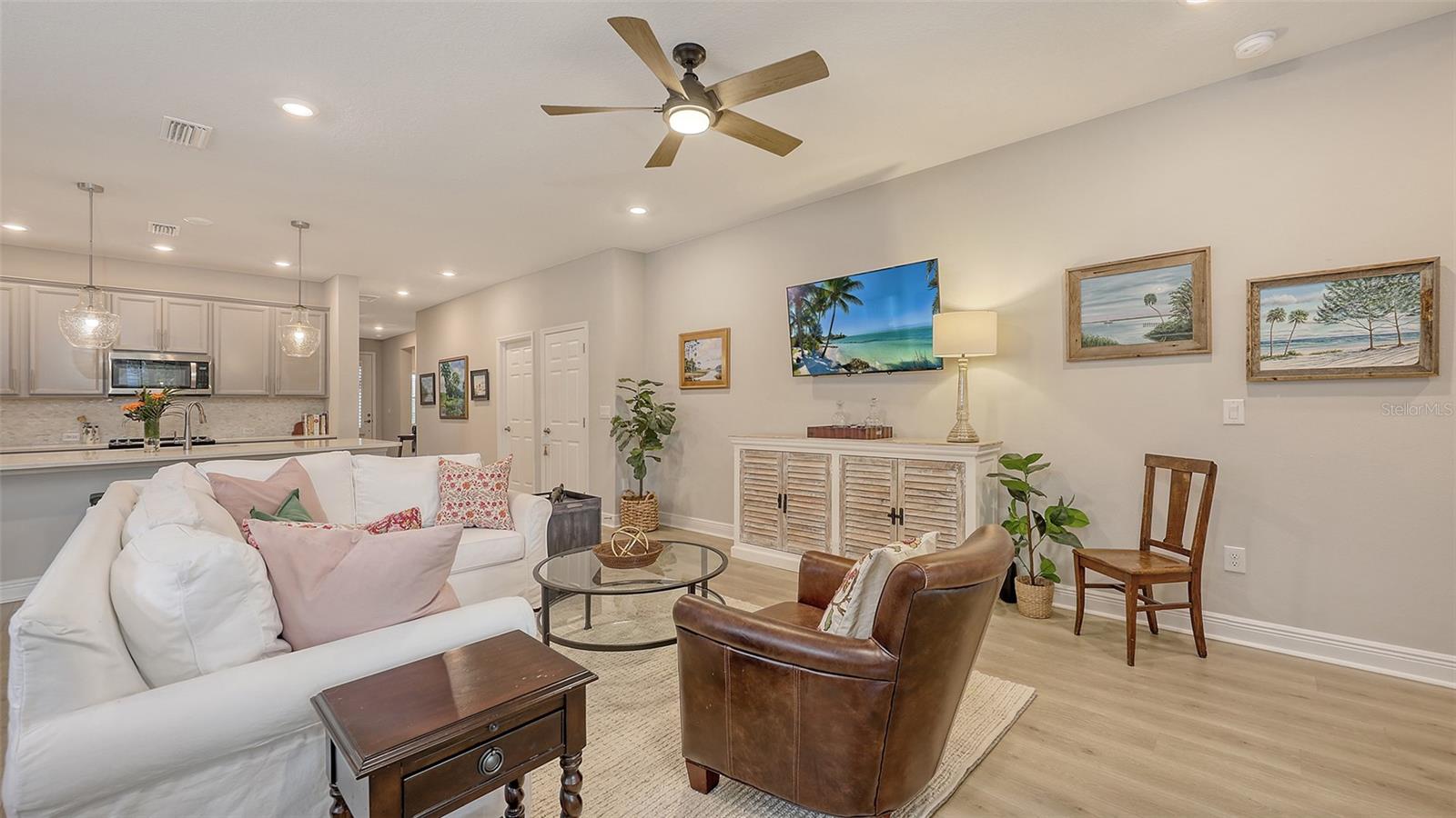 METICULOUSLY UPGRADED 3 Bedroom + Den, David Weekley Home in the desirable North River Ranch community of Parrish. Popular Ensenada floorplan, built in 2022. Thoughtfully enhanced after completion with $40,000 in upgrades. INCREDIBLE DEAL! No need to wait on building. A move-in ready home with TIMELESS FINISHES THROUGHOUT and many enhancements. Open-concept design creates a bright and airy atmosphere with volume ceilings, recessed lighting, upgraded light fixtures, and plantation shutters. Wood-look laminate plank flooring flowing throughout the main living areas. Gourmet kitchen with light gray 42” cabinetry with crown molding, quartz countertops, stylish backsplash, Bosch and Whirlpool stainless steel appliances, walk-in pantry and a large center island with designer pendant lighting. Primary suite with coffered ceiling and a large walk-in closet custom designed by "Tailored Closets," with direct access to the laundry room. Beautiful ensuite bath featuring a dual vanity with framed mirror, private water closet, linen closet and a spacious walk-in shower with floor-to-ceiling tile, frameless glass and built-in niche. Versatile den located off the foyer with double glass French doors can be used as a home office, playroom, studio, media room, 4th bedroom or anything to fit you needs. Two additional bedrooms and a full bathroom are tucked away in a private hallway off the foyer, offering privacy for family or guests. Enjoy outdoor relaxation on the spacious screened lanai, plus an additional stone-paver patio. The FULLY FENCED BACKYARD features wrought iron fencing with puppy pickets. Additional features include a laundry room with built-in cabinets, an LG front-loading washer and dryer, and a two-car garage with epoxy flooring. The master-planned North River Ranch community offers resort-style living with 3 community pools with cabanas, fitness center, miles of walking and biking trails, soccer fields, playgrounds, dog parks, fire pits, bike share program, and multiple clubhouses and social spaces. Conveniently located close to the new Parrish Community Park and the new Publix Plaza and just a short drive to dining, shopping, top-rated schools, and family-friendly activities. Parrish is a rapidly growing area with easy access to St. Pete, Tampa, Lakewood Ranch, Sarasota, and the stunning Gulf Coast beaches. WHY WAIT TO BUILD? You can move into this incredible home today.