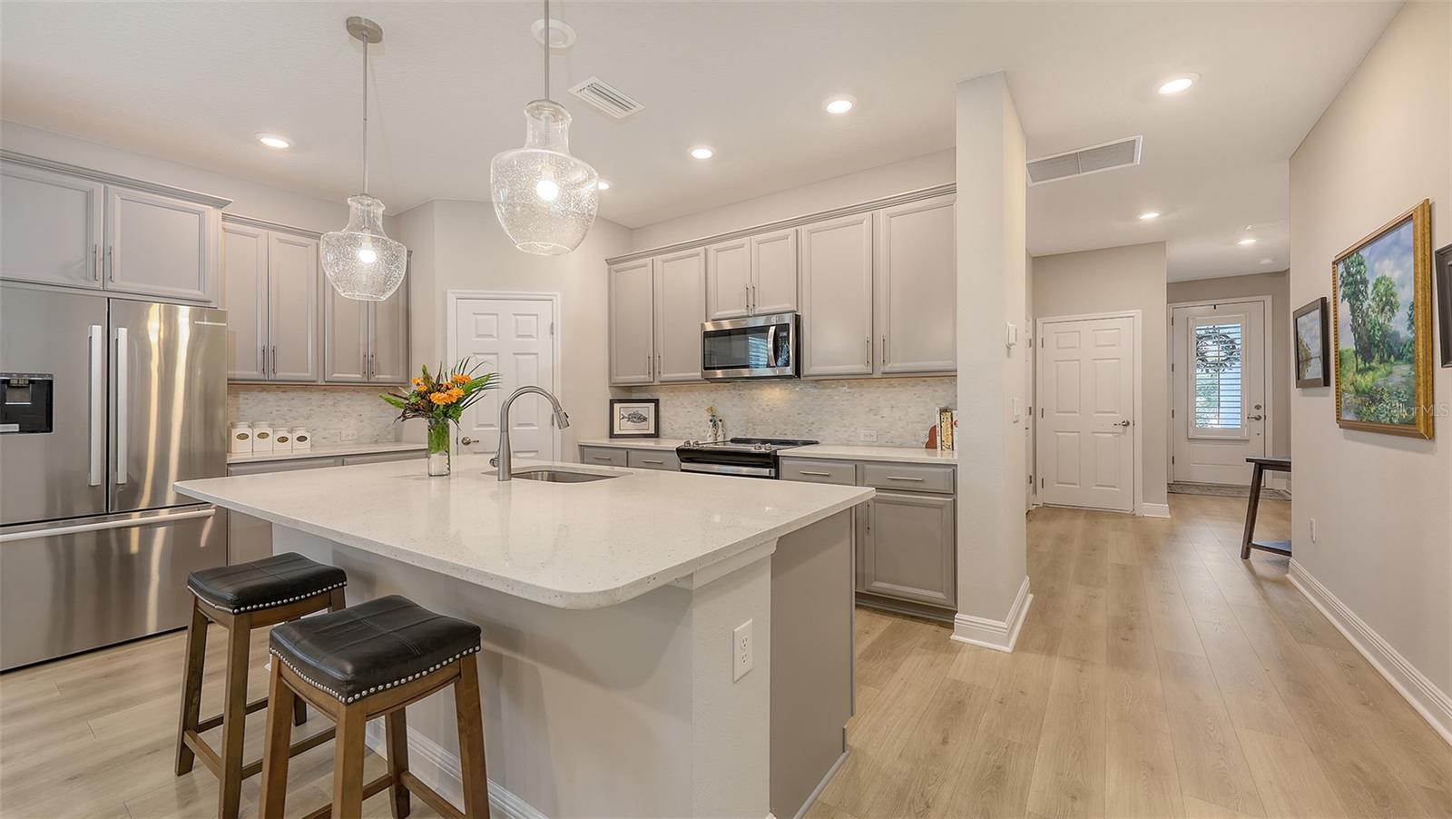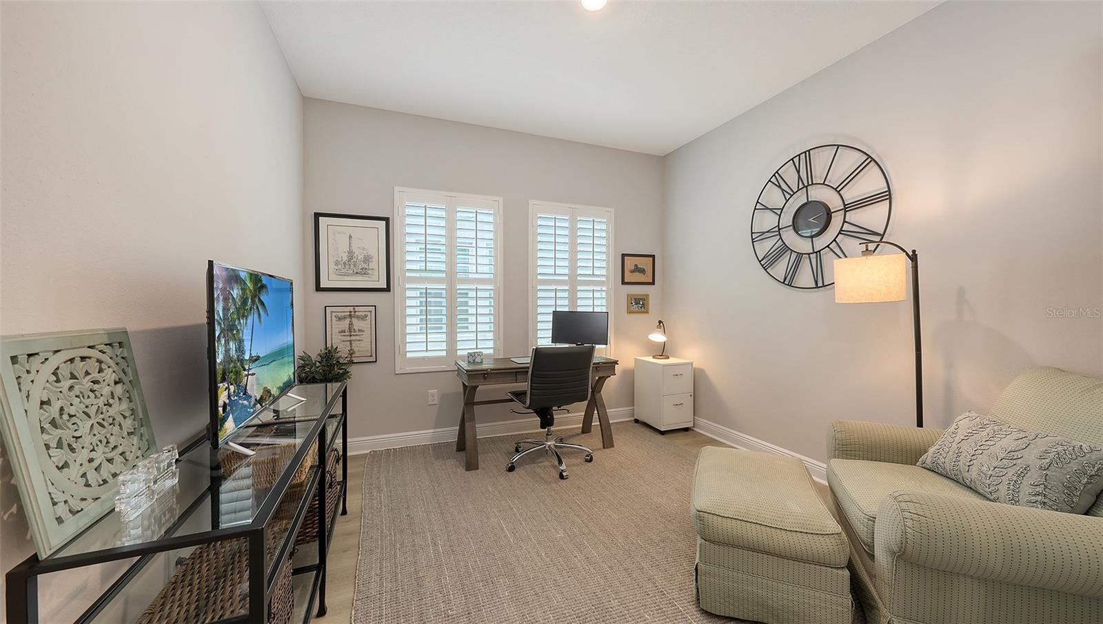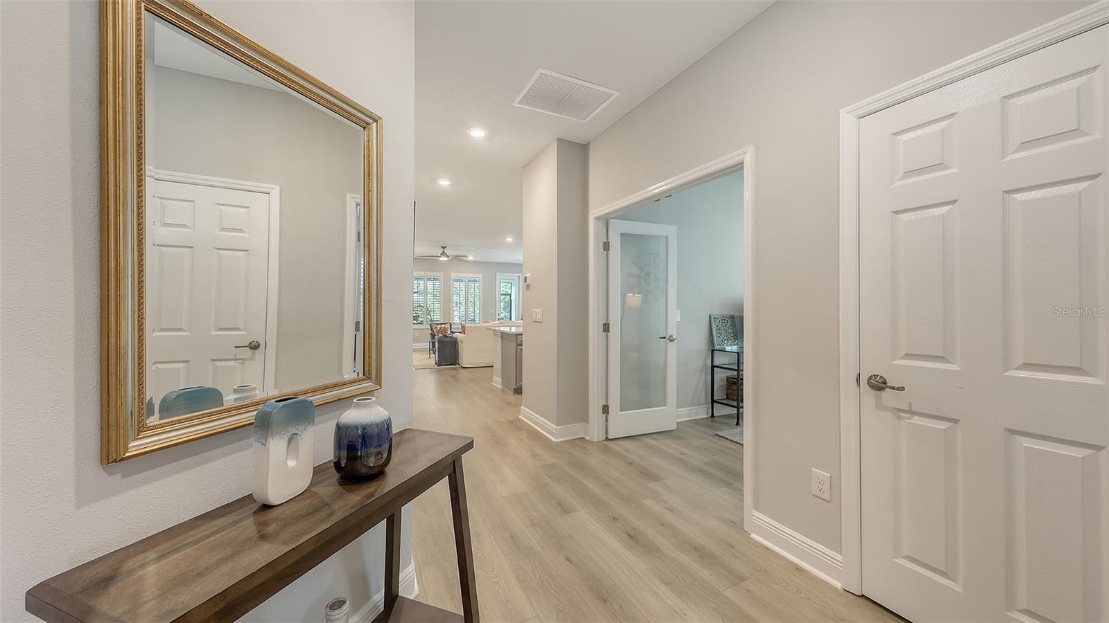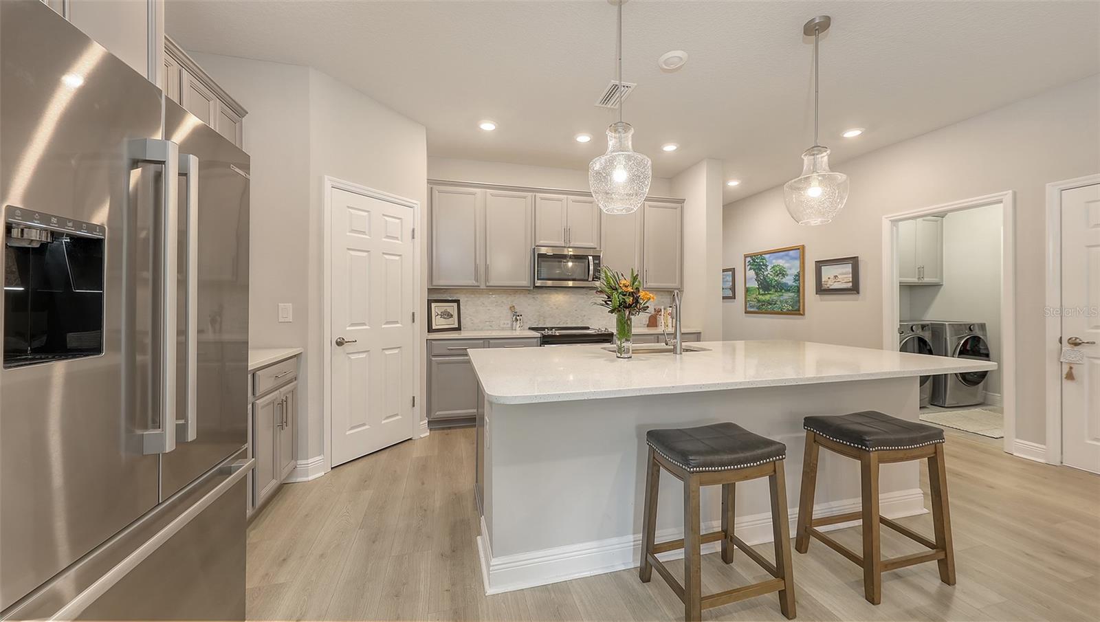 METICULOUSLY UPGRADED 3 Bedroom + Den, David Weekley Home in the desirable North River Ranch community of Parrish. Popular Ensenada floorplan, built in 2022. Thoughtfully enhanced after completion with $40,000 in upgrades. INCREDIBLE DEAL! No need to wait on building. A move-in ready home with TIMELESS FINISHES THROUGHOUT and many enhancements. Open-concept design creates a bright and airy atmosphere with volume ceilings, recessed lighting, upgraded light fixtures, and plantation shutters. Wood-look laminate plank flooring flowing throughout the main living areas. Gourmet kitchen with light gray 42” cabinetry with crown molding, quartz countertops, stylish backsplash, Bosch and Whirlpool stainless steel appliances, walk-in pantry and a large center island with designer pendant lighting. Primary suite with coffered ceiling and a large walk-in closet custom designed by "Tailored Closets," with direct access to the laundry room. Beautiful ensuite bath featuring a dual vanity with framed mirror, private water closet, linen closet and a spacious walk-in shower with floor-to-ceiling tile, frameless glass and built-in niche. Versatile den located off the foyer with double glass French doors can be used as a home office, playroom, studio, media room, 4th bedroom or anything to fit you needs. Two additional bedrooms and a full bathroom are tucked away in a private hallway off the foyer, offering privacy for family or guests. Enjoy outdoor relaxation on the spacious screened lanai, plus an additional stone-paver patio. The FULLY FENCED BACKYARD features wrought iron fencing with puppy pickets. Additional features include a laundry room with built-in cabinets, an LG front-loading washer and dryer, and a two-car garage with epoxy flooring. The master-planned North River Ranch community offers resort-style living with 3 community pools with cabanas, fitness center, miles of walking and biking trails, soccer fields, playgrounds, dog parks, fire pits, bike share program, and multiple clubhouses and social spaces. Conveniently located close to the new Parrish Community Park and the new Publix Plaza and just a short drive to dining, shopping, top-rated schools, and family-friendly activities. Parrish is a rapidly growing area with easy access to St. Pete, Tampa, Lakewood Ranch, Sarasota, and the stunning Gulf Coast beaches. WHY WAIT TO BUILD? You can move into this incredible home today.