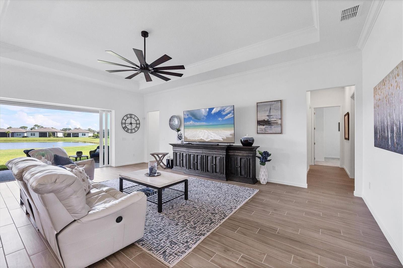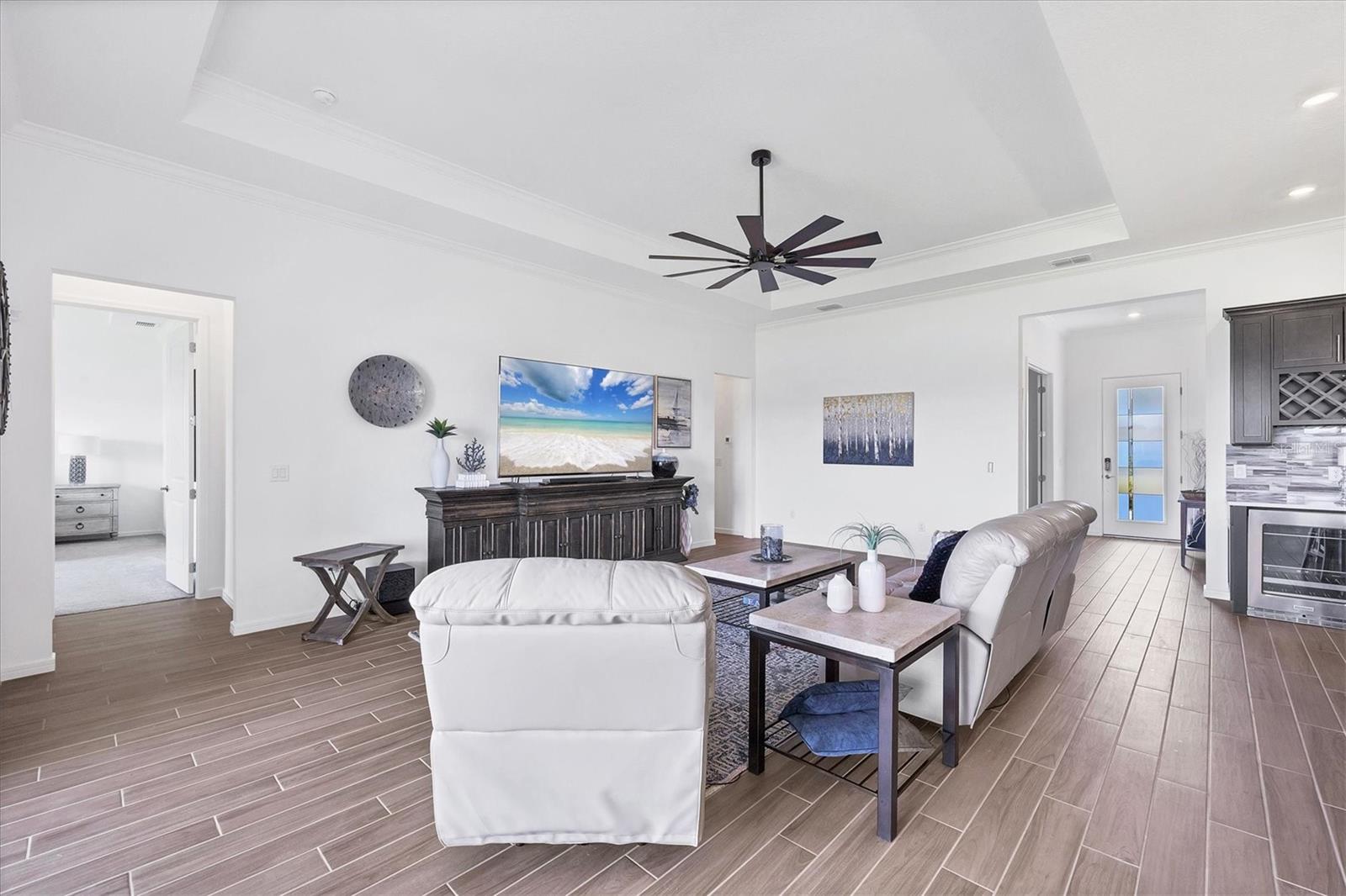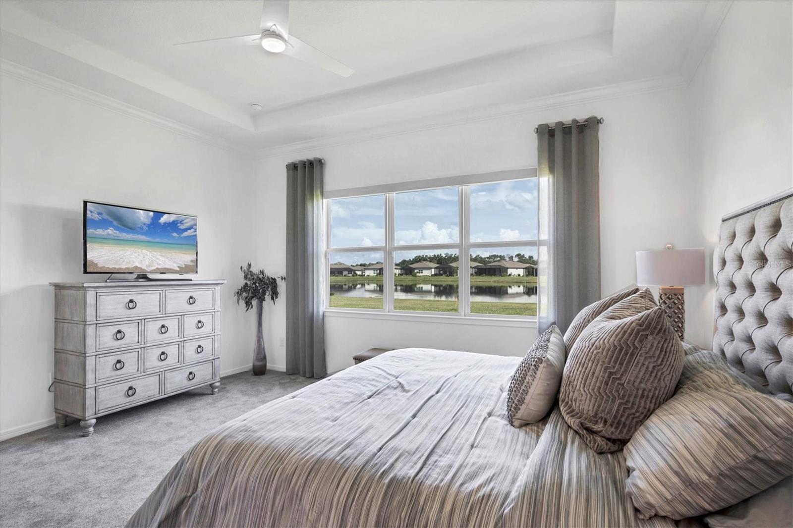 The Buyers’ life changes precluded them from closing on this fully furnished residence, leaving a massive opportunity for the new owner. Offering luxurious living with premium finishes, elegant design, and enhanced safety features, this Stellar floor plan with 3 bedrooms, 3 full bathrooms, and a large den/office provides an open-concept lifestyle. The Stellar floorplan’s soaring ceilings, Impact-rated glass windows, and doors (including the zero-corner sliders), and chef’s kitchen with KitchenAid gas appliances and the prerequisite wine cooler will not disappoint. The HUGE Primary suite, with an oversized walk-in closet and a super walk-in shower with dual heads, including a rain shower, a supply niche, and a bench, is a lifestyle unto itself. The two ensuite guest suites are split for ultimate privacy, and the largest one features a bay window. Additional not-to-be-missed features: Ceiling fans and remote-controlled window treatments throughout; Lanai pre-plumbed for an outdoor kitchen. Remote-controlled wind/solar screen and peaceful big, pond water views with plenty of room for a private pool if so inclined. Located in the 55+ Del Webb Bay View community with Resort-style amenities in a secure gated community located 1.5 miles from I-75 and I-275 for easy commuting. Kindly note that this is an estate, and the home was only used for 5 months. All warranties are transferable. Furnishings included for the convenience of the estate but will be removed at the buyer's request. Seller will cover all closing costs with an acceptable contract. Do note that the home was not homesteaded and that the CDD fee is included in the tax amount.
