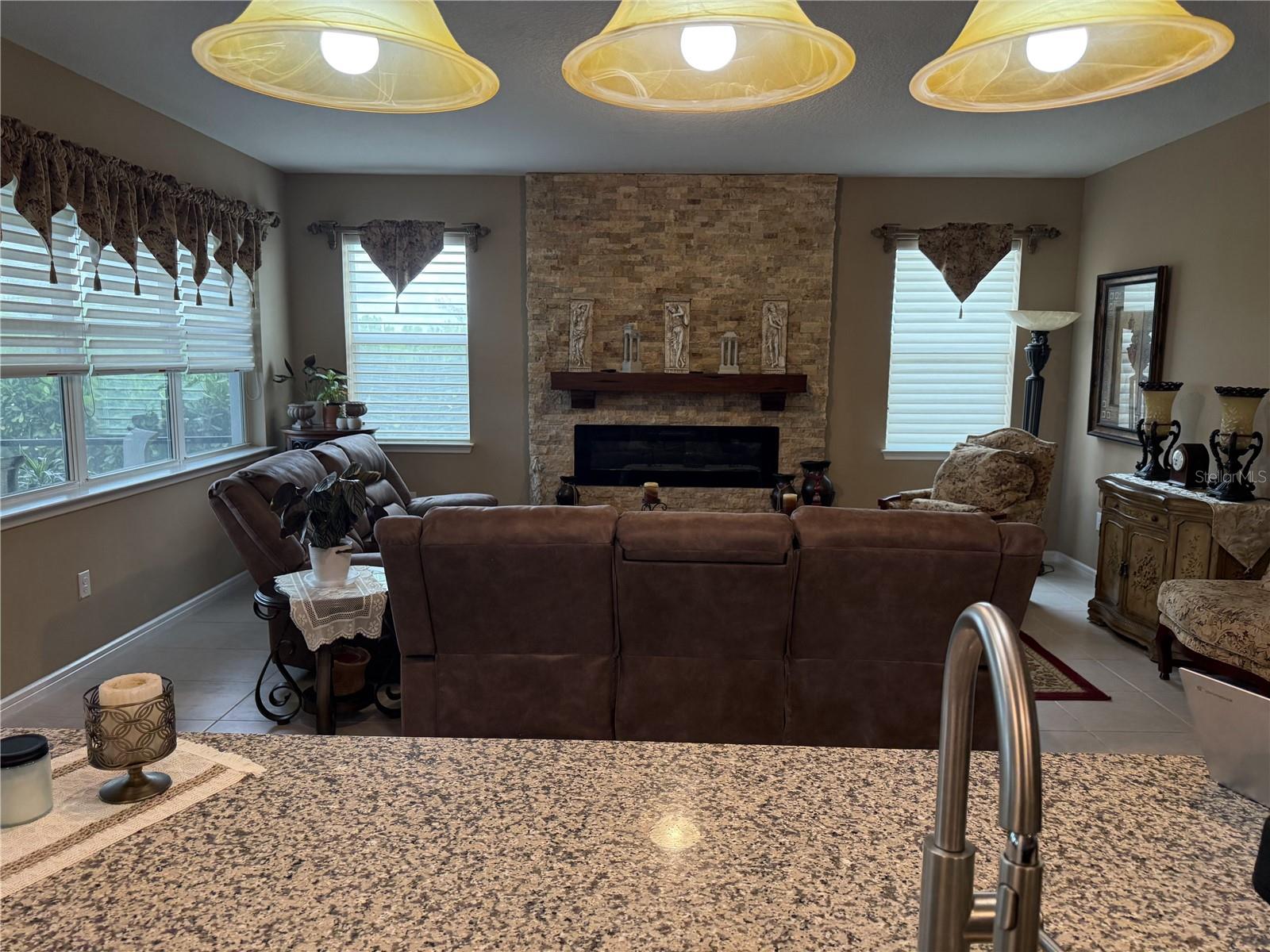 Discover this beautifully appointed 2-bedroom, 2-bathroom single-family residence located in the gated 55+ community of Del Webb. Perfectly positioned on a premium private corner lot, this home offers a serene retreat, with an abundance of privacy and all the benefits of a vibrant, active adult lifestyle. Step inside this charming home featuring a versatile den, perfect for a home office, reading nook, hobby space, or extra bedroom. The den adds flexible living space to suit your lifestyle, offering privacy and comfort while staying connected to the heart of the home. Continue inside to a bright and airy open-concept living space highlighted by a decorative hand-crafted stone fireplace—a stunning focal point that brings charm to the living room. The chef-inspired kitchen features gleaming granite countertops and custom backsplash. The kitchen island serves as the centerpiece, with ample countertop space for culinary creations and a casual spot for friends and family to gather. Adjacent to the kitchen is a cozy dining area with a window and sliding doors leading to the relaxing lanai. Enjoy year-round comfort on the screened-in covered lanai, surrounded by lush landscaping that enhances the home’s secluded and peaceful setting. The spacious 2-car garage with an extended area provides extra storage or workspace, while built-in hurricane shutters around the home give you valuable peace of mind. The luxurious primary suite includes a spa-like ensuite bath and a walk-in closet, while the guest bedroom and bath create a welcoming space for visitors. Resort-style community amenities include: an elegant clubhouse and on-site restaurant for social gatherings. A sparkling resort-sized swimming pool perfect for relaxing afternoons, state-of-the-art fitness center, tennis, pickleball courts, and a dog park for furry friends. Enjoy the perfect blend of comfort, community, and carefree living in this vibrant 55+ neighborhood. Conveniently located near shopping, dining, and entertainment, this home offers the perfect blend of comfort, elegance, and an active social lifestyle in one of the area’s most sought-after communities.