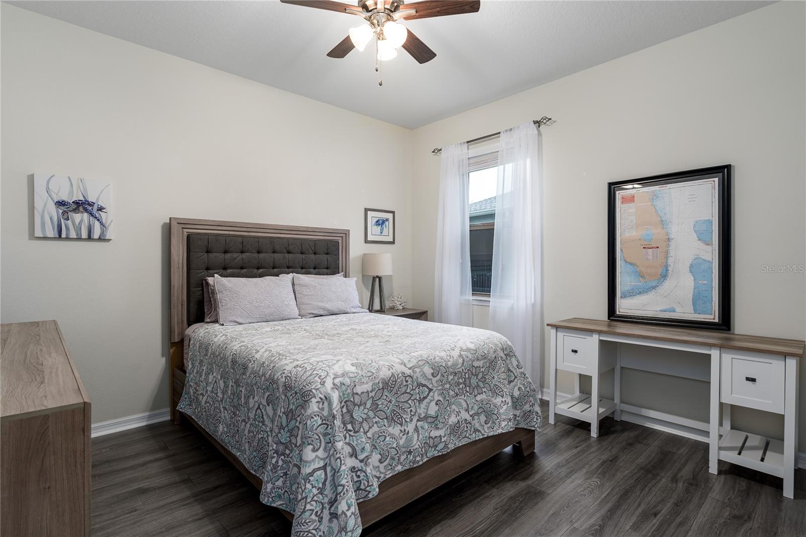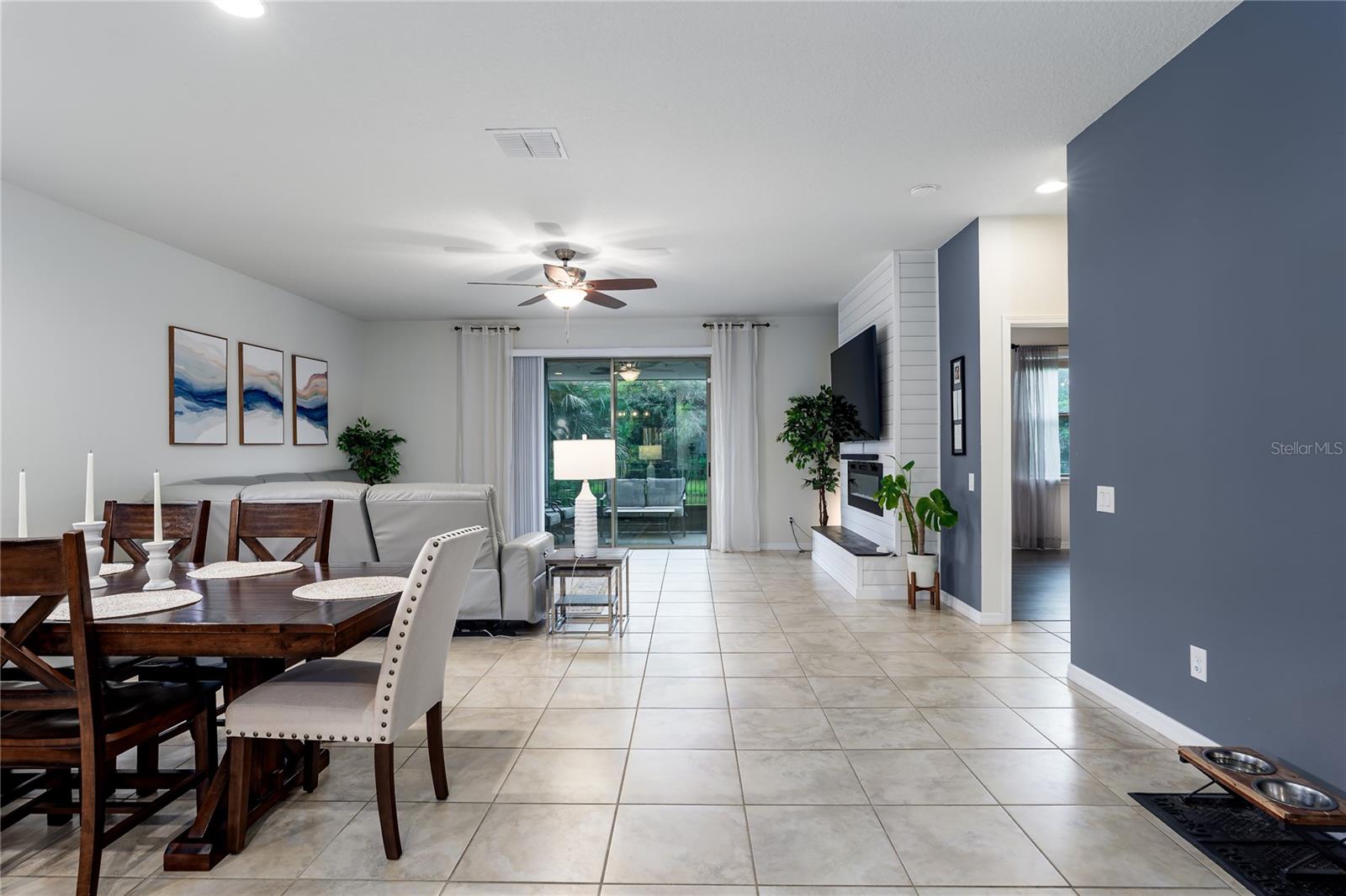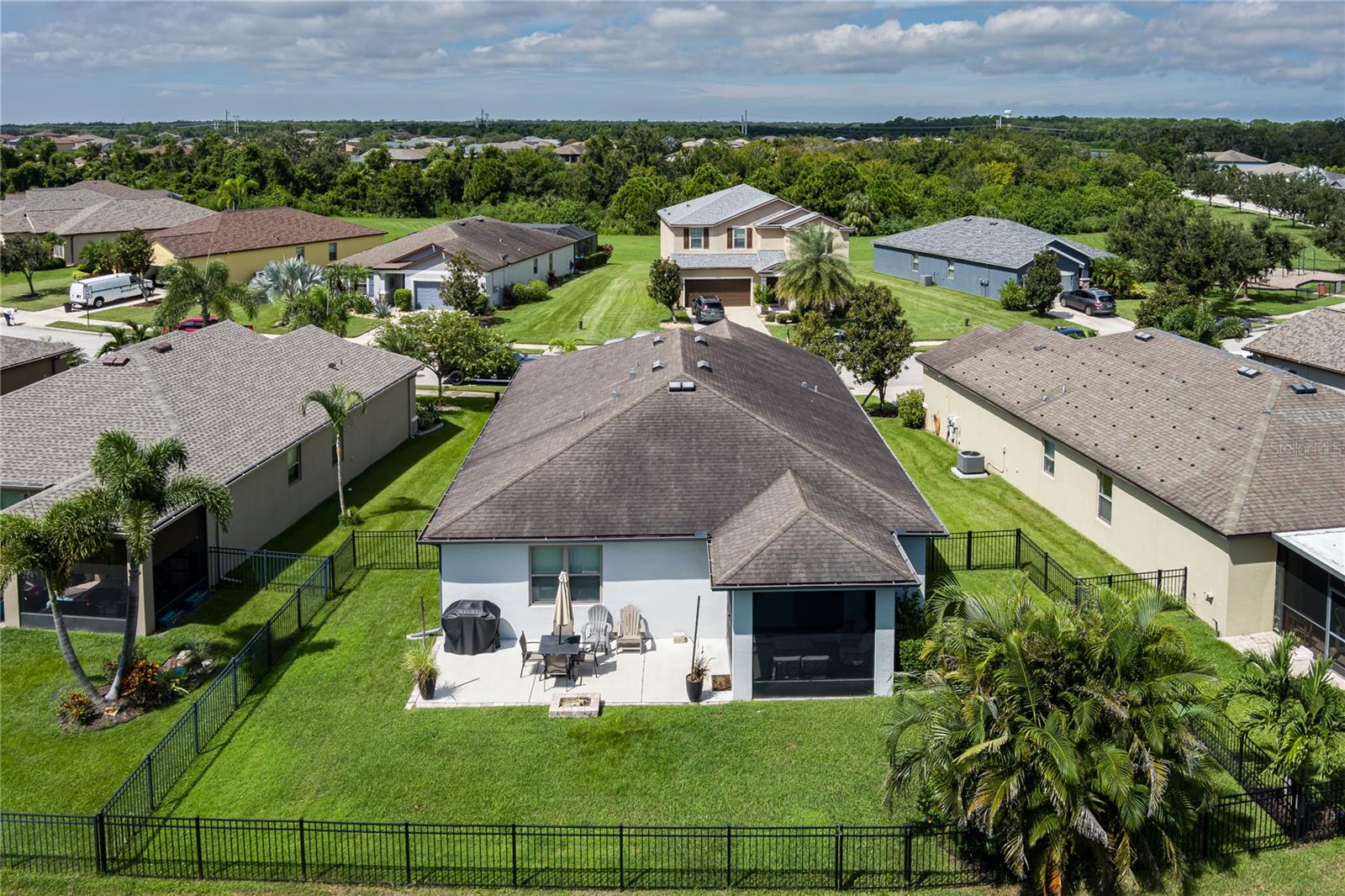 New Price! WELCOME HOME to 5716 110th Avenue E, a well-appointed 2014-built single-family residence located in the desirable Harrison Ranch community, centrally positioned in Parrish, FL. Offering 2,144 square feet under air, this 3-bedroom, 2-bathroom, 2-car garage home features a newly painted exterior (2025) and meticulously maintained landscaping (added 2025), providing excellent curb appeal. The interior layout includes a recently refreshed split floor plan (painted 2023), two spacious guest bedrooms with shared bath, a versatile den/office (suitable as a potential fourth bedroom), and a primary suite with an upgraded master bathroom (2024). The main living area is designed for flexibility and comfort, featuring an open-concept kitchen, dining, and living space. The kitchen is equipped with a large island, granite countertops, decorative backsplash, stainless steel appliances, and enhanced cabinetry. The living area offers an electric fireplace set against custom shiplap and provides access via a large slider to the covered lanai, open patio, and a fenced yard with water views. Additional features include a built-in 'mud' area adjoining the indoor laundry and custom shelving in the garage. Community amenities comprise over five miles of walking trails, swimming pool, tennis courts, basketball and pickleball courts, park, playground, fitness center, clubhouse, and reclaimed water irrigation. Conveniently situated near acclaimed schools, dining, and shopping venues, this property delivers an optimal blend of comfort, accessibility, and quality living. Schedule your showing today!