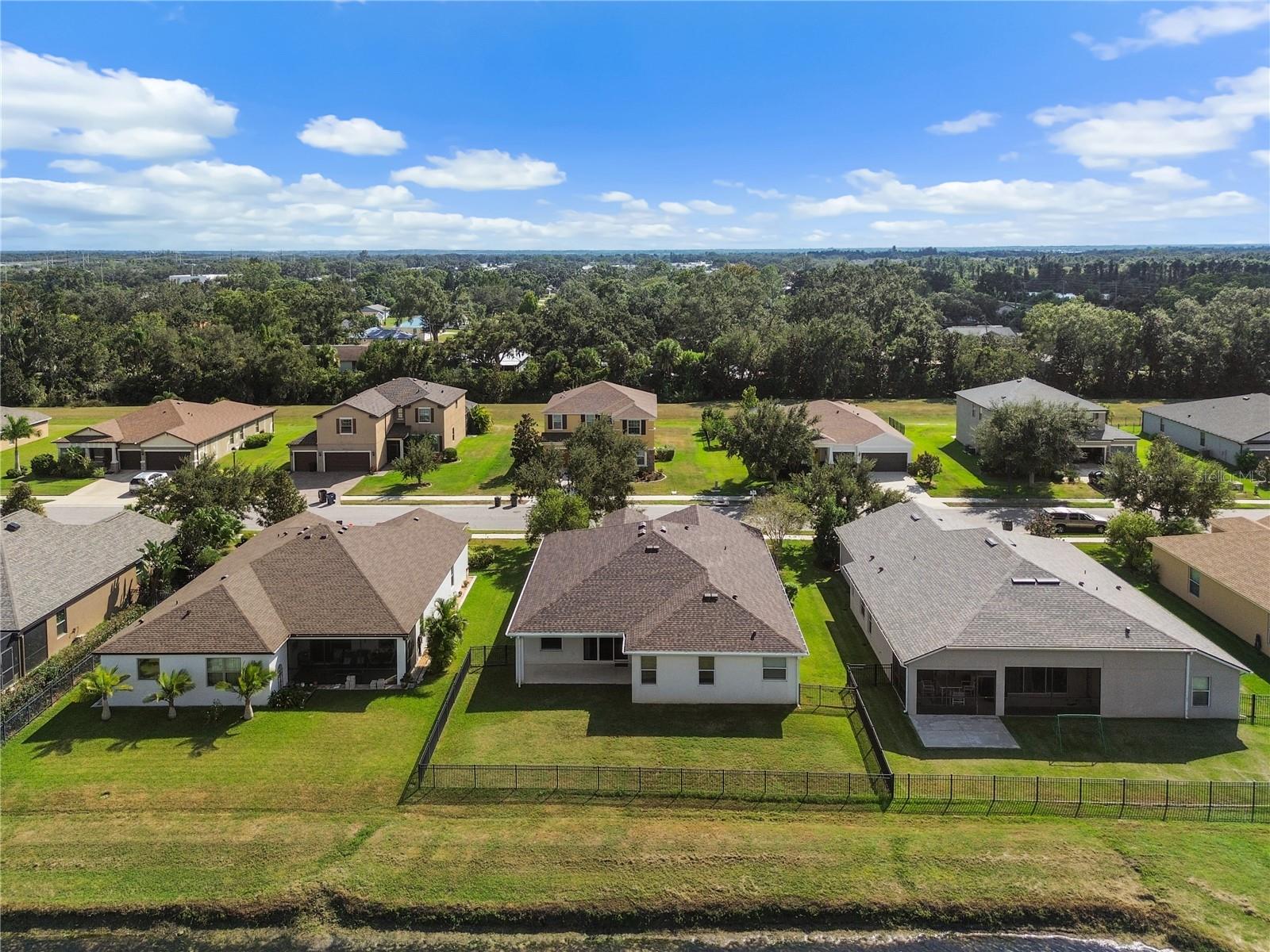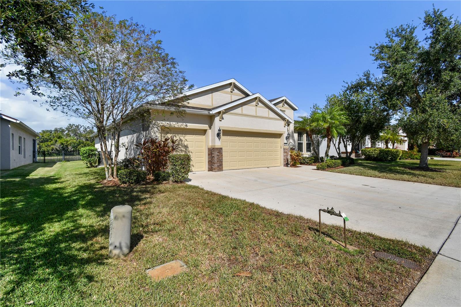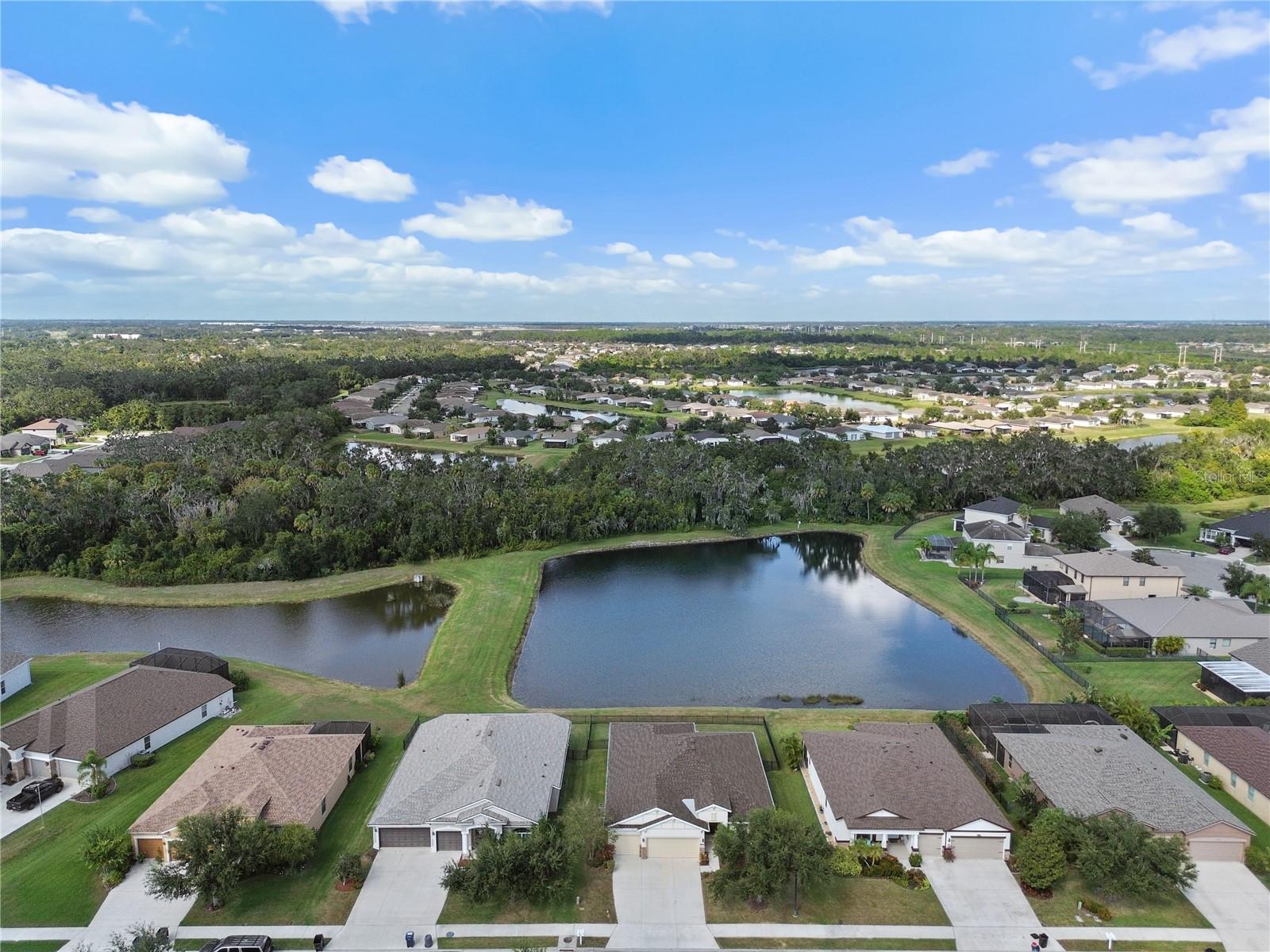 Incredible value for extra garage space with this Trentino Reserve series home in Harrison Ranch. 4 bedroom 2 bath and 3 car garage. Enter Harrison ranch the secret way and find this beautiful home tucked on a culdesac street and perfectly positioned with a Eastern facing view over the water. Great suns rises in this fenced in backyard. Great elevation style with stone facing. Over 2,400 sqft with high volume ceilings, large living and dining room combo but can be any space you want. Great room is connected to the kitchen with an eat in space, a large kitchen island, plenty of kitchen cabinetry, workspace, and is great for entertaining. Sliders overlook the back porch and water view. Main bedroom ensuite with shower and separate tub. Freshly painted, there is nothing to do but move in. Harrison Ranch- home to one of best communities in Parrish. Established, appealing, active, and outfitted with all the amenities for your enjoyment. Plunge into the Lap pool, scamper across fields galore, hit the trails, pump it at the fitness center, stretch your brain in the game room, gather at the clubhouse, hang around the playground, hoop it up and serve it hard at the courts, and find your FUN on the community CALENDAR of activities. Ask around and you'll hear owners all saying the same thing. They love their community. Schedule a showing today!