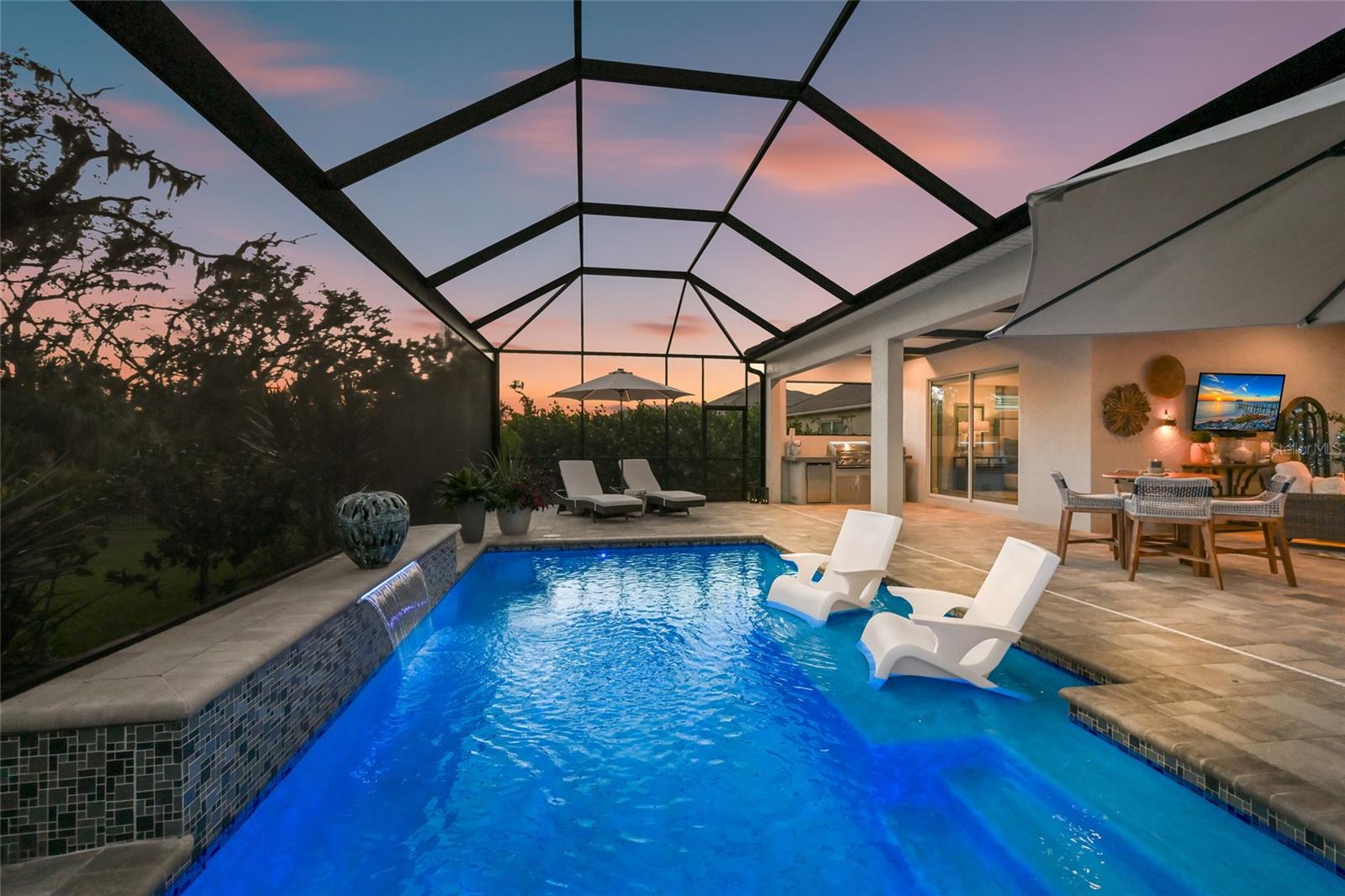 Welcome to this exquisitely customized and designed Santa Maria Model, perfectly situated within the secure, gated boutique community of The Reserve at Twin Rivers. This luxurious four-bedroom, three-bathroom home with two primary suites and an oversized four-car garage exudes sophistication from the moment you arrive, featuring striking curb appeal enhanced by mature landscaping, a long pavered driveway, and a modern custom elevation. Step inside to discover a warm, inviting atmosphere elevated by designer finishes, including elegant crown molding, wood-look tile flooring, and no carpet throughout the home for a sleek, cohesive aesthetic. Unobstructed preserve views are visible from nearly every window, creating a constant connection to nature. The open, flowing floor plan is ideal for both relaxed living and grand entertaining, offering multiple distinct gathering spaces. The great room impresses with a custom woodwork cathedral ceiling, a statement chandelier, a floor-to-ceiling stacked stone electric fireplace, and expansive pocket sliding doors that open effortlessly to the lanai. The dedicated dining room glows with natural light beneath a custom wrought iron chandelier and flows seamlessly into the gourmet kitchen. A chef’s dream, the kitchen features a massive 13-foot quartz island with updated pendant lighting, high-end appliances including a new glass Bespoke refrigerator, induction cooktop, and double steam microwave convection oven combo, all complemented by a sleek designer touch faucet. A charming eat-in nook framed by a bay fishbowl window offers beautiful preserve views while dining. The primary retreat is a private haven, complete with tall tray ceilings, sliding glass doors, and a picture window overlooking the sparkling pool and lush preserve. The luxurious en-suite includes two custom walk-in closets, dual vanities, a soaking tub, and a tiled walk-in shower. A private guest wing hosts two spacious bedrooms with new top-of-the-line LVP flooring and a large shared bath, while the club/flex room at the rear of the home—with full pocket doors and a private bath—offers versatile living options and direct access to the lanai. The true centerpiece of this home is the resort-style outdoor oasis. Three sets of pocket sliding doors create a seamless indoor-outdoor living experience. The expansive covered area features a custom-stained wood beam ceiling with dual designer fans, a full outdoor kitchen, and a sparkling saltwater pool with a new color-changing lighted waterfall. A 40-foot panoramic clear-view screen perfectly frames breathtaking views of majestic Spanish oaks and the beautifully fenced backyard, offering total privacy and tranquility. Every detail of this home has been meticulously curated, blending luxury, comfort, and natural beauty. Conveniently located near shopping, downtown St. Pete, Lakewood Ranch Waterside, Tampa and Sarasota airports, award-winning beaches, and UTC Mall—all with no CDD fees—this property delivers an unmatched Florida lifestyle in one of the area’s most sought-after communities.